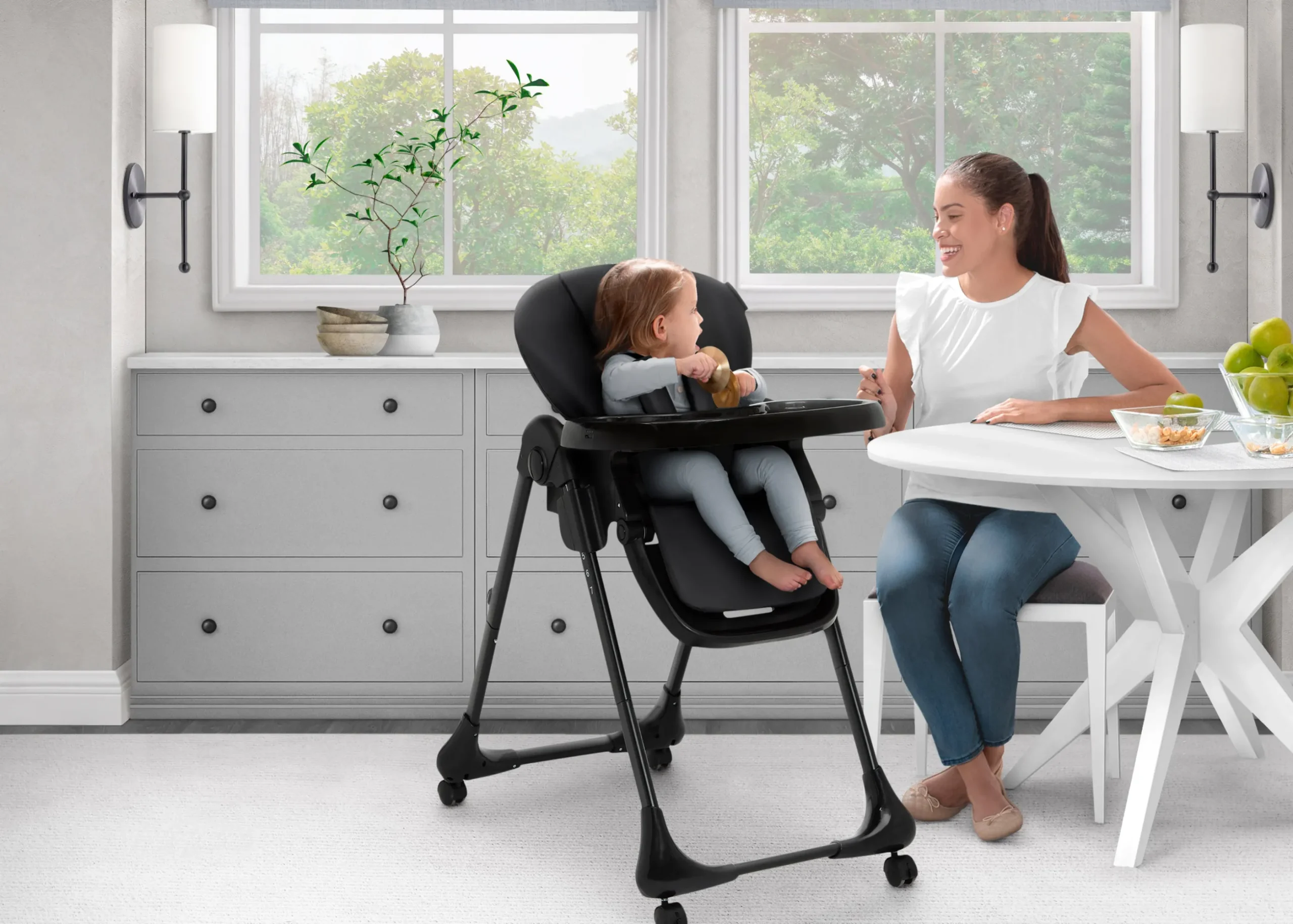The monochromatic design and streamlined profile of this high chair makes it the perfect complement toyour home décor