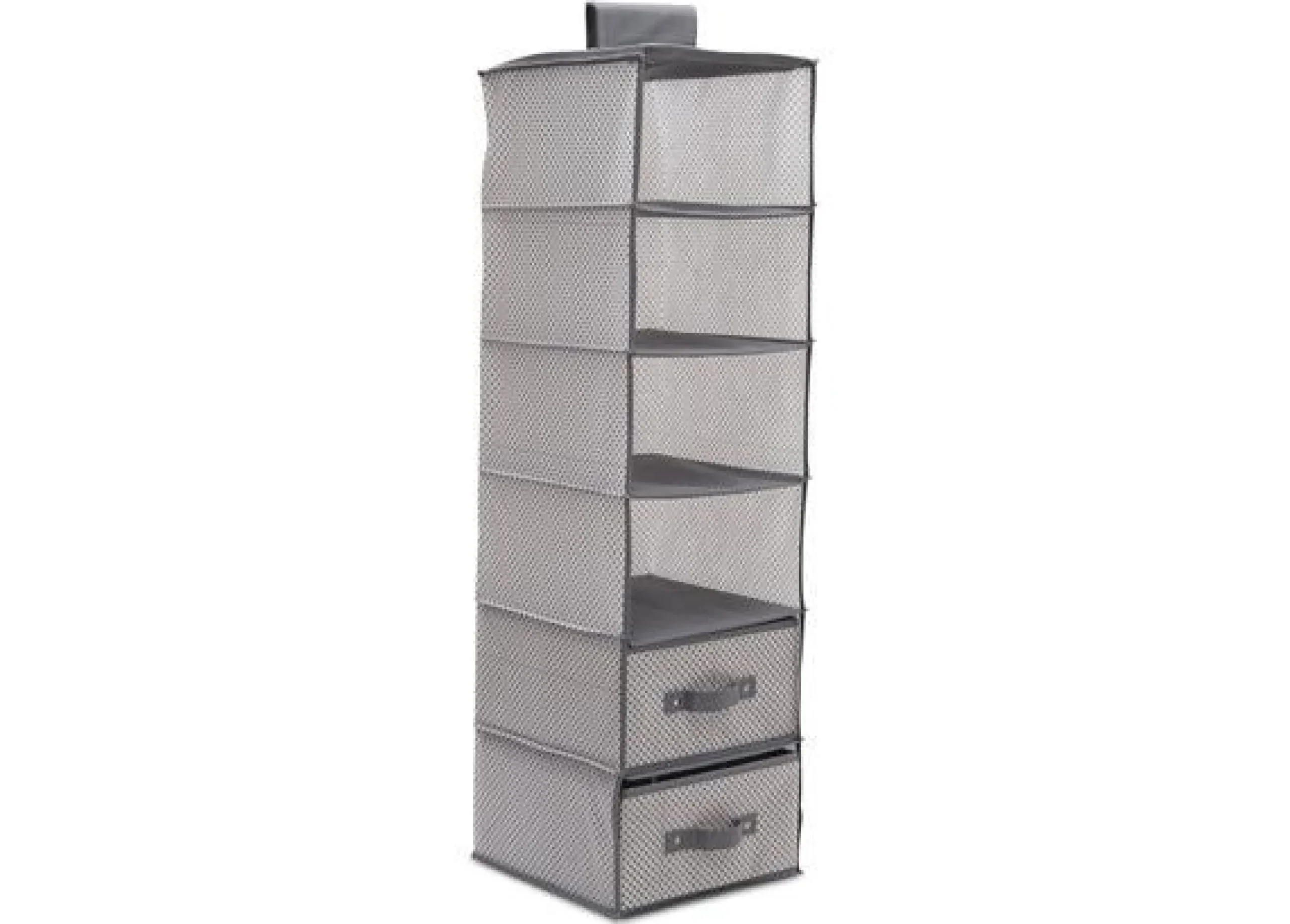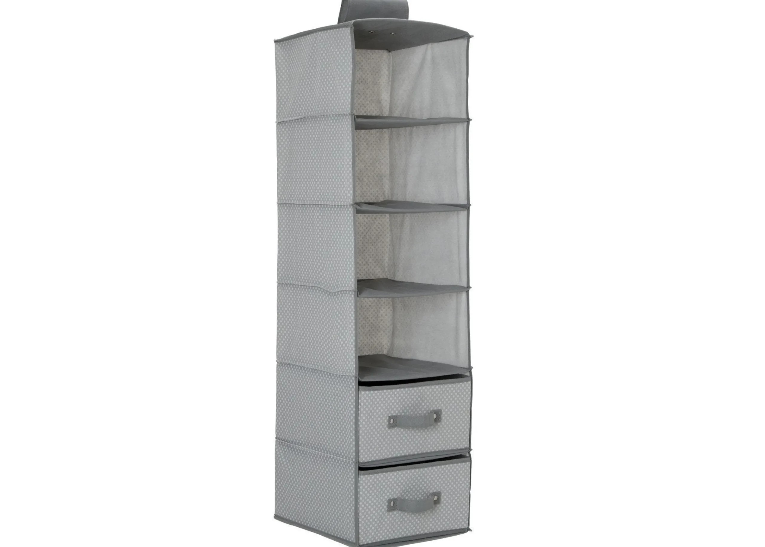 Welcome a world of order with this 6-Shelf Hanging Storage Unit with 2 Drawers from Delta Children! A smart and durable solution to make sense out of discarded toys, blankets or bodysuits in your baby’s nursery, this handy storage piece comes with two removable drawers and hook and loop top that easily attaches to most closet rods.