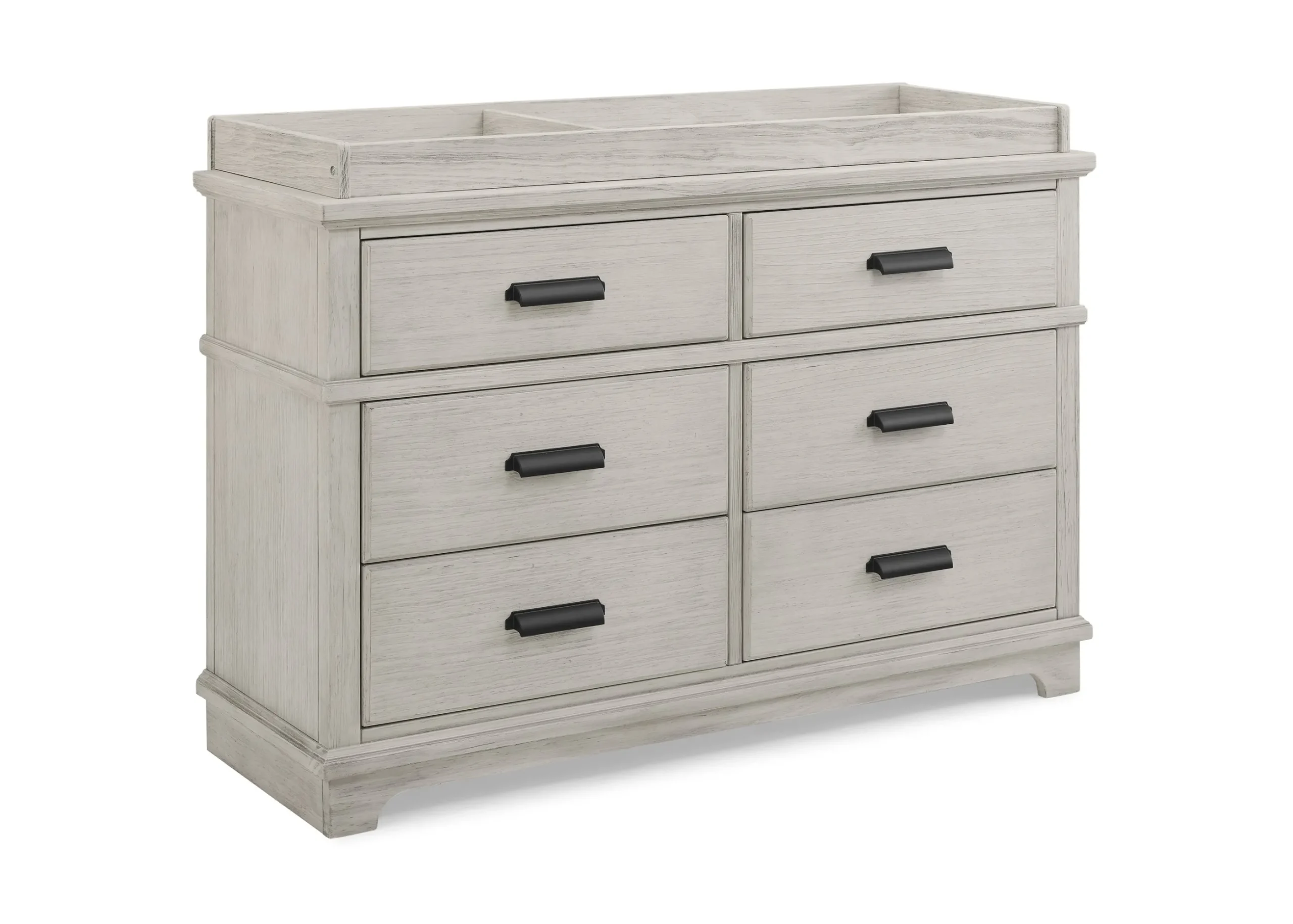 The Asher 6 Drawer Dresser with Changing Top and Interlocking Drawers by Simmons Kids adds modern farmhouse charm to any baby nursery or kids’ bedroom. A softy textured, hand applied finish and sleek matte black metal cup handles offer an updated take on rustic design. The Asher 6 Drawer Dresser includes a removable changing top that creates the perfect space for diaper changing now and is easily detachable, so you can create a more grown-up space later. Pair this dresser with the Simmons Kids Asher 6-in-1 Convertible Crib for a coordinated look. Given the hand applied nature of this dresser’s finish, variations in the wood are to be expected and celebrated. For your child’s safety, this dresser is outfitted with an interlocking drawer system that limits the number of drawers that can be opened at one time. Plus, it’s GREENGUARD Gold Certified, which means it’s built to contribute to cleaner air for a healthy home.This Simmons Kids dresser is tested to meet the current requirements of ASTM F2057, the mandatory CPSC safety standard that protects young children from furniture tip-over incidents. For your children’s safety, only purchase dressers that comply with this standard. For additional security, Simmons Kids strongly recommends that all dressers in your home be anchored; all Simmons dressers include a wall anchor. To learn how to properly secure your dresser, please see the product assembly instructions or visit our website.
