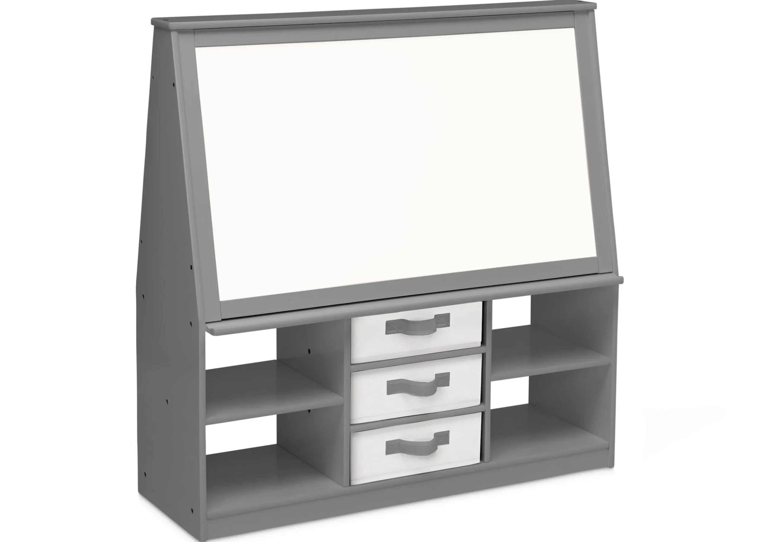 This kids’ easel features 3 cubbies with fabric bins and 4 open shelves to provide plenty of storage for chalk, markers, books, toys and more