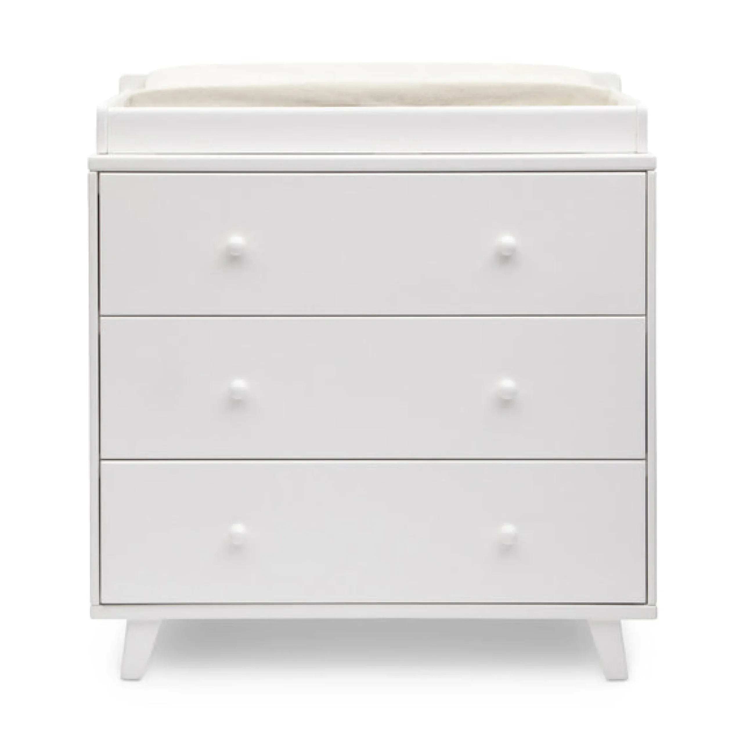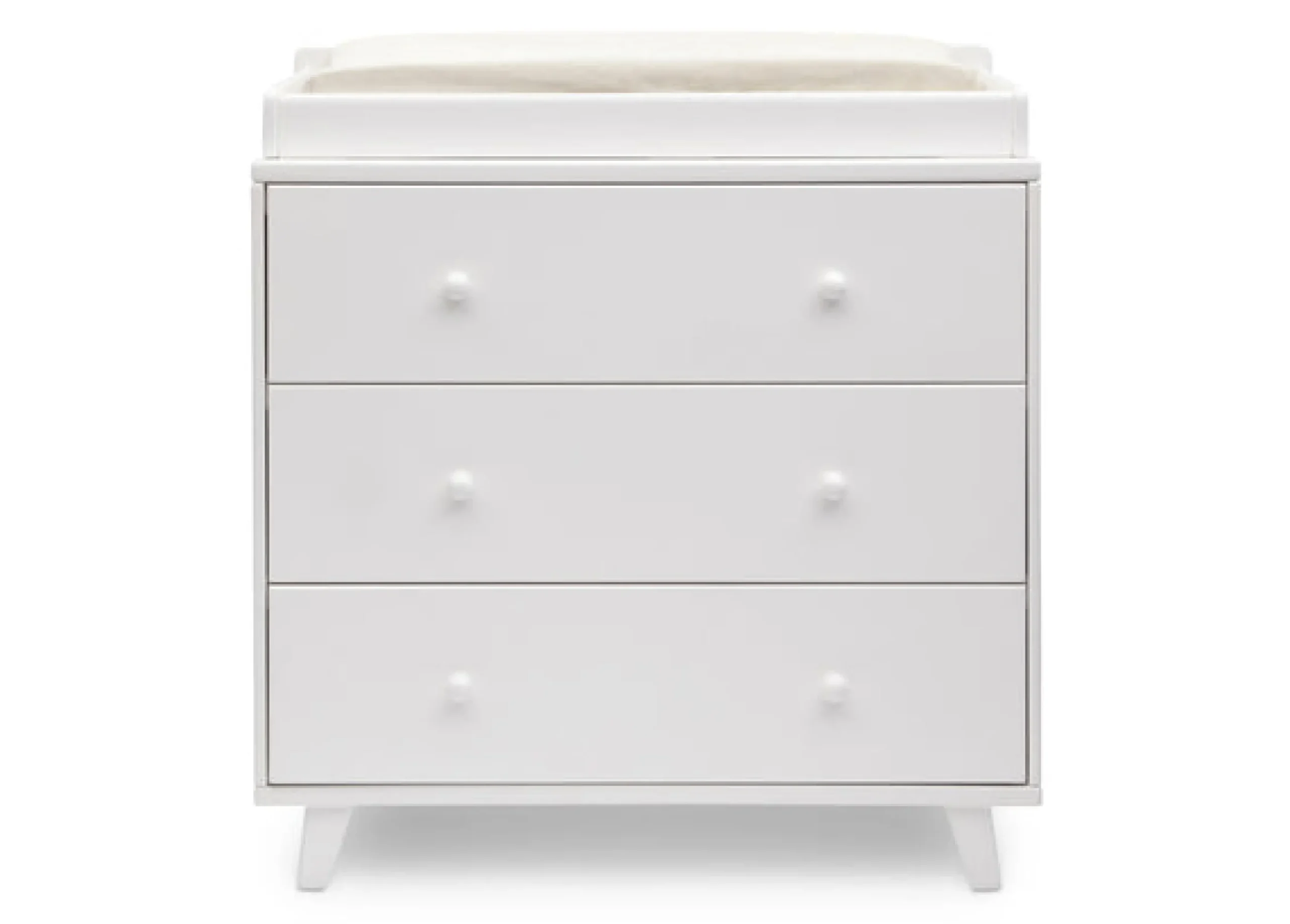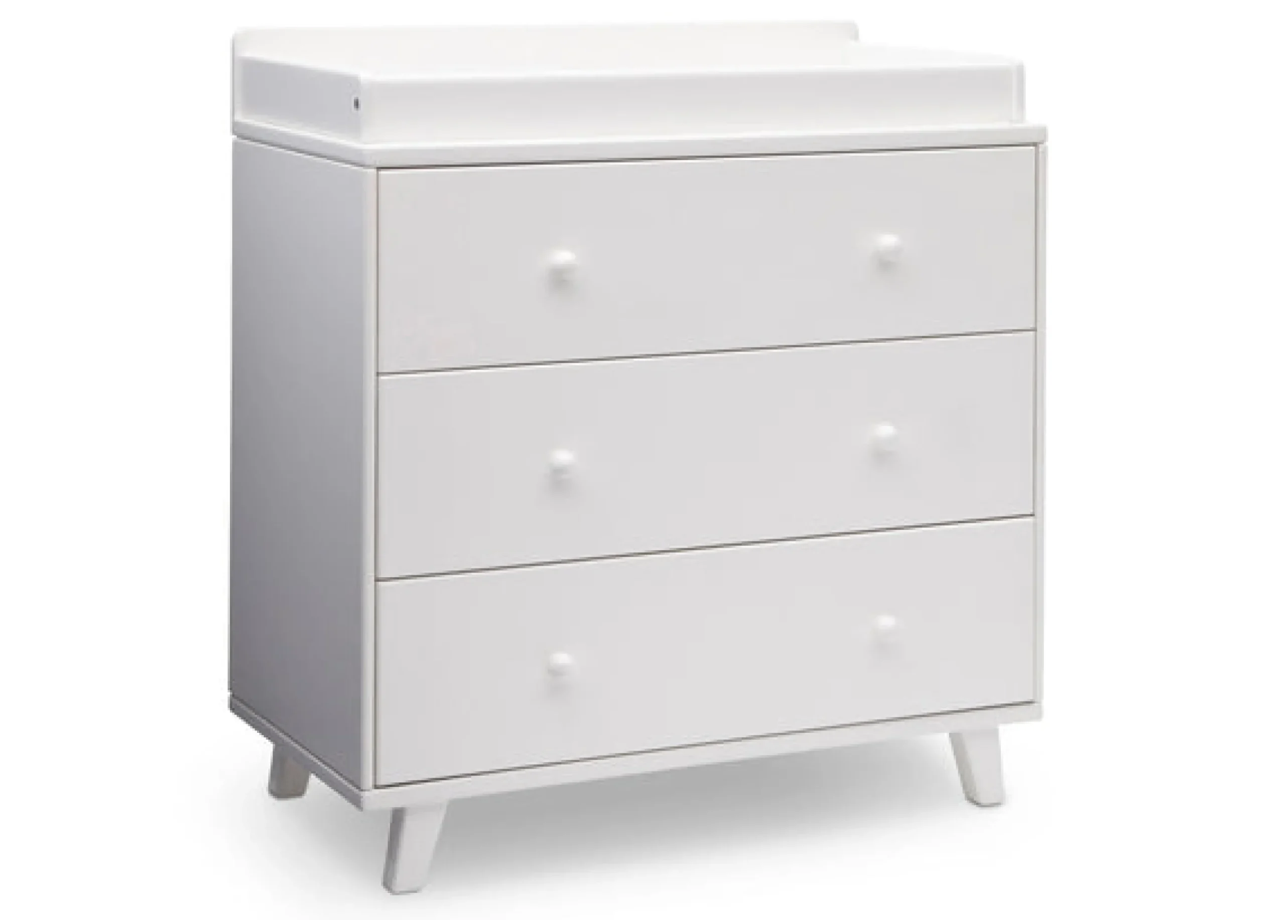 A modern heirloom, the Ava 3 Drawer Dresser with Changing Top and Interlocking Drawers by Delta Children features clean, crisp lines and three spacious drawers with plenty of storage for your growing baby. Topped with a removable changing top, the dresser does double duty–once your baby outgrows the need for a changing table, just remove the topper for many additional years of use. Outfitted with an interlocking drawer system that limits the number of drawers that can be opened at one time for your child’s safety, this dresser is the best option for your little one. Plus, its legs match Delta Children’s Ava 3-in-1 Convertible Crib, pair them together to create a cohesive nursery, or mix it with furniture in the same finish or contrasting finish for a more eclectic look. Plus, it’s GREENGUARD Gold Certified, which means it’s built to contribute to cleaner air for a healthy home.This Delta Children dresser is tested to meet the current requirements of ASTM F2057, the mandatory CPSC safety standard that protects young children from furniture tip-over incidents. For your children’s safety, only purchase dressers that comply with this standard. For additional security, Delta Children strongly recommends that all dressers in your home be anchored; all Delta dressers include a wall anchor. To learn how to properly secure your dresser, please see the product assembly instructions or visit our website.