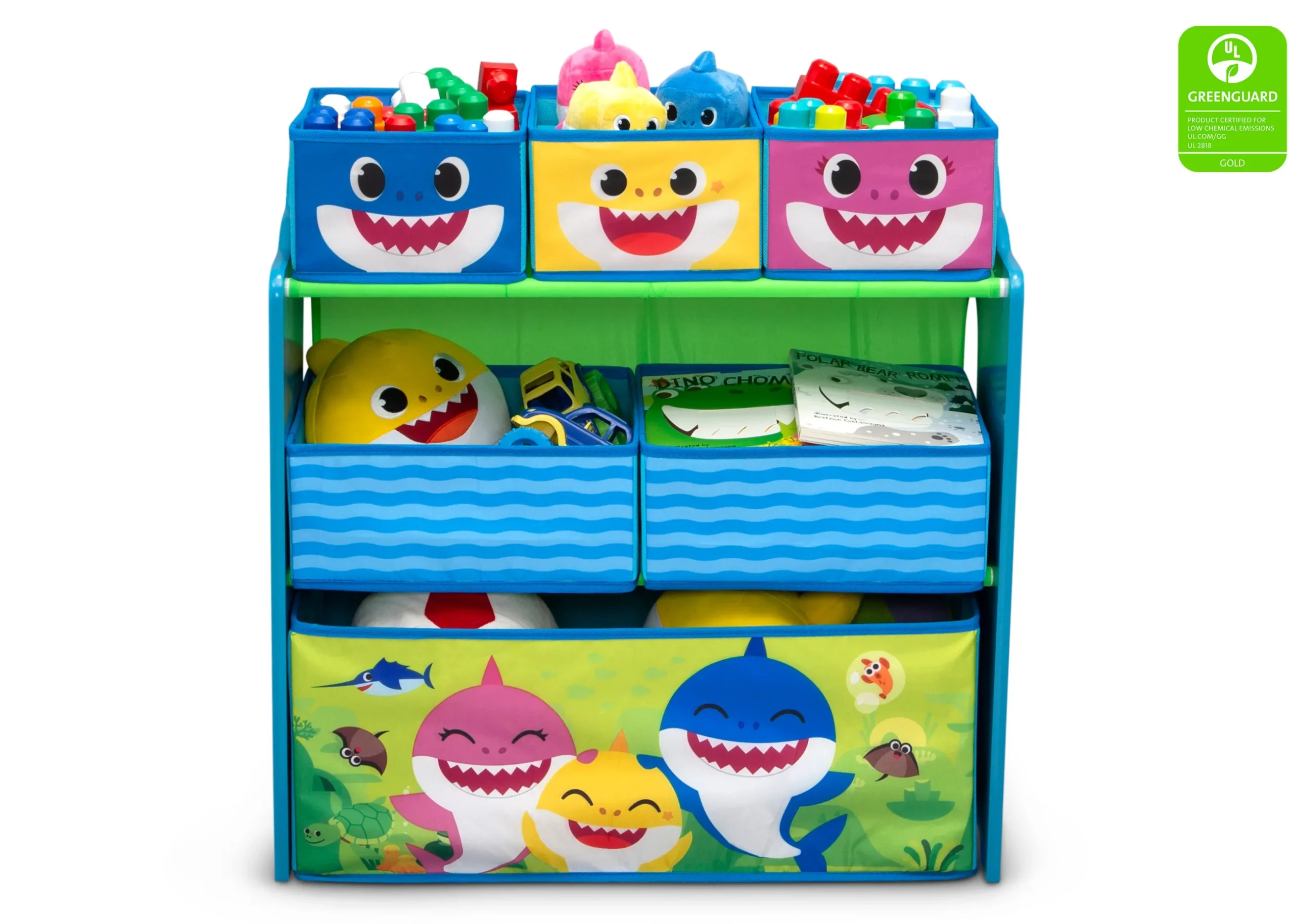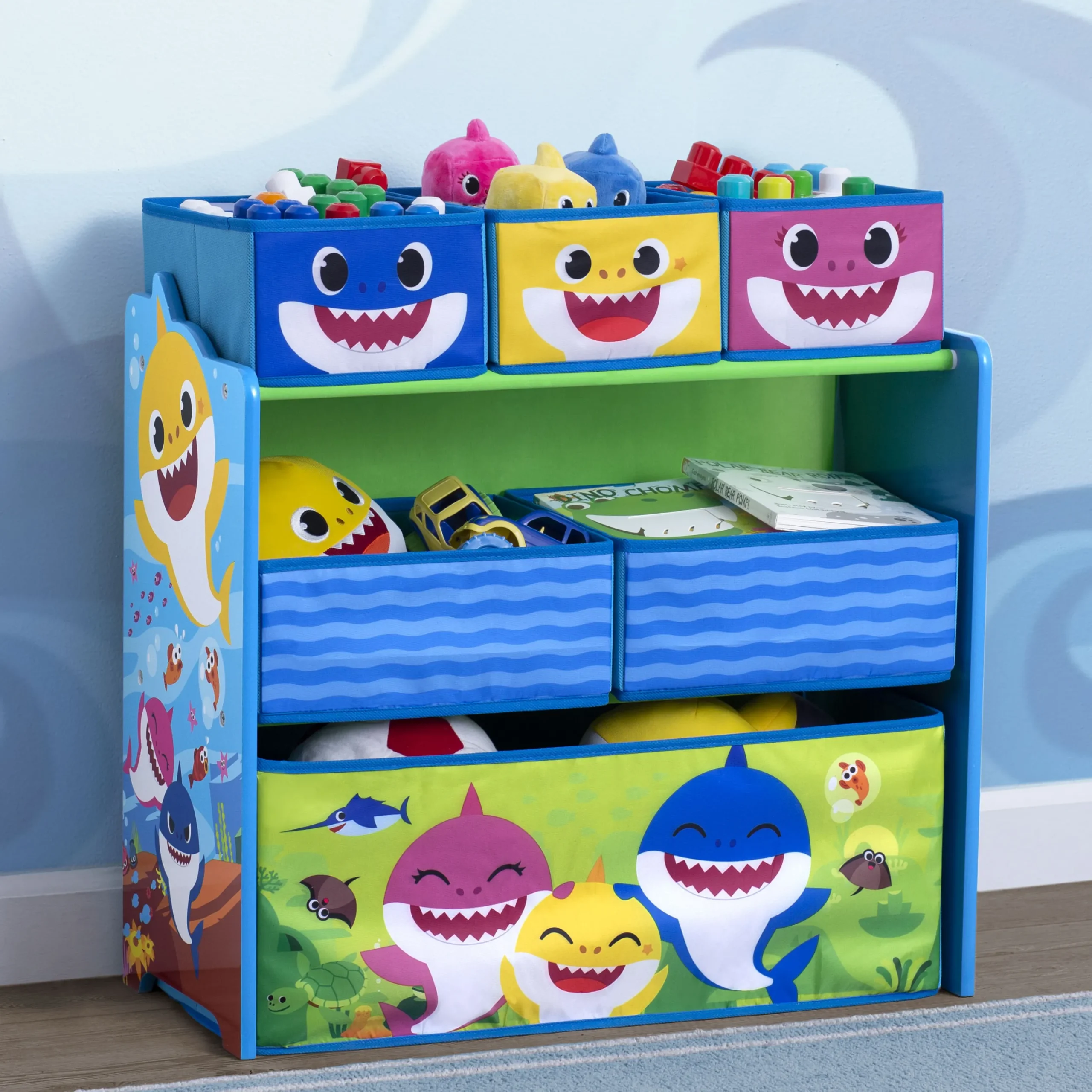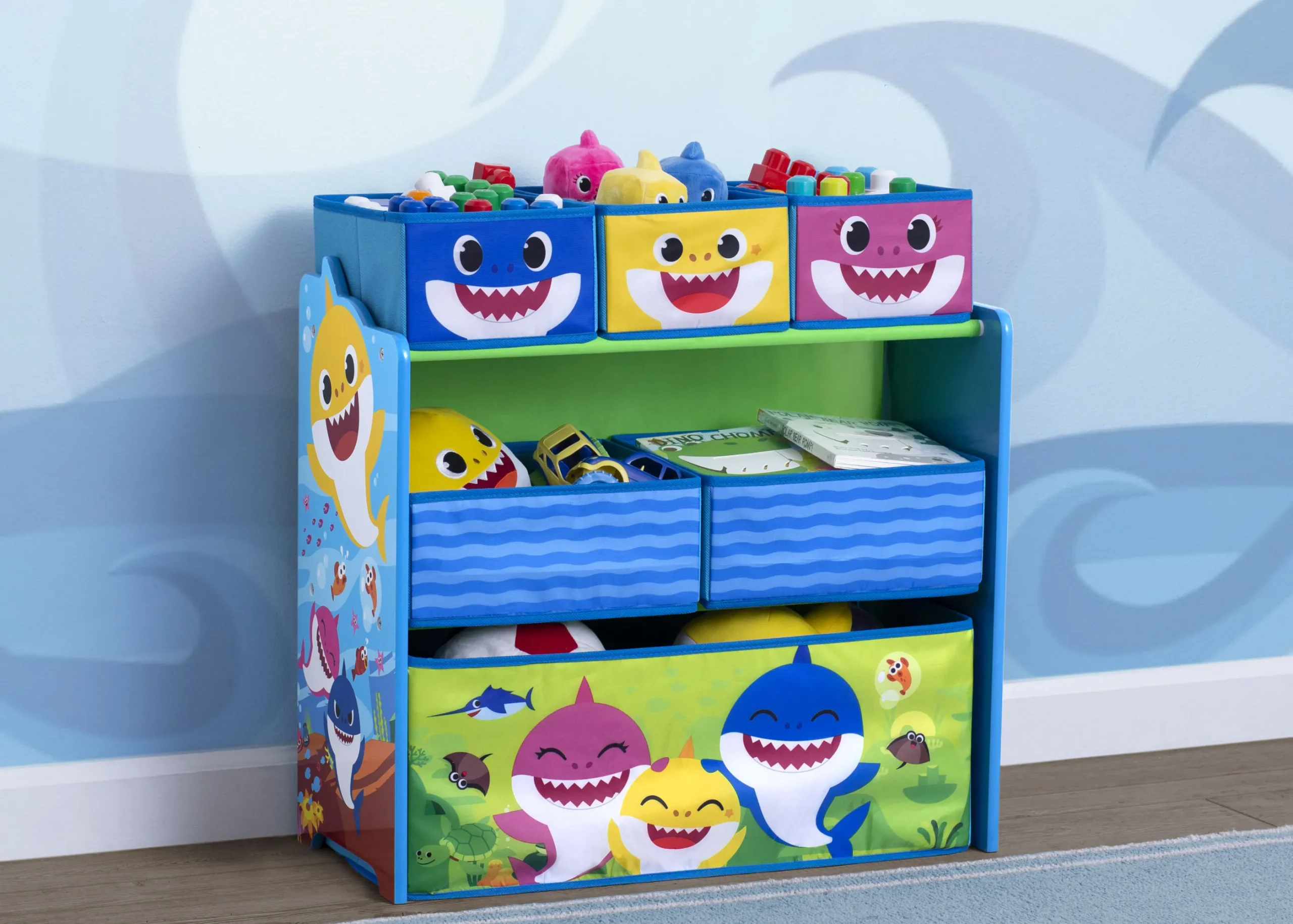 Take a bite out of playroom clutter with this Baby Shark Design & Store 6 Bin Toy Storage Organizer by Delta Children. A storage essential and colorful sticker station and all in one, this toy organizer is boldly decorated with jaw-dropping Baby Shark graphics and includes reusable vinyl stickers that feature a fun under-the-sea theme. Kids can rearrange the stickers on the sides of this organizer for hours of endless storytelling, adding a much-needed incentive to clean-up time. The sturdy wooden frame holds six fabric bins sized for every type of toy, so you can store books, blocks, and more. An eye-popping addition to their playroom or bedroom, this toy organizer makes cleaning quick and easy.