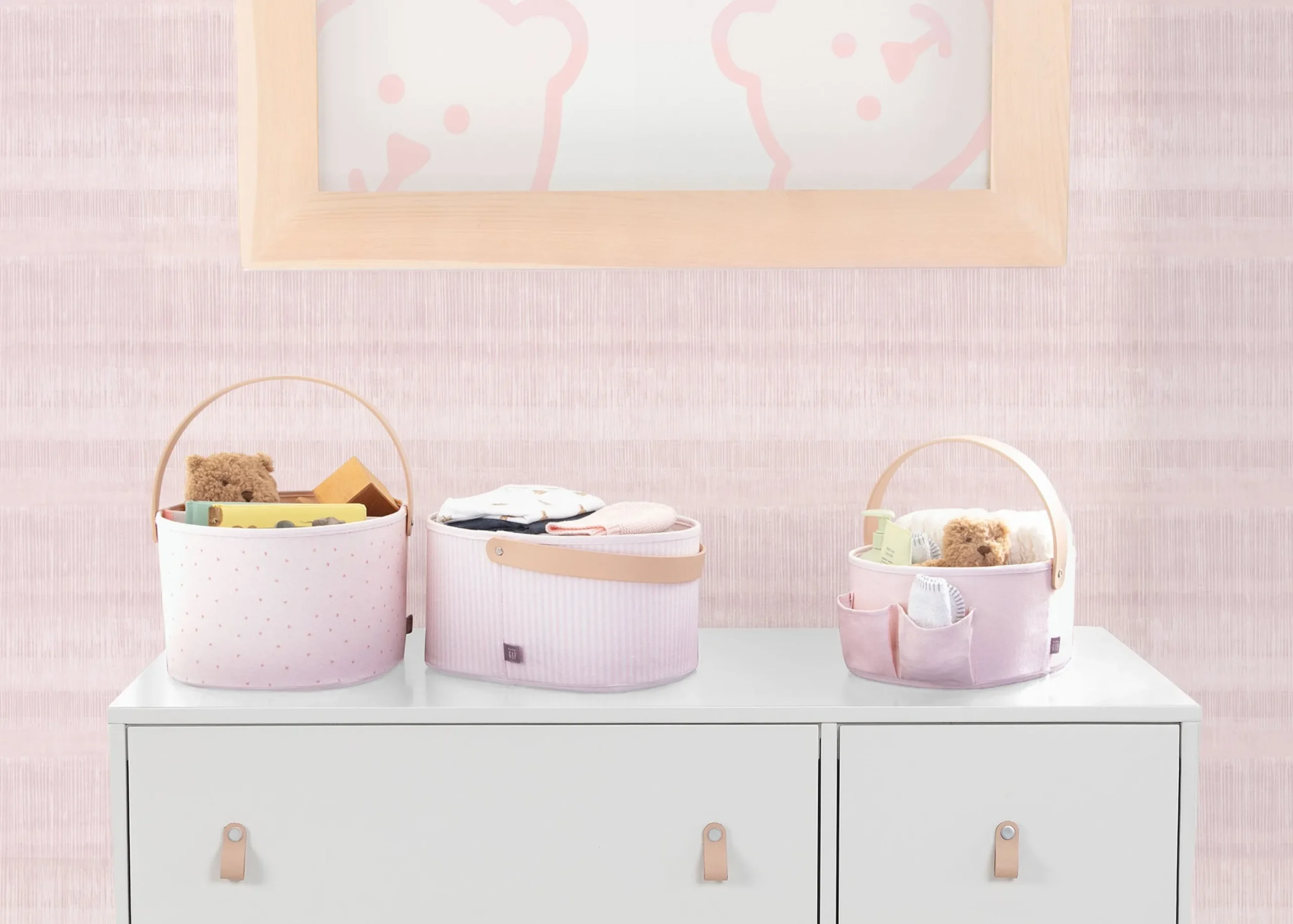 This babyGap by Delta Children 3-Pack of Nested Fabric Storage Bins with Handles is the perfect solution for organizing any nursery or child’s bedroom. Adorned with an adorable Brannan Bear, polka dot motif and stripe patterns, these three caddies are uniquely babyGap. Ideal storage for diapers, clothing, toys and more, these caddies feature sturdy faux leather handles to ensure easy transport. The three included sizes will cover all your storage needs, the small features a divider and outside pockets which makes it ideal for diapers and changing necessitates, the medium is roomy enough for toys, and the large features a removable divider and spacious interior which makes it perfect for clothes storage. For maximum space-saving, these handy caddies nest inside each other when not in use