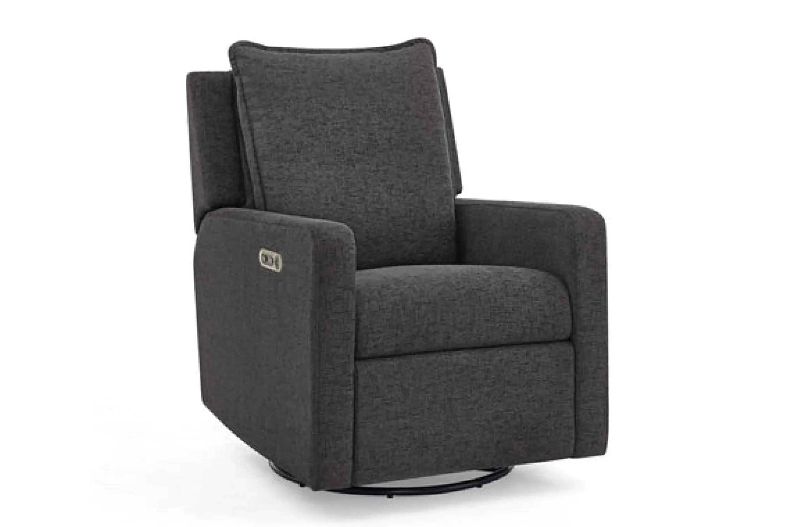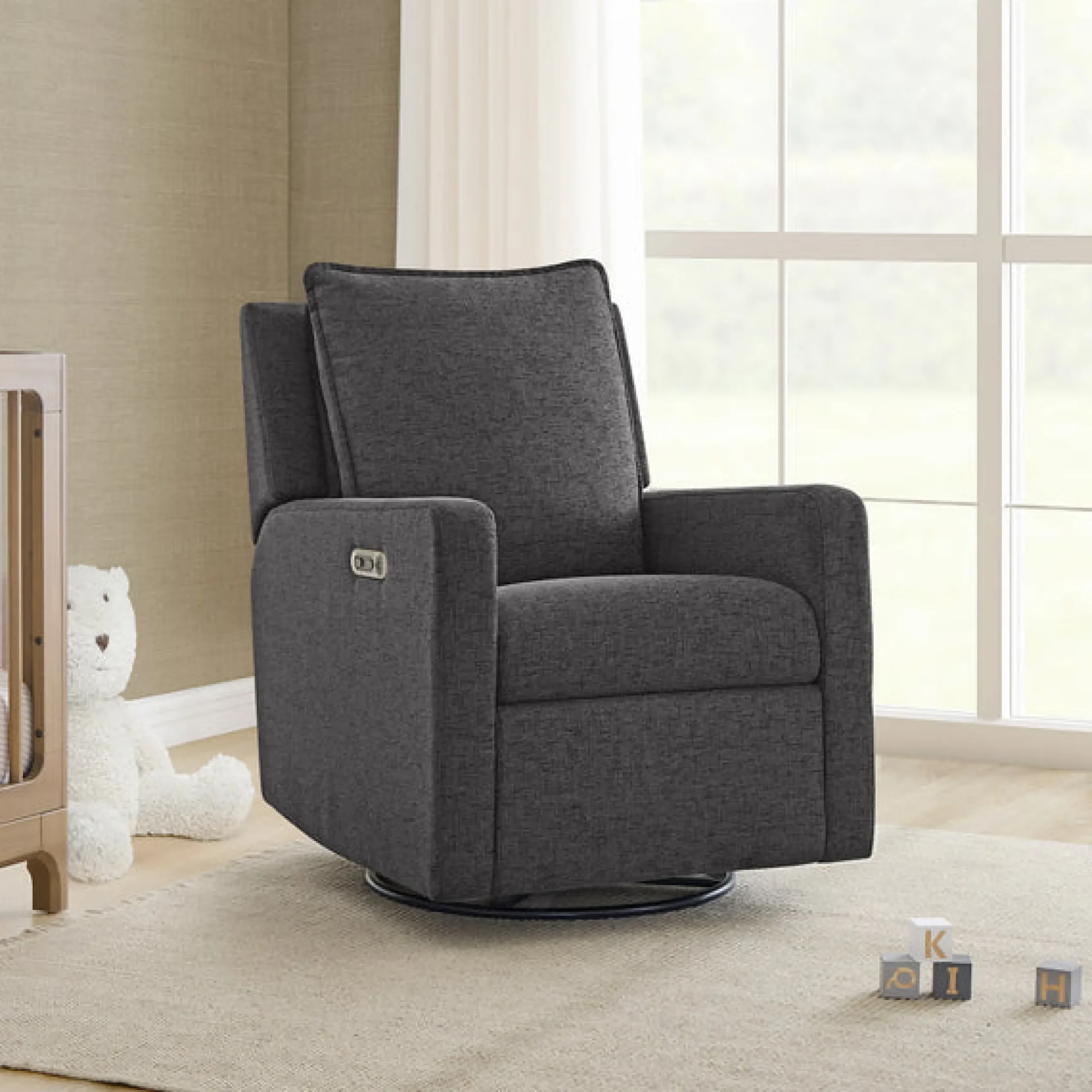 Enjoy comfort at the touch of the button with the babyGap Harlowe Power Recliner by Delta Children. An easy-to-reach control panel on the side features buttons that control reclining, plus USB A/C charging ports, so you can have electronics conveniently on hand. Outfitted with a soothing glide and 240-degree swivel, this chair is ready to recline when you are, just hold the button and your feet will be raised on the footrest, followed by the backrest. Upholstered in our OEKO-TEX STANDARD 100 Certified performance fabric that is water and stain resistant fabric for easy clean up, this recliner is made to last through kids, pets, and busy lives. Plus, this recliner is GREENGUARD Gold Certified, which means it’s built to contribute to cleaner indoor air.