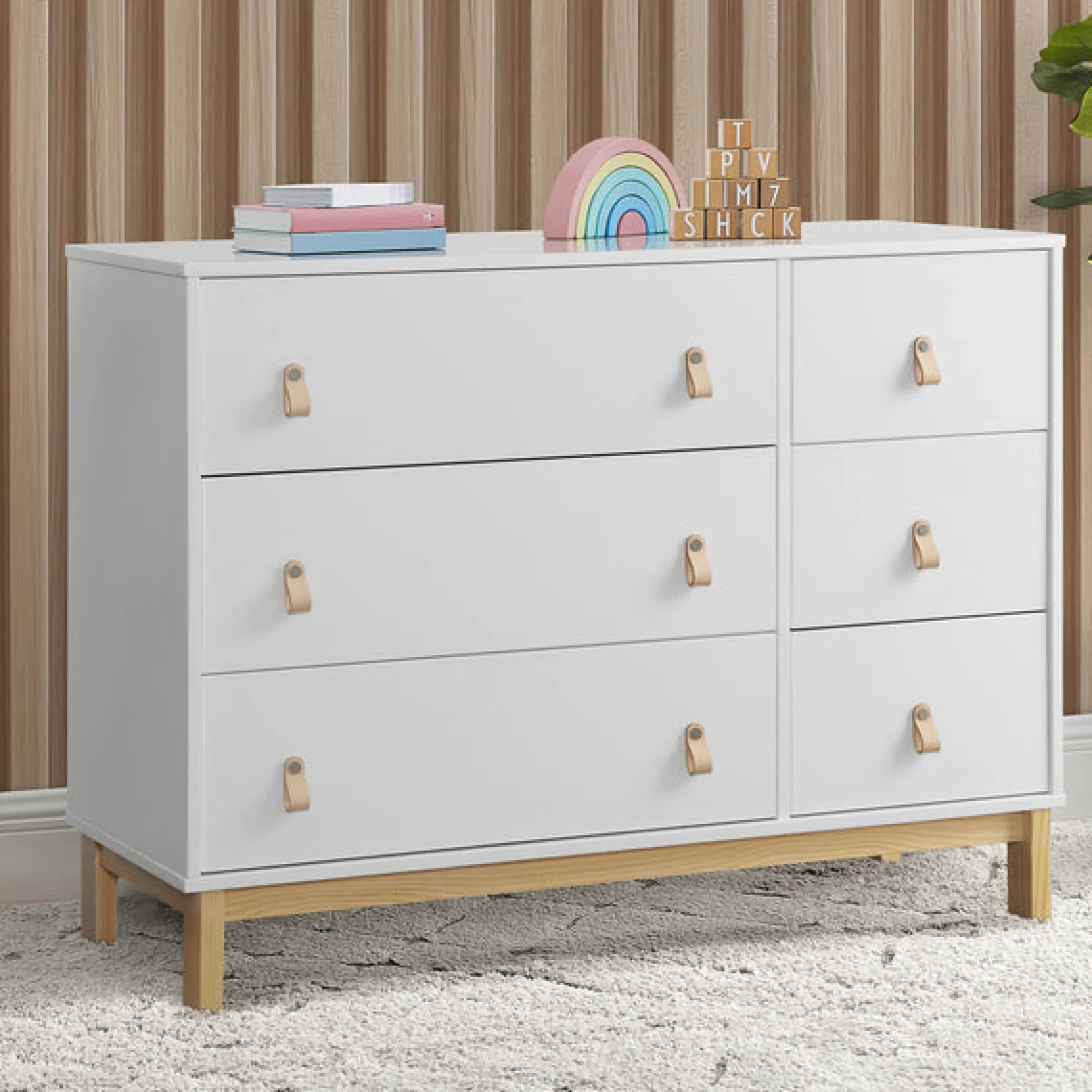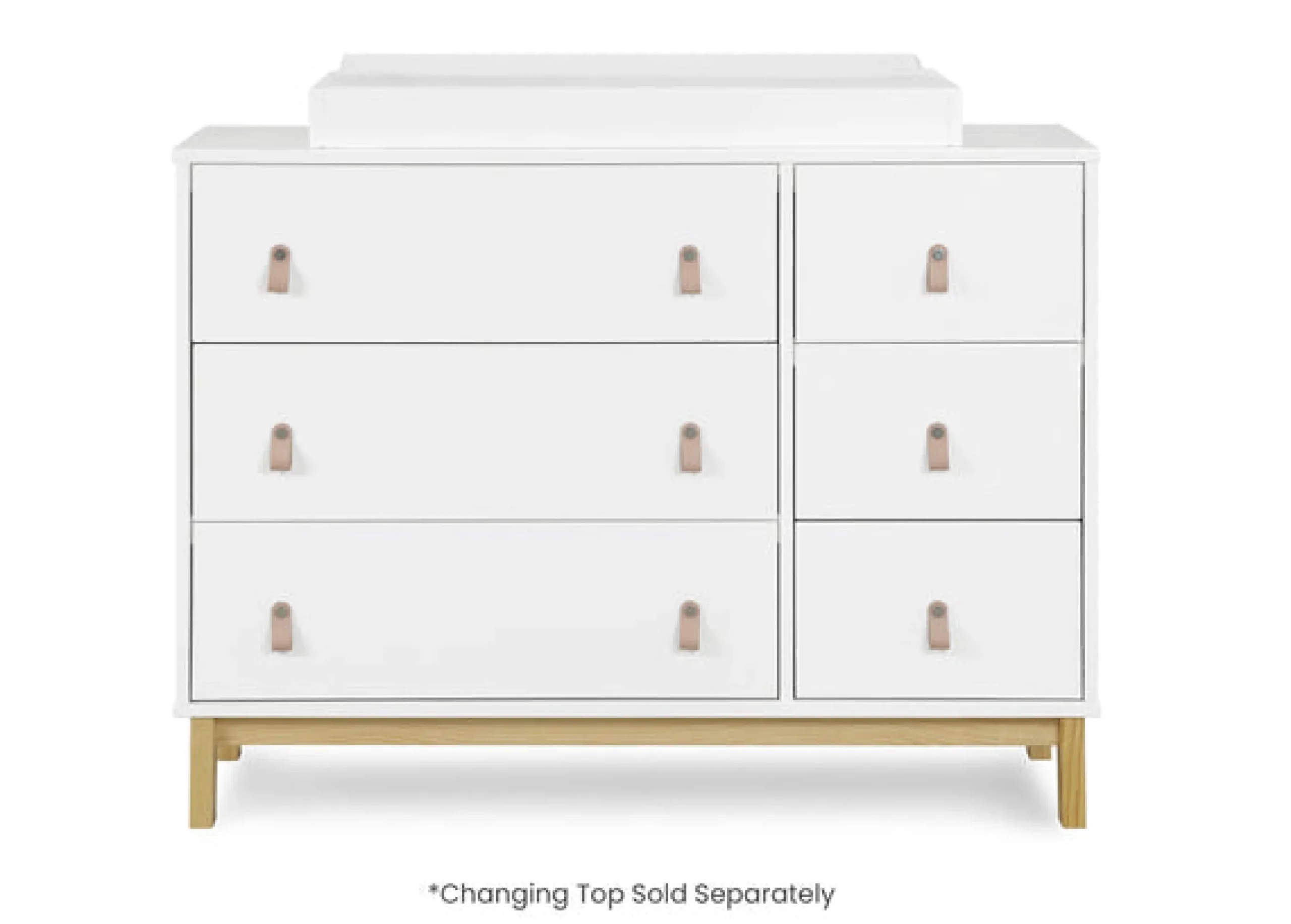 The babyGap by Delta Children Legacy 6 Drawer Dresser with Leather Pulls and Interlocking Drawers is a spacious and stylish storage option. A great addition to any nursery or kids’ bedroom, the leather drawer pulls add a fun detail to the piece. Crafted of sturdy, sustainable materials like New Zealand pine to give it plenty of longevity, this versatile dresser has a mix of small and large drawers to simplify organization. For your child’s safety, this dresser is outfitted with an interlocking drawer system that limits the number of drawers that can be opened at one time. Available in Bianca White/Natural, Navy/Natural and Ebony/Natural. Easily mix, match, and layer with other items from the babyGap Furniture and Bedding Collection. Pair with the coordinating Changing Top #W173810 to convert the dresser into a convenient changing table (Changing Top and changing pad sold separately). This babyGap by Delta Children dresser is tested to meet the current requirements of ASTM F2057, the mandatory CPSC safety standard that protects young children from furniture tip-over incidents. For your children’s safety, only purchase dressers that comply with this standard. For additional security, babyGap strongly recommends that all dressers in your home be anchored; all babyGap dressers include a wall anchor. To learn how to properly secure your dresser, please see the product assembly instructions or visit our website.
