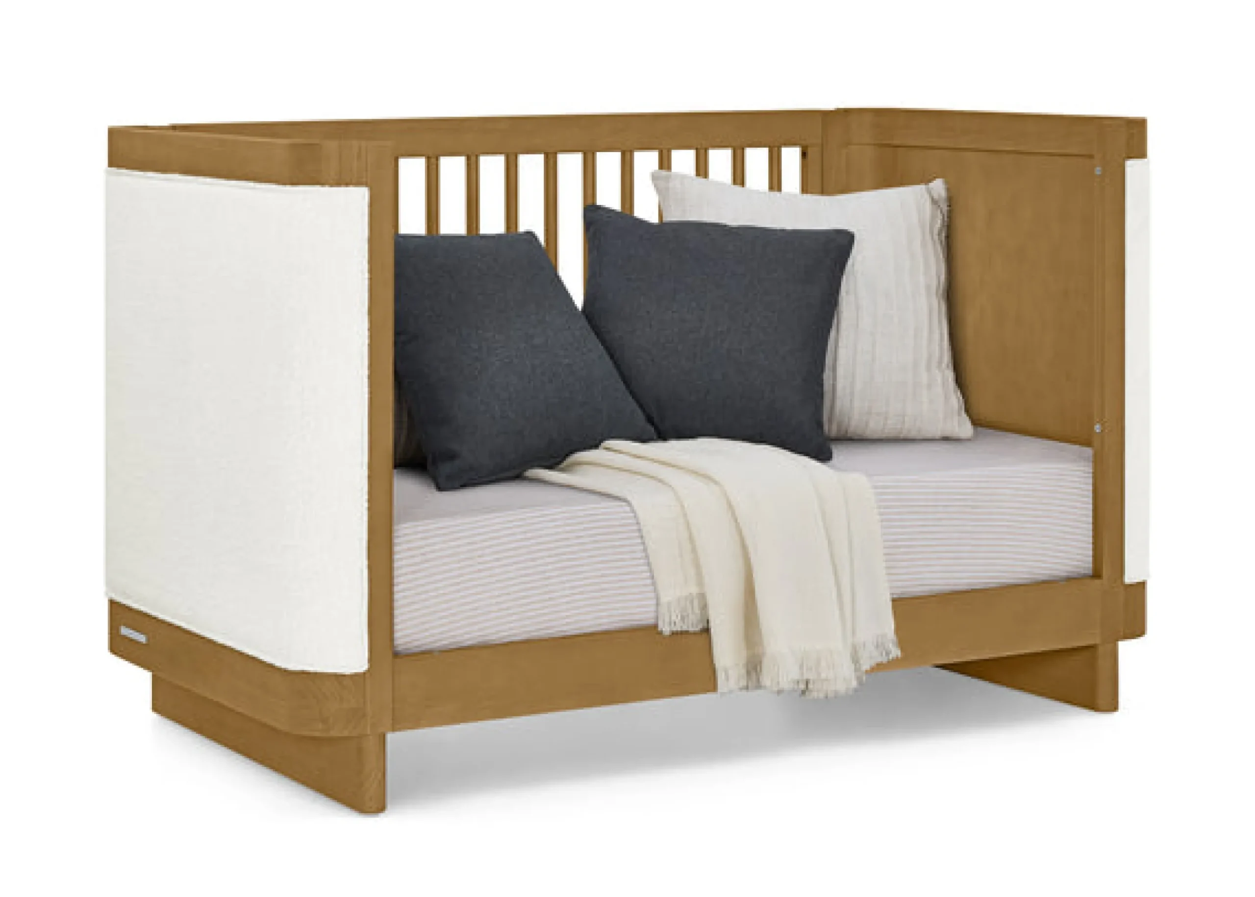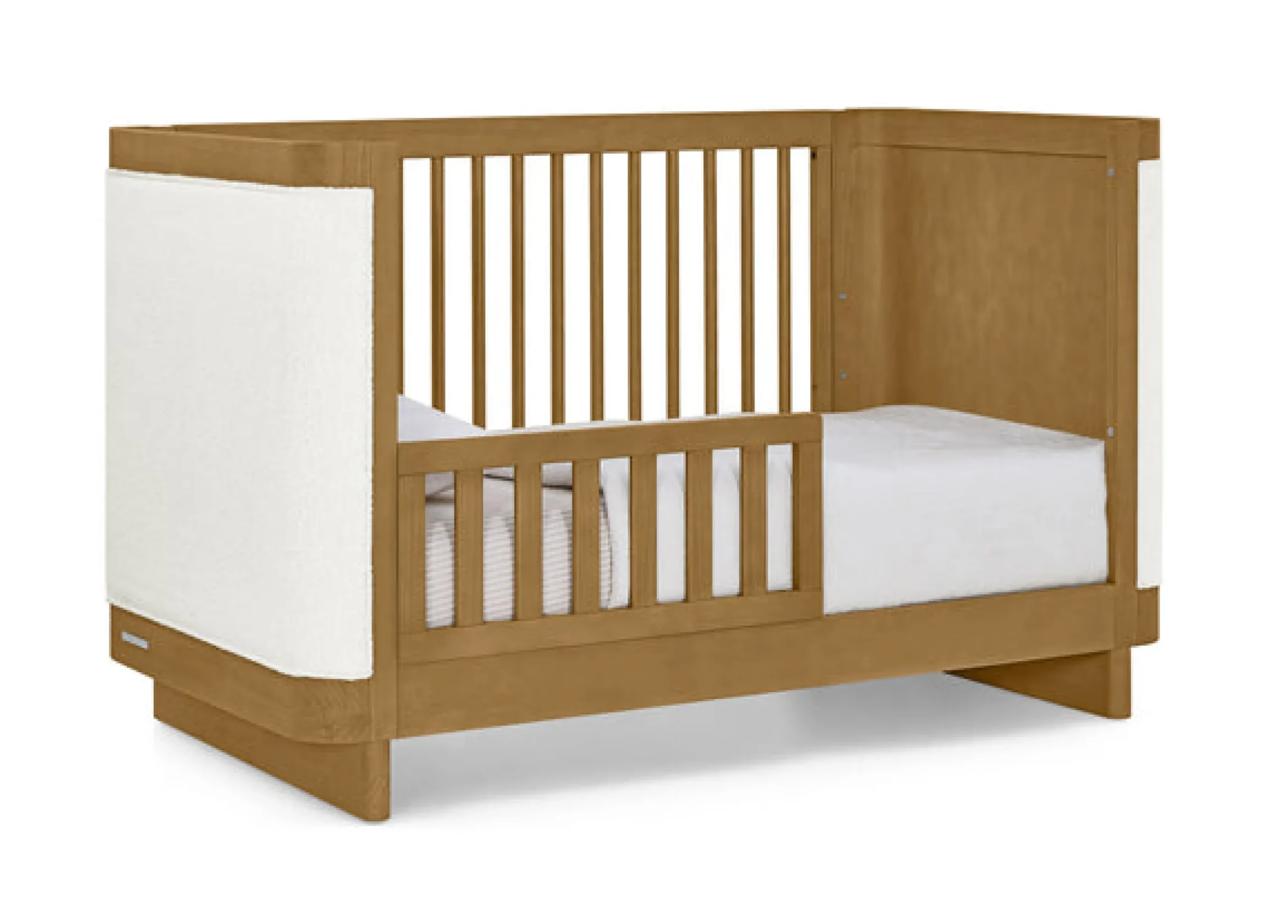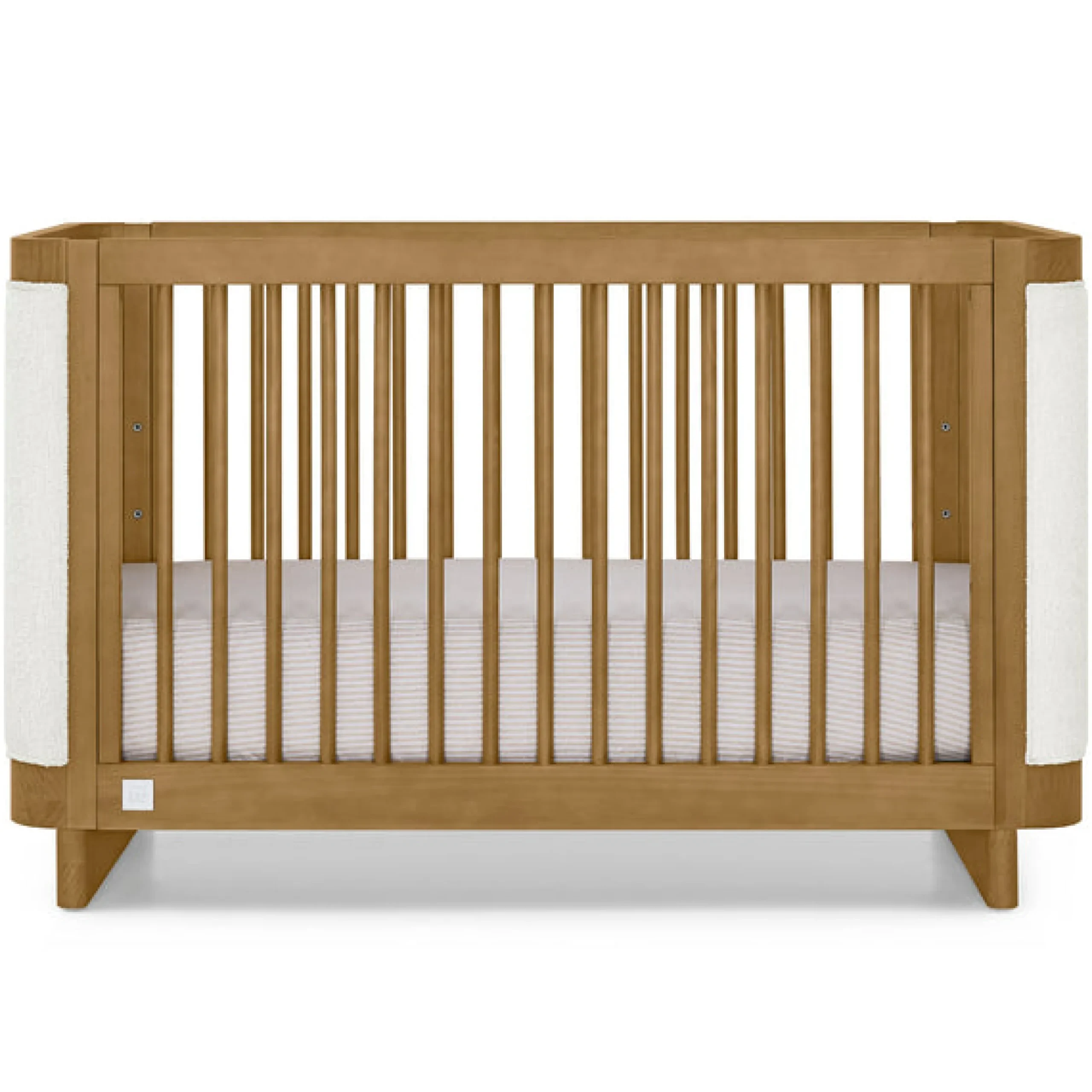 The babyGap Callie 4-in-1 Upholstered Crib by Delta Children is effortlessly cool and totally timeless. Everyday luxury that’s easy, this crib features curved end panels upholstered in a stain-resistant, performance boucle fabric to ensure that spills, stains, and everyday messes can be effortlessly wiped away. A statement piece that adjusts to your baby’s growth, this crib features modern block feet and a glazed finish with three mattress heights, and transitions to a toddler bed, daybed and sofa when your child is ready (Toddler Guardrail #W173726 sold separately). Plus, the Callie 4-in-1 Convertible Crib is GREENGUARD Gold Certified, which means it’s built to contribute to cleaner air for a healthy home. Available in Antique White and Acorn. Crib mattress sold separately. To complete the look, pair this crib with the coordinating babyGap Skye 6 Drawer Dresser.