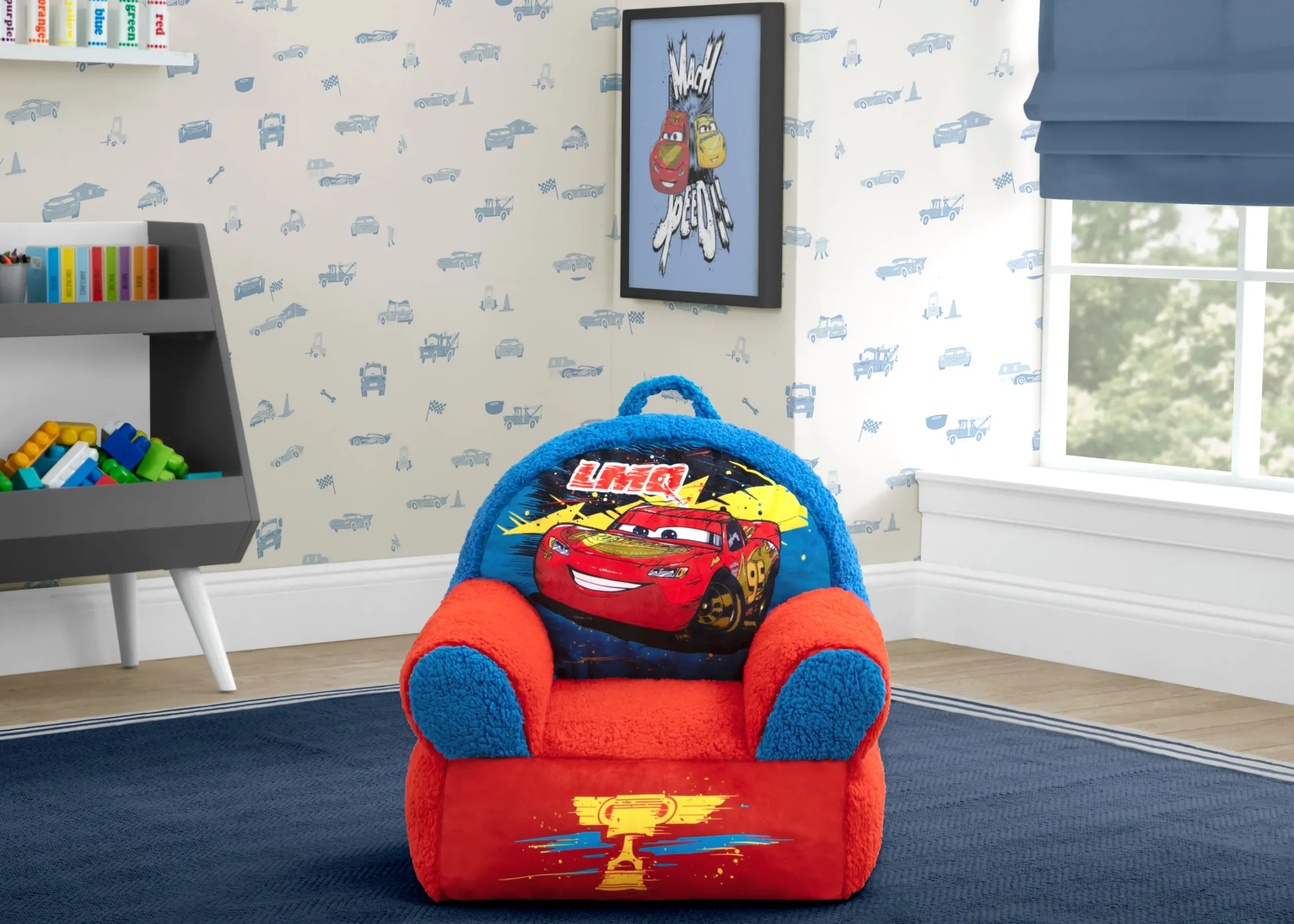 Kids can snuggle up with their favorite character with the Cars Cozee Buddy Chair by Delta Children! This plush chair features colorful Cars graphics of Lightning McQueen, super-soft fabric and a handle that makes it easy to move around the house! The foam design of this comfy chair offers kids a cozy companion for reading, relaxing or snuggling, making it perfect for playrooms and kids’ bedrooms.