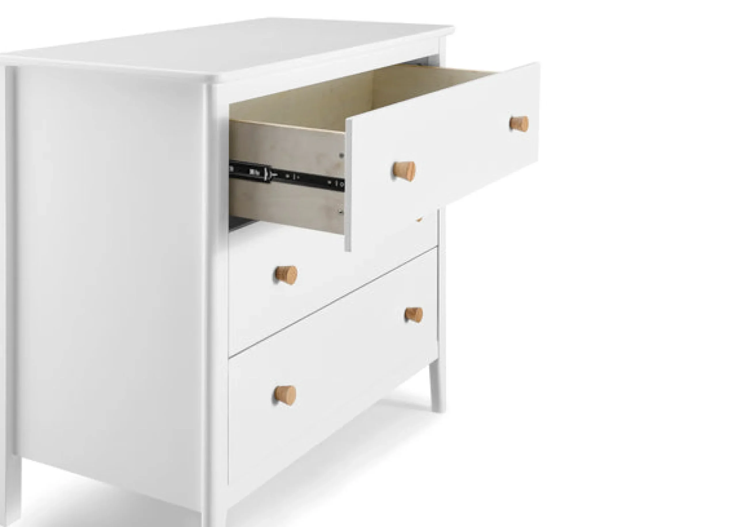 Designed to elevate modern nurseries or bedrooms, this dresser features clean lines, playful round knobs, and tapered legs
