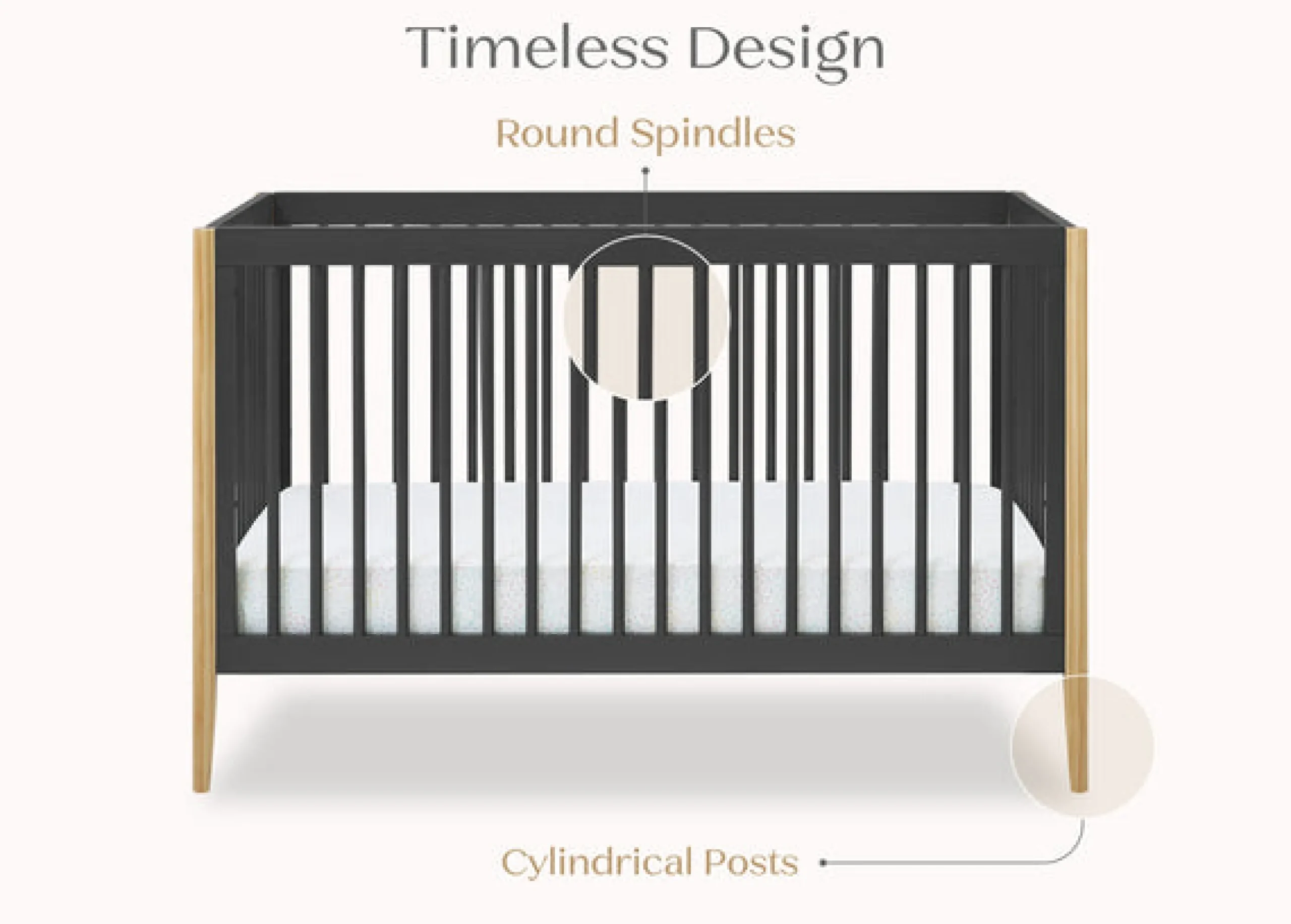This crib will instantly elevate your nursery with its mid-century modern style. Clean lines, playful round spindles and cylindrical posts define this beautiful option