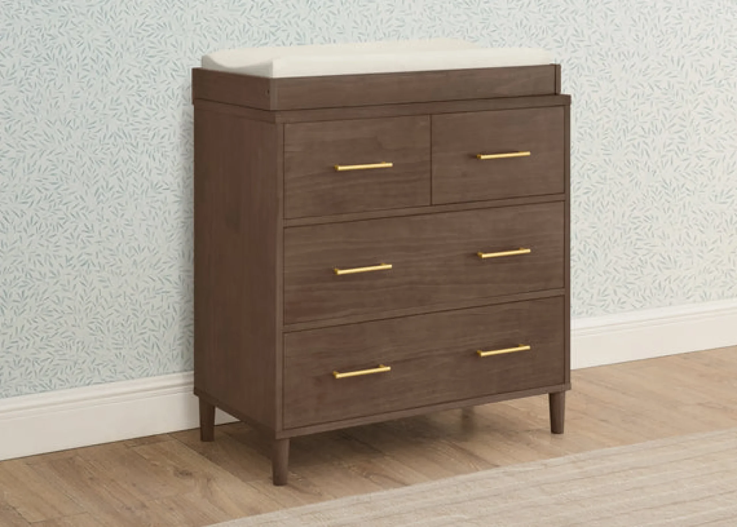 With clean lines and tapered legs, the Classic 4 Drawer Dresser with Changing Top by Delta Children is a timeless design that’s totally at home in the modern nursery or kid’s room. With sleek metal hardware, four spacious drawers and an included changing top, this dresser has everything you need for your child’s space (changing pad sold separately). When your child grows, just remove the topper, and it easily transitions into a stand-alone dresser. Constructed from made-to-last sustainable materials to ensure stability and longevity, this dresser is also GREENGUARD Gold Certified, which means it’s built to contribute to cleaner air for a healthy home. For your child’s safety, this dresser is outfitted with an interlocking drawer system that limits the number of drawers that can be opened at one time. This dresser is tested to meet the current requirements of ASTM F2057, the mandatory CPSC safety standard that protects young children from furniture tip-over incidents. For your children’s safety, only purchase dressers that comply with this standard. For additional security, Delta strongly recommends that all dressers in your home be anchored; all Delta dressers include a wall anchor. To learn how to properly secure your dresser, please see the product assembly instructions or visit our website.