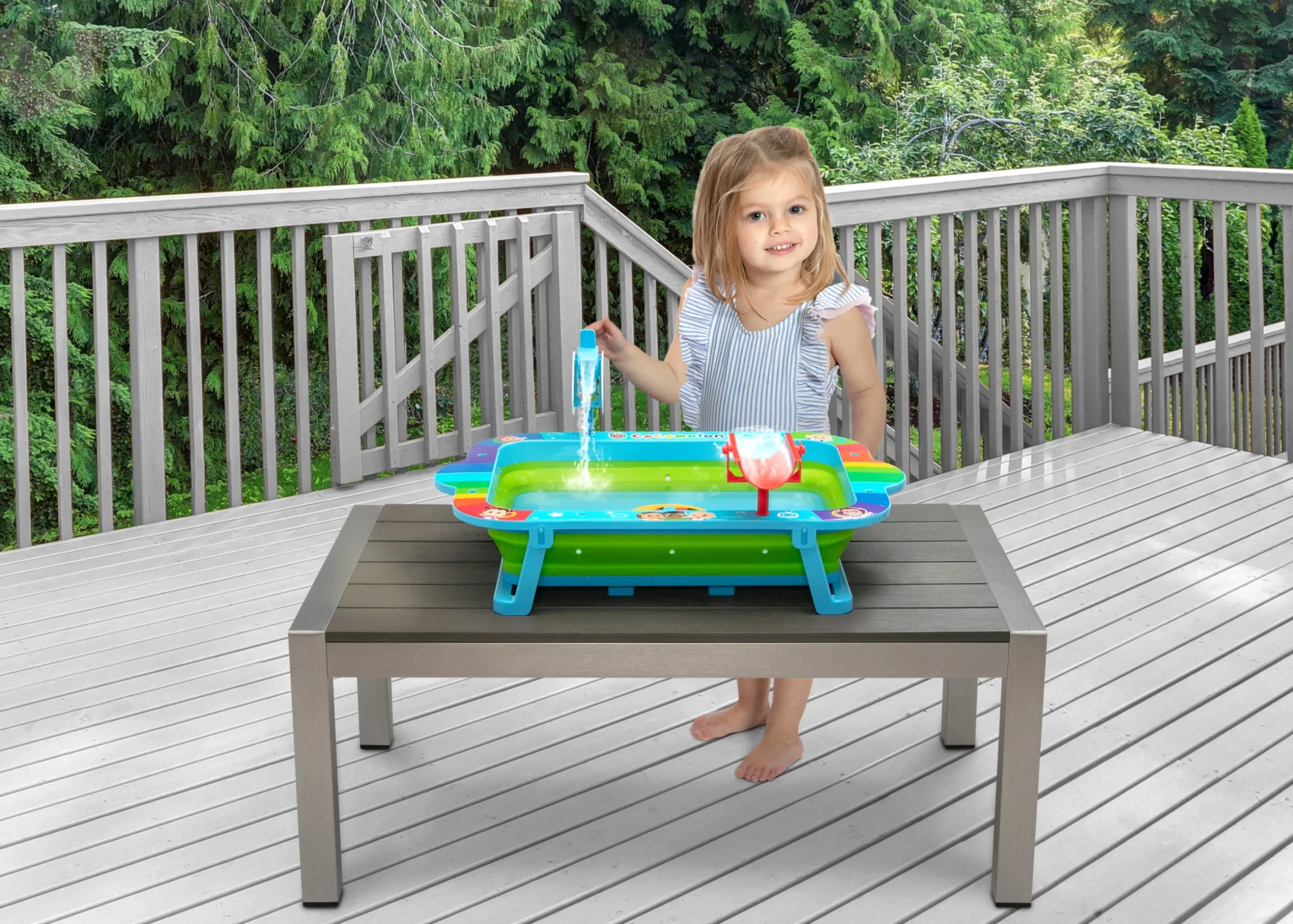 Make a splash anywhere you go with this CoComelon Water Activity Table by Delta Children. Designed with folding legs, this portable water table is easy to store or transport—use it in the backyard, the beach or beyond. The table’s waterwheel, water slide and underwater spinner will keep kids’ hands and minds busy for hours, helping improve their fine motor skills, sharing skills and their imagination as they explore all this activity table has to offer. When playtime fun is done, empty the water table with the convenient no-leak drain plug located at the bottom of the basin for easy clean-up and storage! Table is recommended for ages 2 and up.