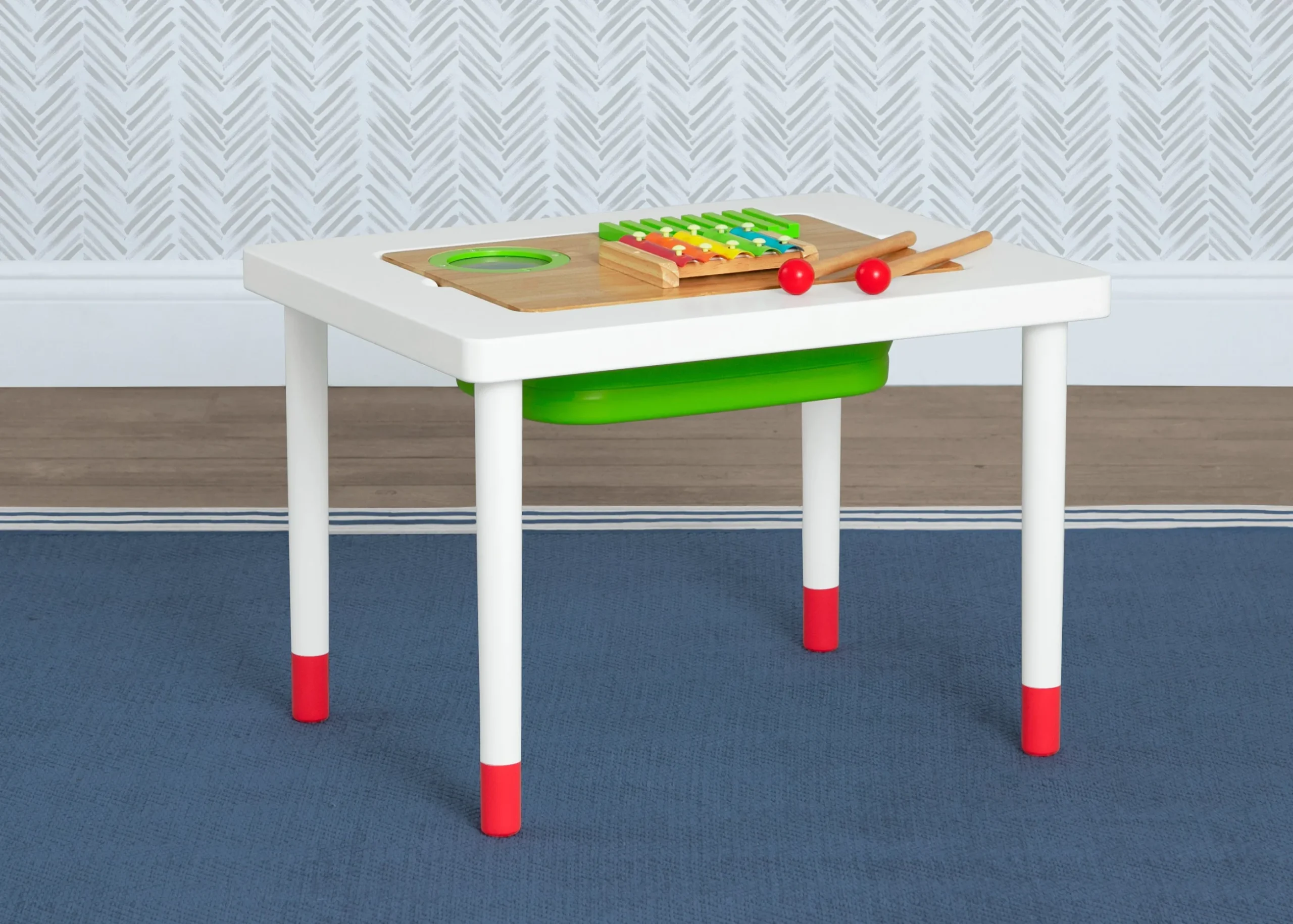 Fully loaded with interactive features, this Compact Play & Learn Sensory Table by Delta Children is an outstanding sensory experience for the small set. Teaching motor skills and dexterity, this table offers a Montessori play experience with its double-sided board that features musical instruments on one side and a flat top on the other side that can be used for mealtime, crafts, games, and more. Kids can also use the removable plastic bin to hold everything from sand, water, beans, rice, or whatever sensory fun you can imagine. This parent-approved table is a one-stop shop of endless fun and exploration that will help improve your little one’s hand-eye coordination, fine motor skills and problem-solving skills. Thoughtfully made and beautifully designed, this cool sensory table is something you won’t mind leaving out on display. Table includes one double-sided sensory board, drum sticks and a removable and collapsible plastic bin.