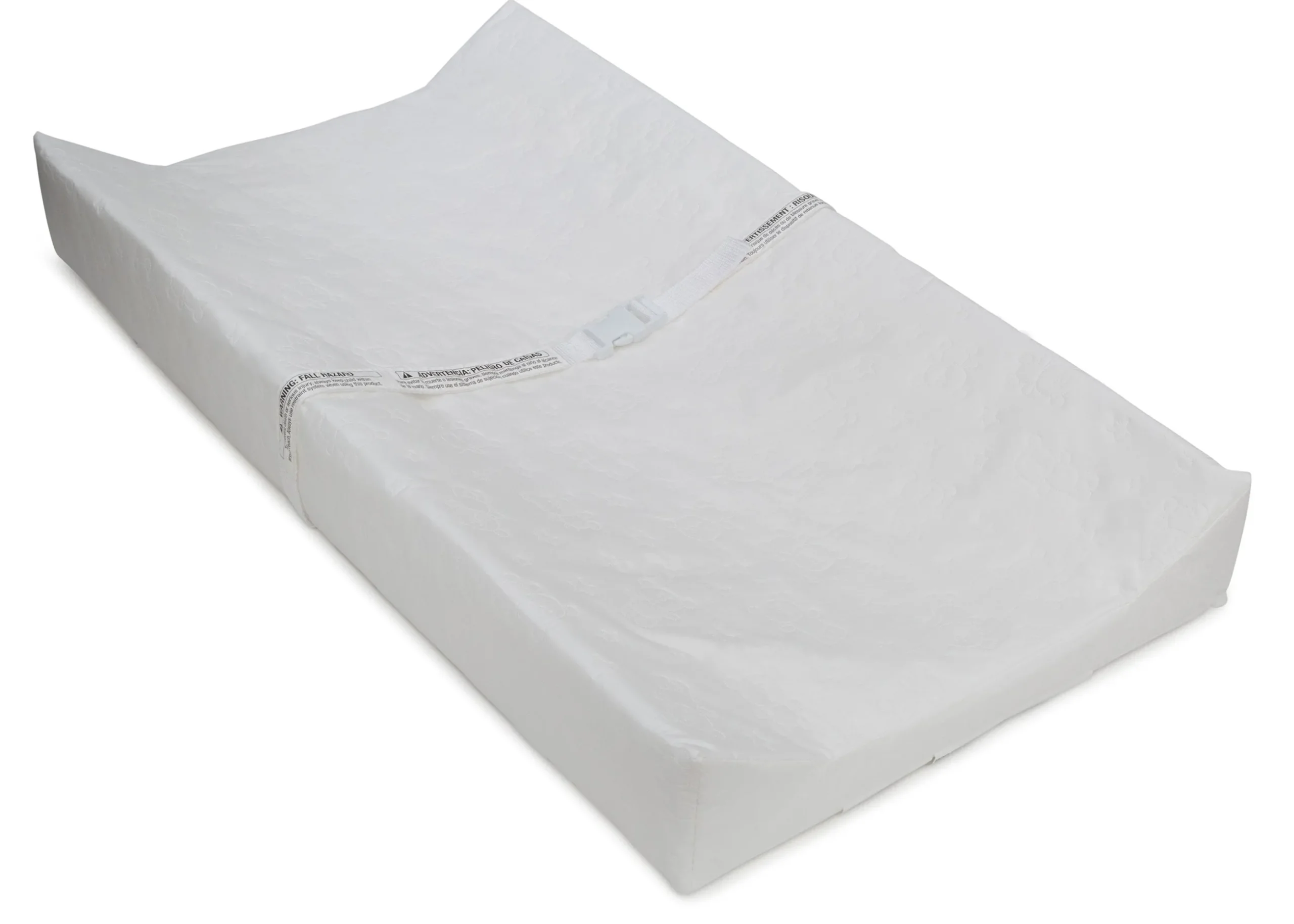 The supportive and secure Contoured Changing Pad by Delta Children provides a cozy place for baby to relax during diaper changes. Gently curved edges and a safety strap keep your little one in place while the foam and fiber core ensures long-lasting comfort. Topped with a waterproof cover that features a quilted, teddy bear pattern, this changing pad is easy to wipe clean. The Contoured Changing Pad by Delta Children is designed to fit most changing pad covers, dressers and changing tables, and securely attaches to furniture with fabric straps underneath the pad.