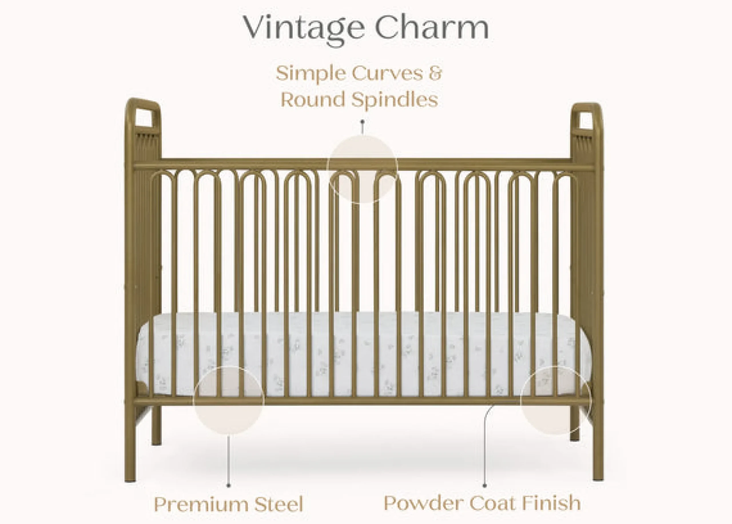 - Beautifully crafted of premium steel, this vintage-inspired crib with simple curves and round spindles looks like a cherished heirloom but has all the modern features your growing baby needs