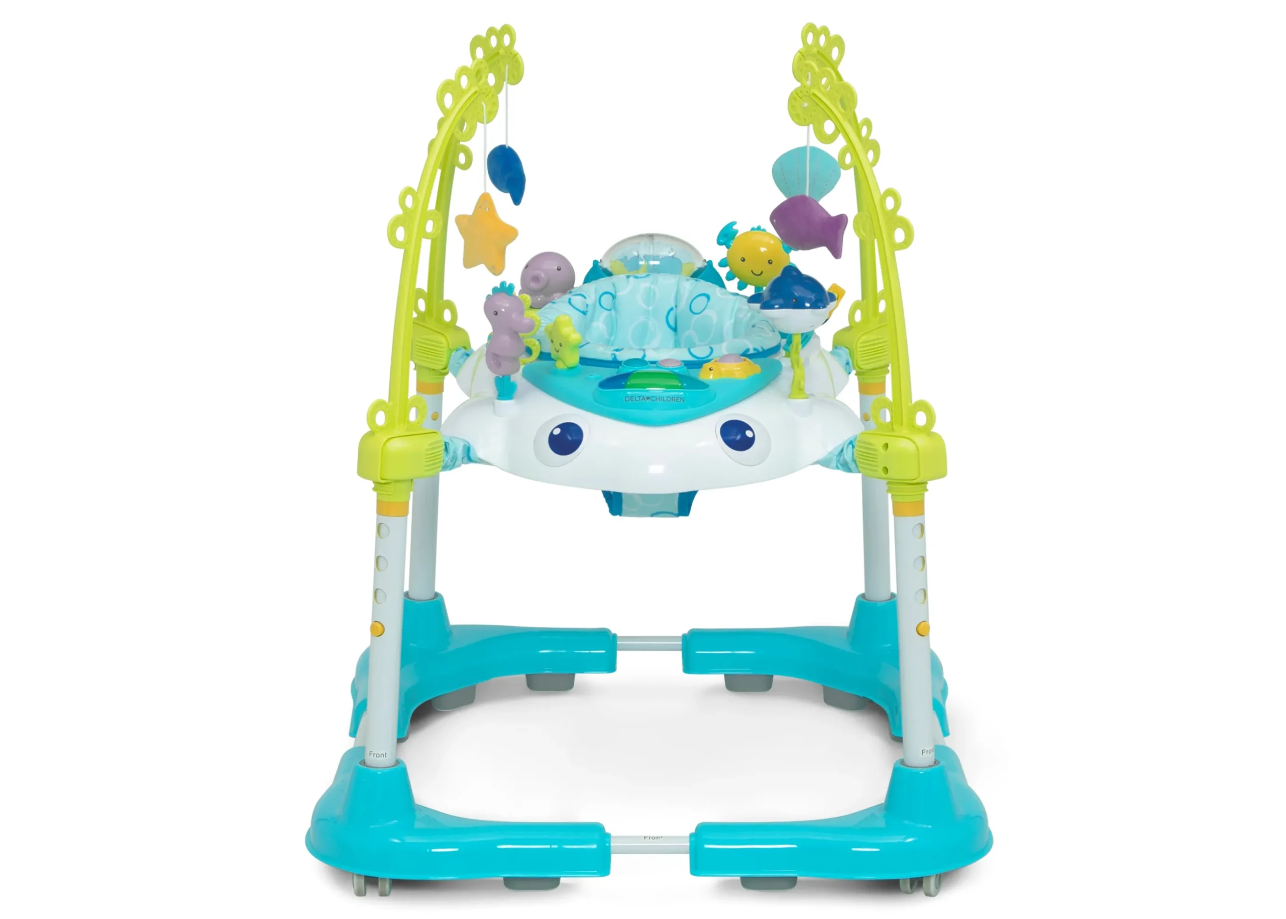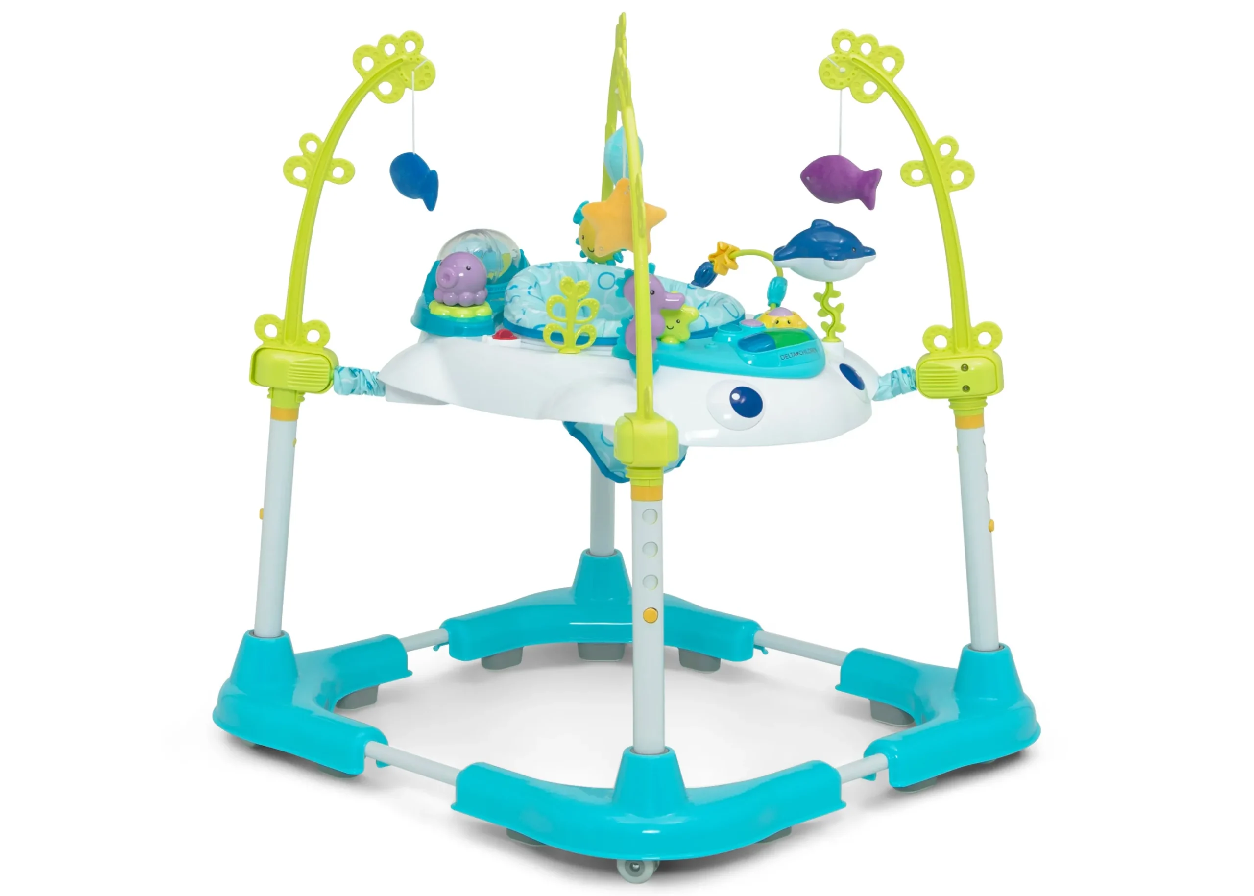 - 360-degrees of toys provides interactive play in every direction while 4 stationary mobiles with plush sea creatures add an additional play feature that encourages baby to stand and reach