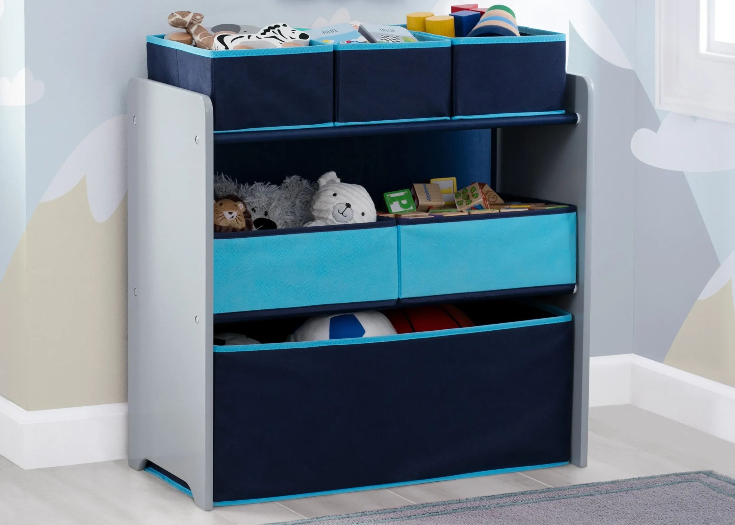 This toy organizer features a bold two-tone design that makes cleaning up fun