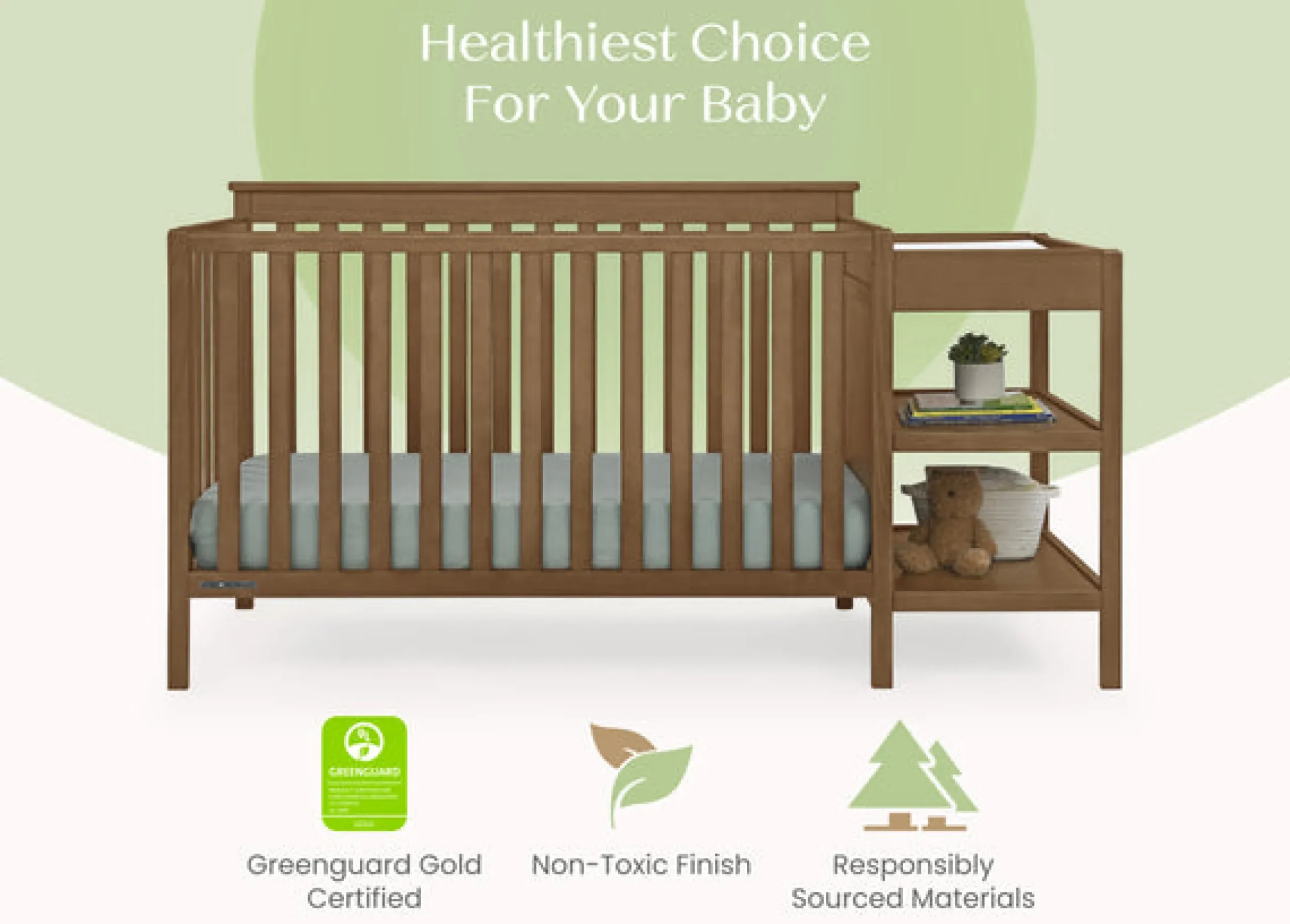 This crib meets or exceeds the most stringent chemical emissions standards to create a healthier home for your baby. It has been screened for more than 10,000 chemicals and VOCs that are known to pollute indoor air, certifying it contributes to cleaner indoor air. When you buy this crib, you can feel good about what you’re putting in your child’s nursery