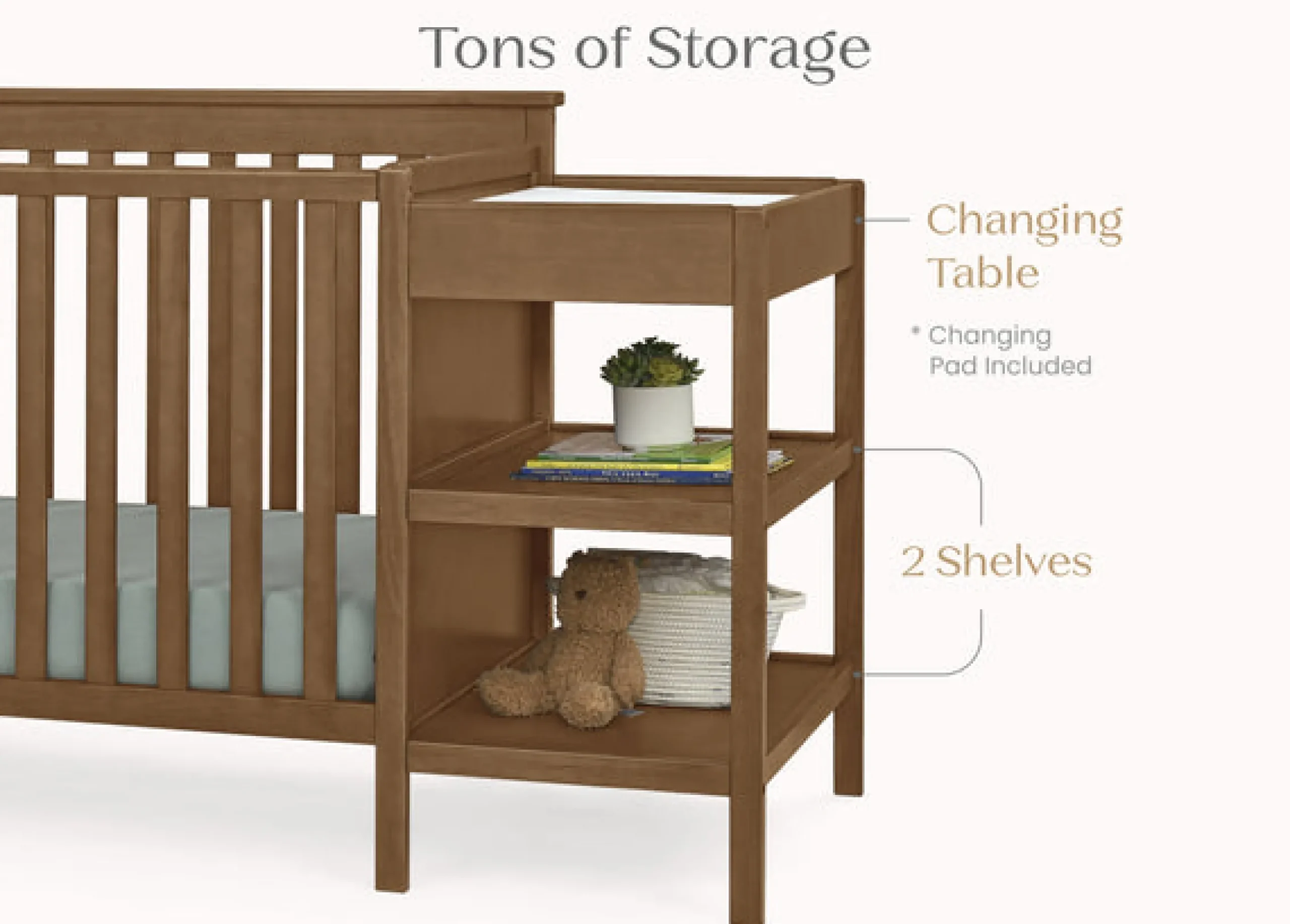 - The attached changing table features two open shelves that provide plenty of storage space for diapers, wipes, and any other necessities