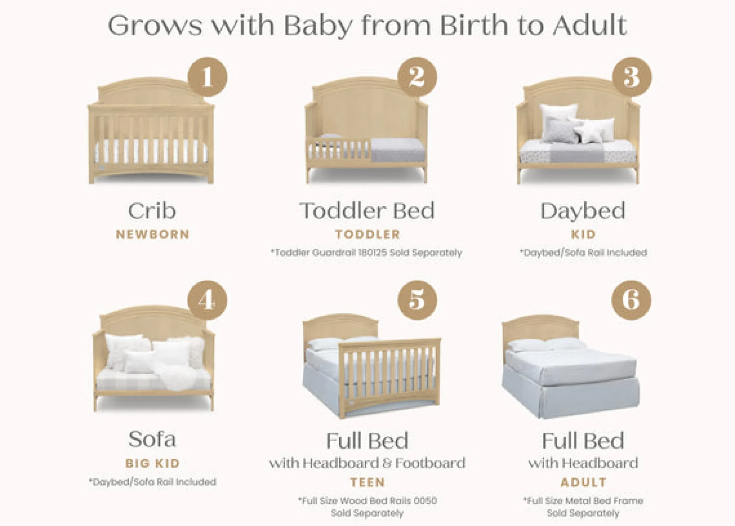 - Converts from a crib with 3 mattress height adjustments to a toddler bed, to a daybed and to a full size bed with headboard & footboard. (Daybed rail included; Toddler Guardrail and crib conversion rails sold separately)