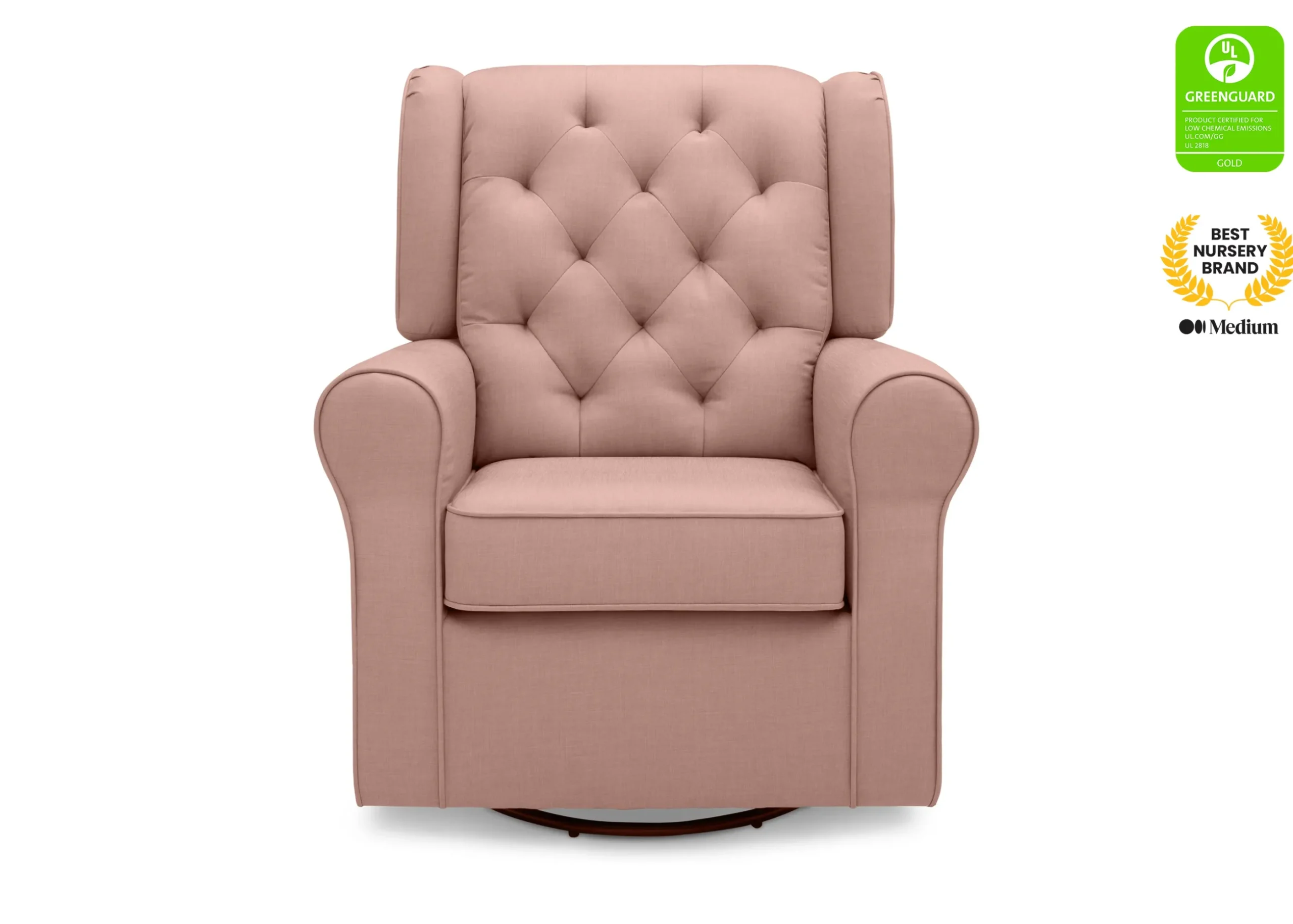 A cozy wingback silhouette with button tufting adds a touch of traditional elegance to your nursery making it the perfect place for story time, feeding, and bonding