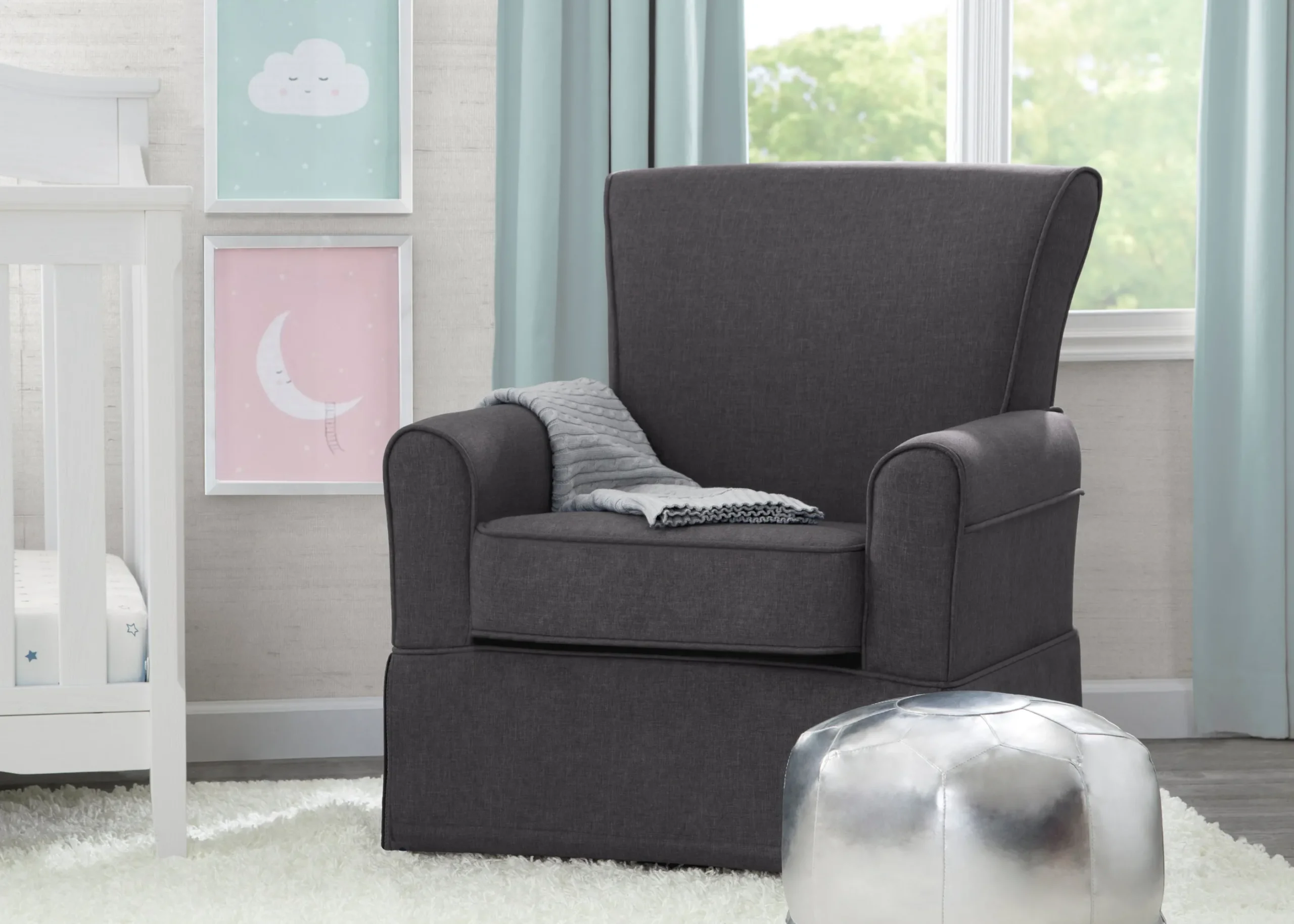 Sure to be the best seat in the house, this chair features a 360-degree swivel and gentle gliding motion that’s perfect for soothing, feeding, and snuggling with your baby