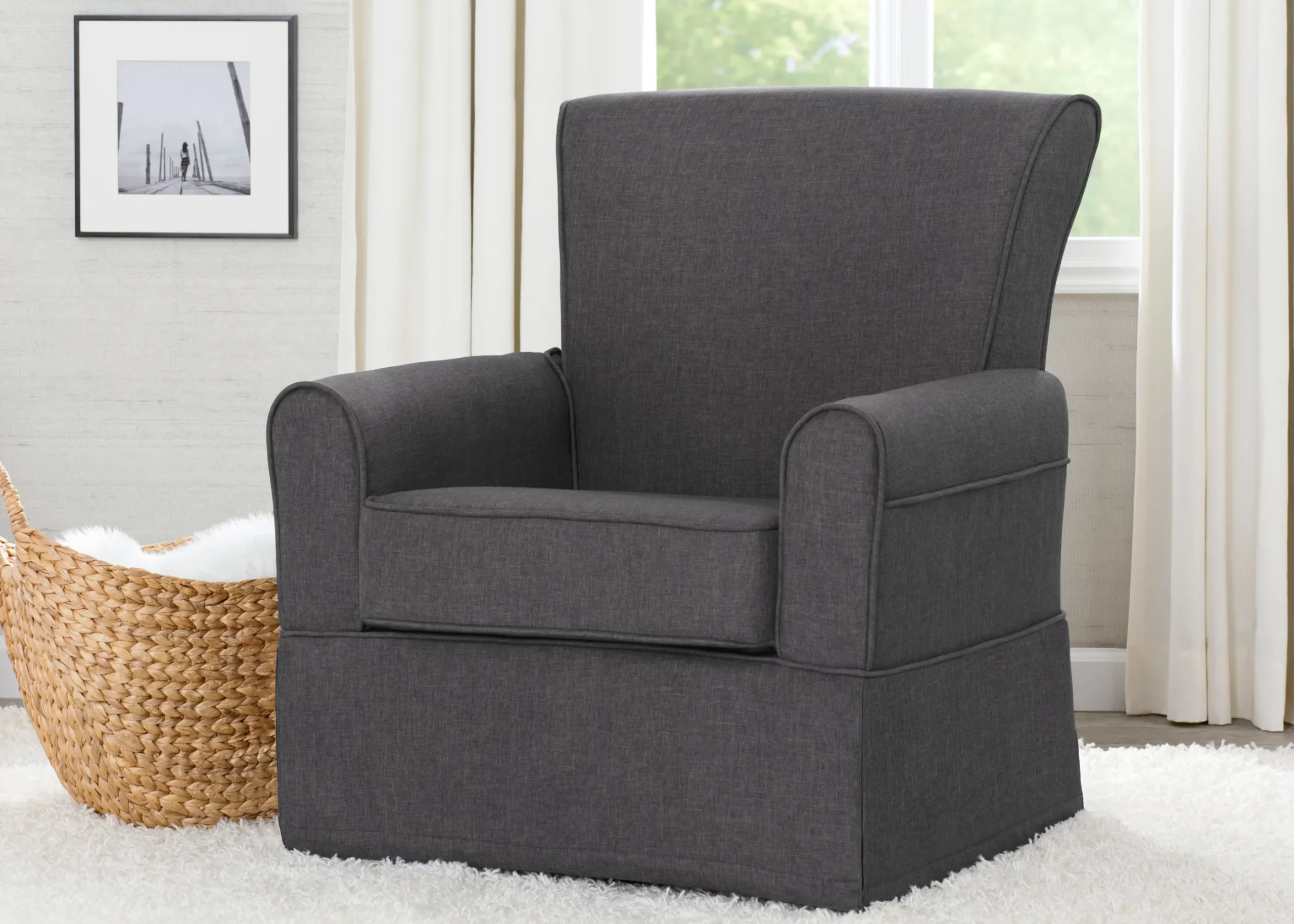 Our Epic Glider is the best plush armchair you can pick for your nursery. The comfortably padded seat rests on a sturdy wooden frame and gently swivels and glides with all-steel mechanisms. Crafted for lasting strength, this glider is a cozy space for you and your baby to relax in