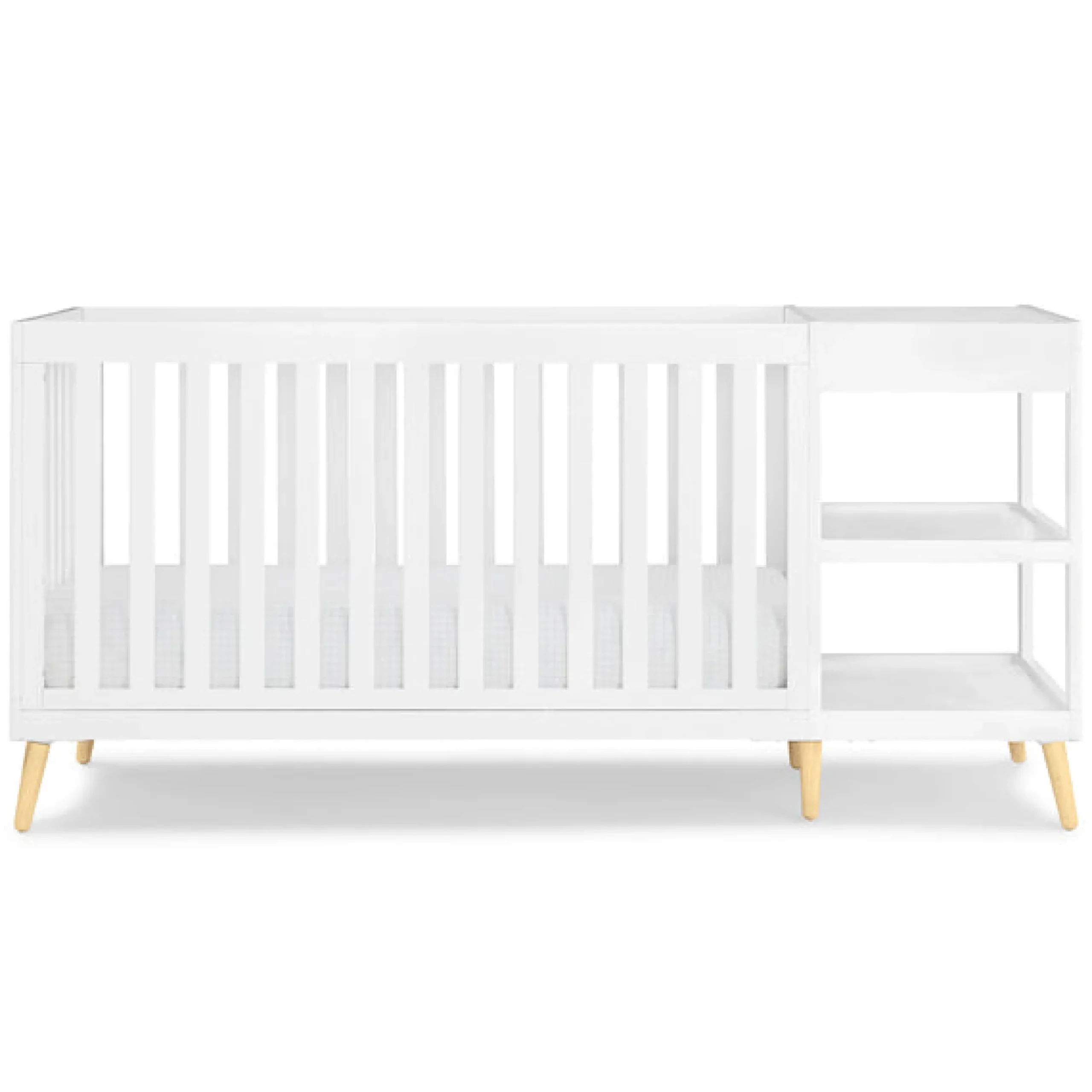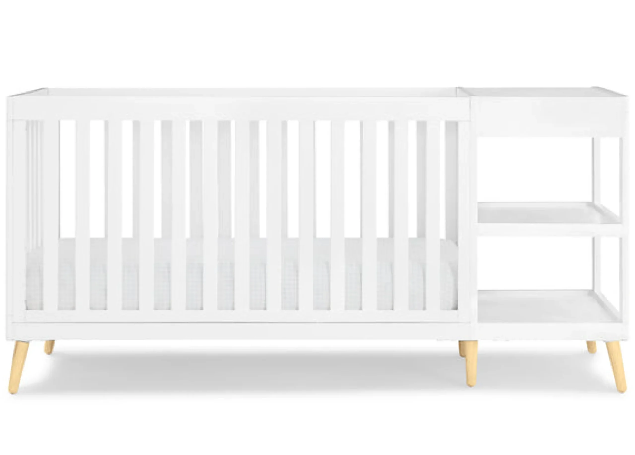 The Essex 4-in-1 Convertible Crib and Changer by Delta Children is designed to elevate modern nurseries. It features gently curved corners and splayed feet for some retro cool style. A versatile crib and changer combo that provides everything you need for baby in one convenient package, this crib features an attached changing table that provides a comfortable surface to change and dress baby, plus two spacious shelves where you can keep necessities nearby. The adjustable mattress height allows this crib to grow alongside your little one—start with the mattress at the highest level, then lower it as your baby begins to sit or stand. Once your child outgrows the crib, convert it to a toddler bed, daybed or sofa (Daybed/Sofa Rail included, Toddler Guardrail W100825 sold separately). To complete your mid-century modern nursery, pair the Essex 4-in-1 Convertible Crib and Changer with other items in the Essex Collection by Delta Children.