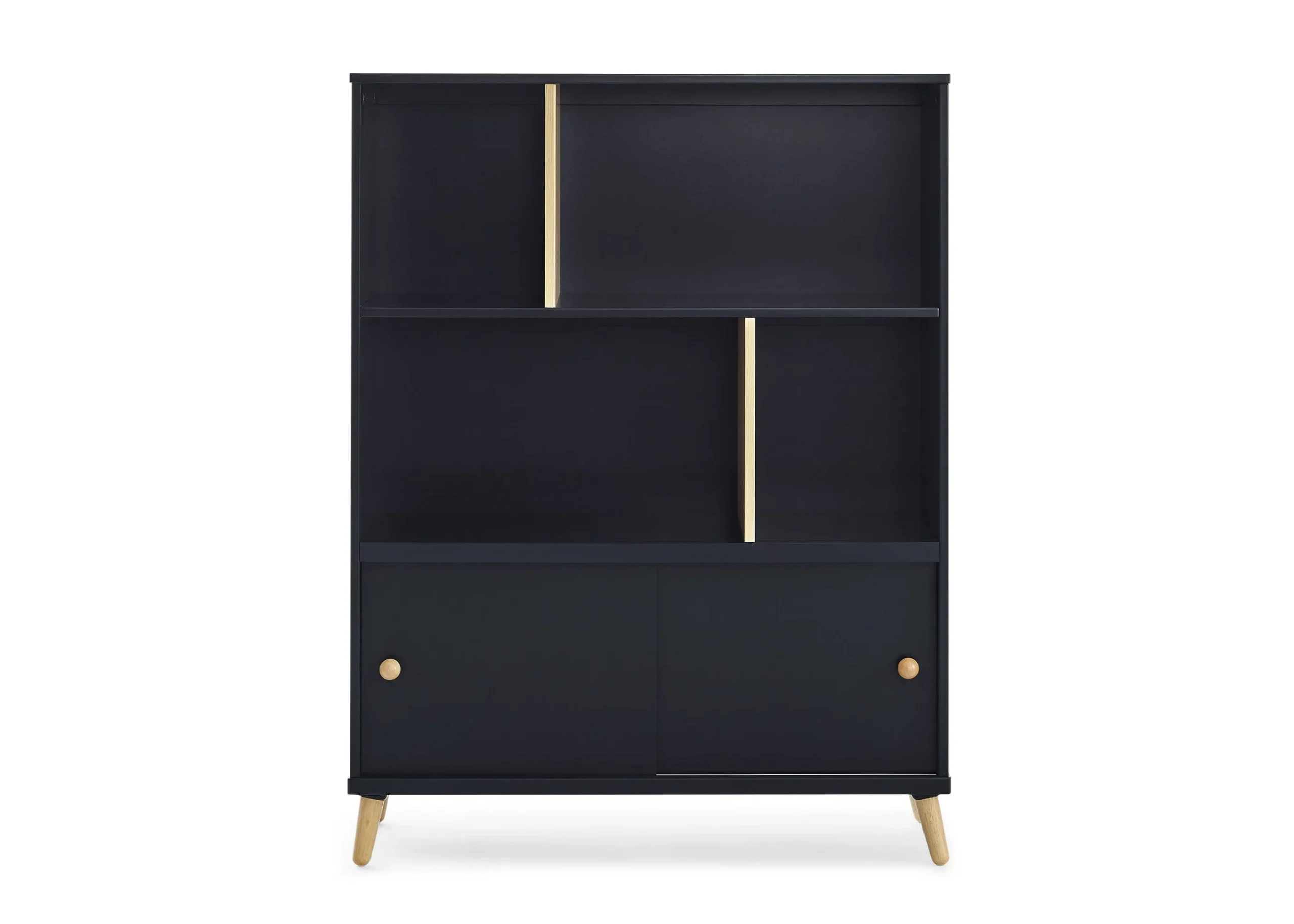 - This bookcase features two shelves with dividers and a roomy storage space behind two sliding doors
