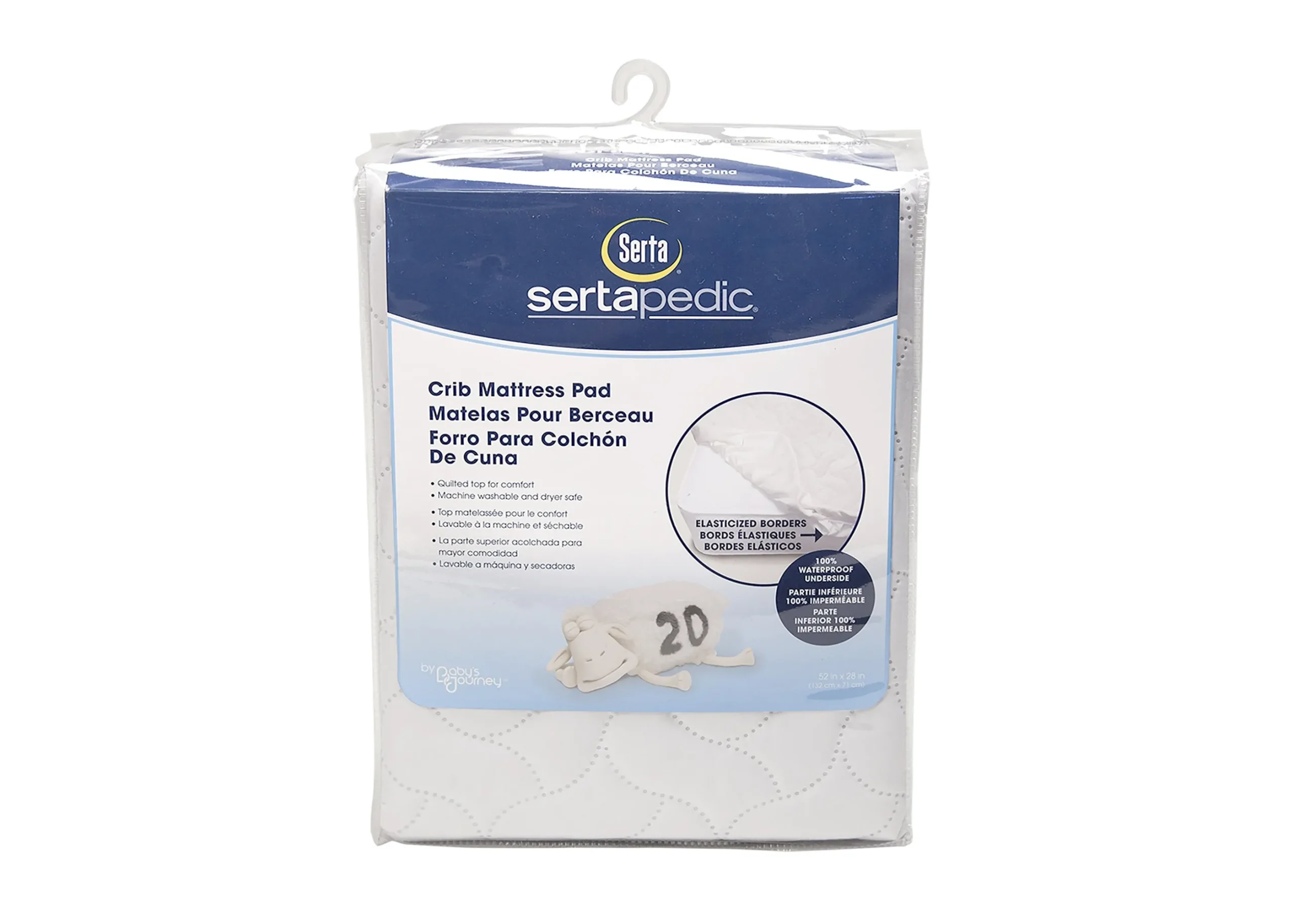 Your baby will enjoy the comfort and protection of Serta’s Sertapedic Fitted Crib Mattress Pad. A quilted top offers baby ultimate cushioned comfort, while a 100% waterproof underside protects the mattress from liquids. Designed to perfectly fit most standard sized crib mattresses, the elasticized corners ensure the pad will stay snugly fit onto the mattress, preventing shifting and sliding. This pad is machine-washable for easy cleaning.