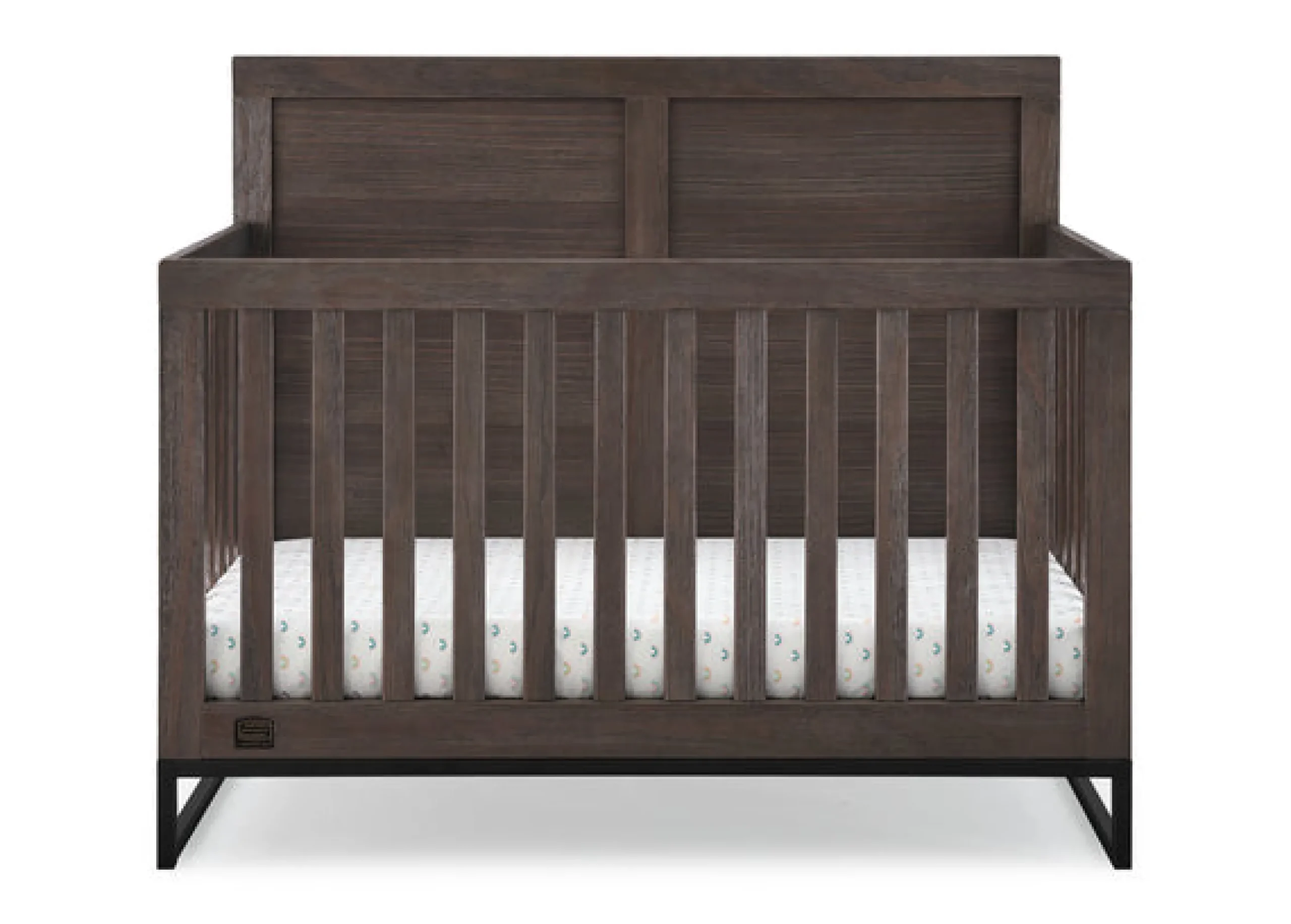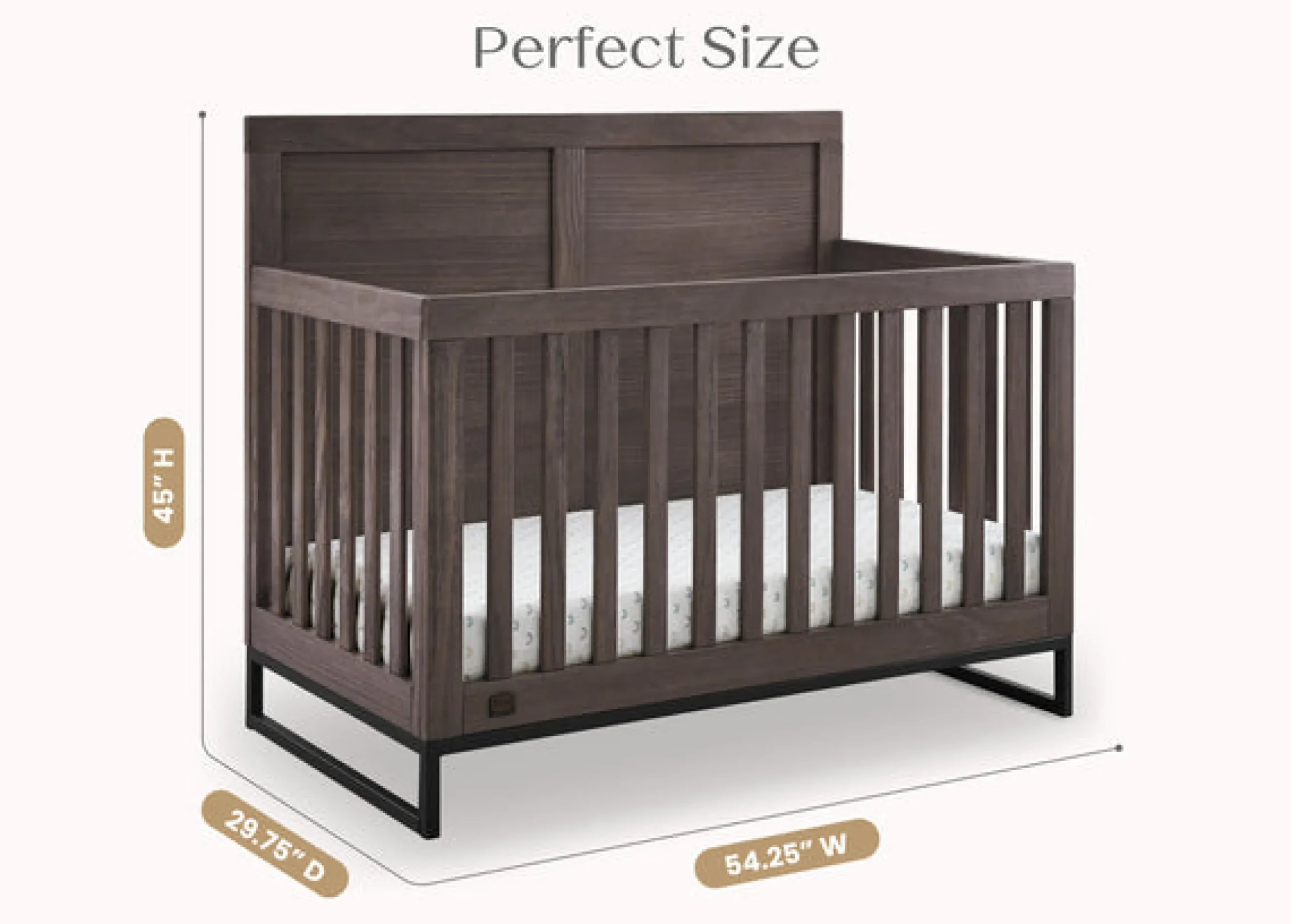 The Foundry 6-in-1 Convertible Crib by Simmons Kids is designed to be a lasting piece of furniture from your child’s baby years well into grade school. A true mix of rustic and modern, this baby crib features a softy textured finish that’s hand applied and a sleek, matte black metal base. The adjustable height mattress allows the Foundry Crib to grow alongside your little one—start with the mattress at the highest level, then lower it as your baby begins to sit or stand. Once your child outgrows the crib, convert it to a toddler bed, daybed, sofa, full size bed with headboard and footboard or full size bed with headboard and low footboard (Daybed/Sofa Rail included, Toddler Guardrail #W343725 and Full Size Bed Rails #330750 sold separately). Given the hand applied nature of this baby crib’s finish, variations in the wood are to be expected and celebrated. To complete your nursery, pair the Foundry 6-in-1 Convertible Crib with the Foundry 4 Drawer Dresser with Changing Top by Simmons Kids.