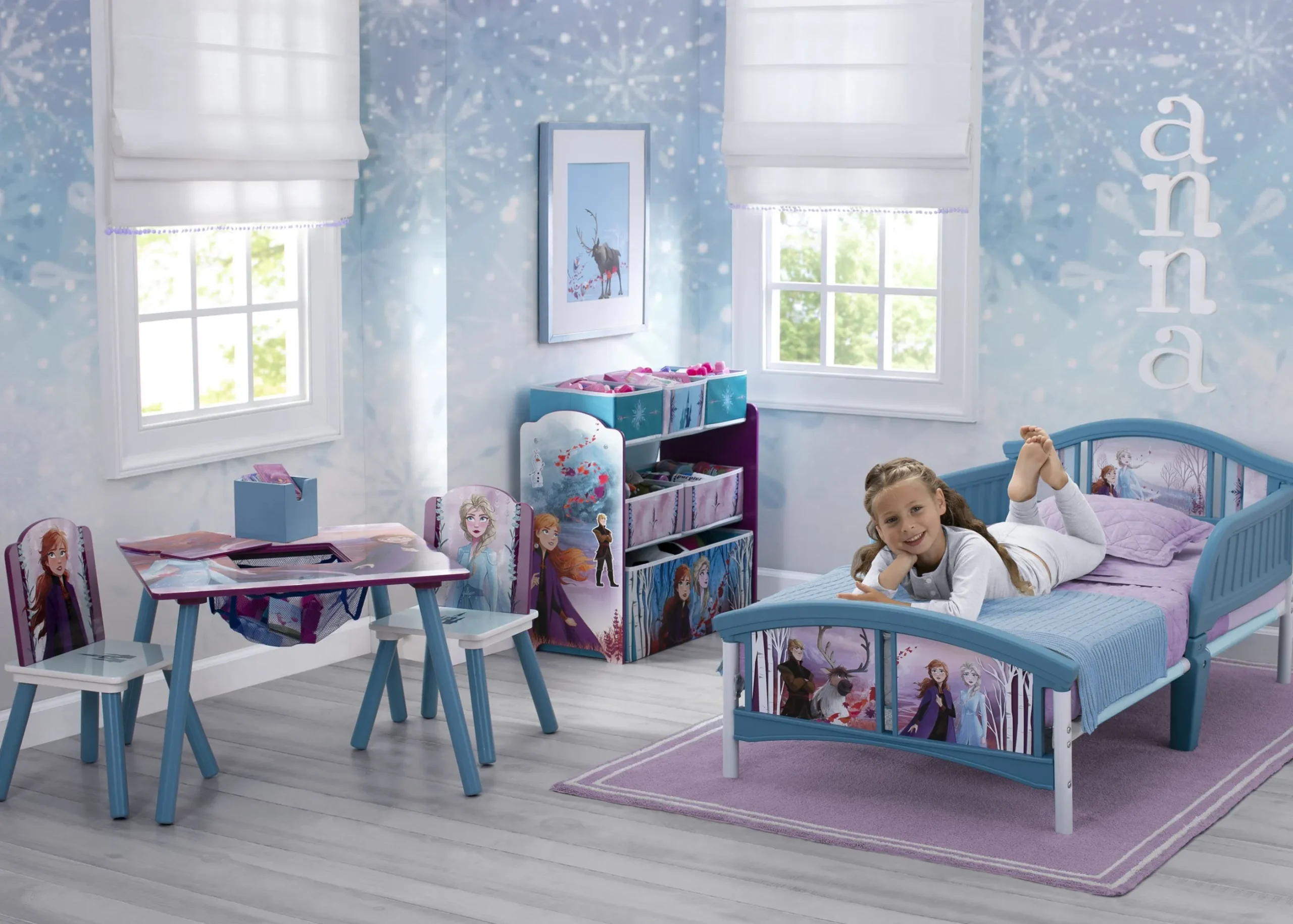 With this Disney Frozen II Plastic Toddler Bed by Delta Children little adventurers will (snow) drift off to sleep. Accented with colorful decals of Anna, Elsa, Kristoff, Sven and other Frozen-inspired graphics, this icy blue kids’ toddler bed brings a flurry of enchantment to any bedroom. The bed’s low height and attached guardrails make it a safe option for your child’s first big-kid bed. Get this toddler bed today and bring home the magic of Frozen II!