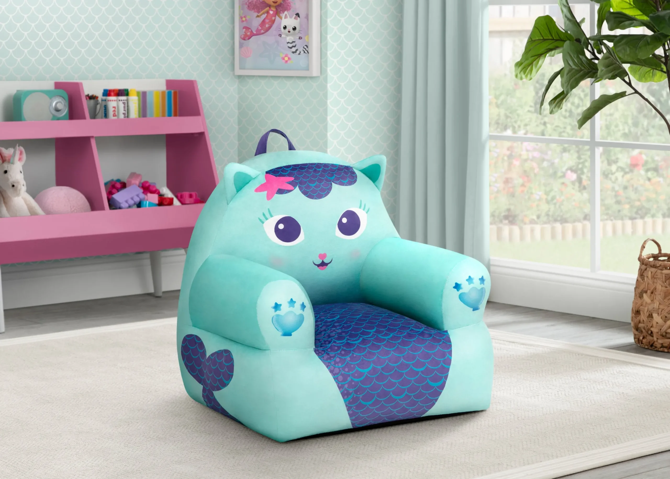 This plush chair features Gabby’s cat-tastic friend, MerCat, and showcases her three-dimensional ears