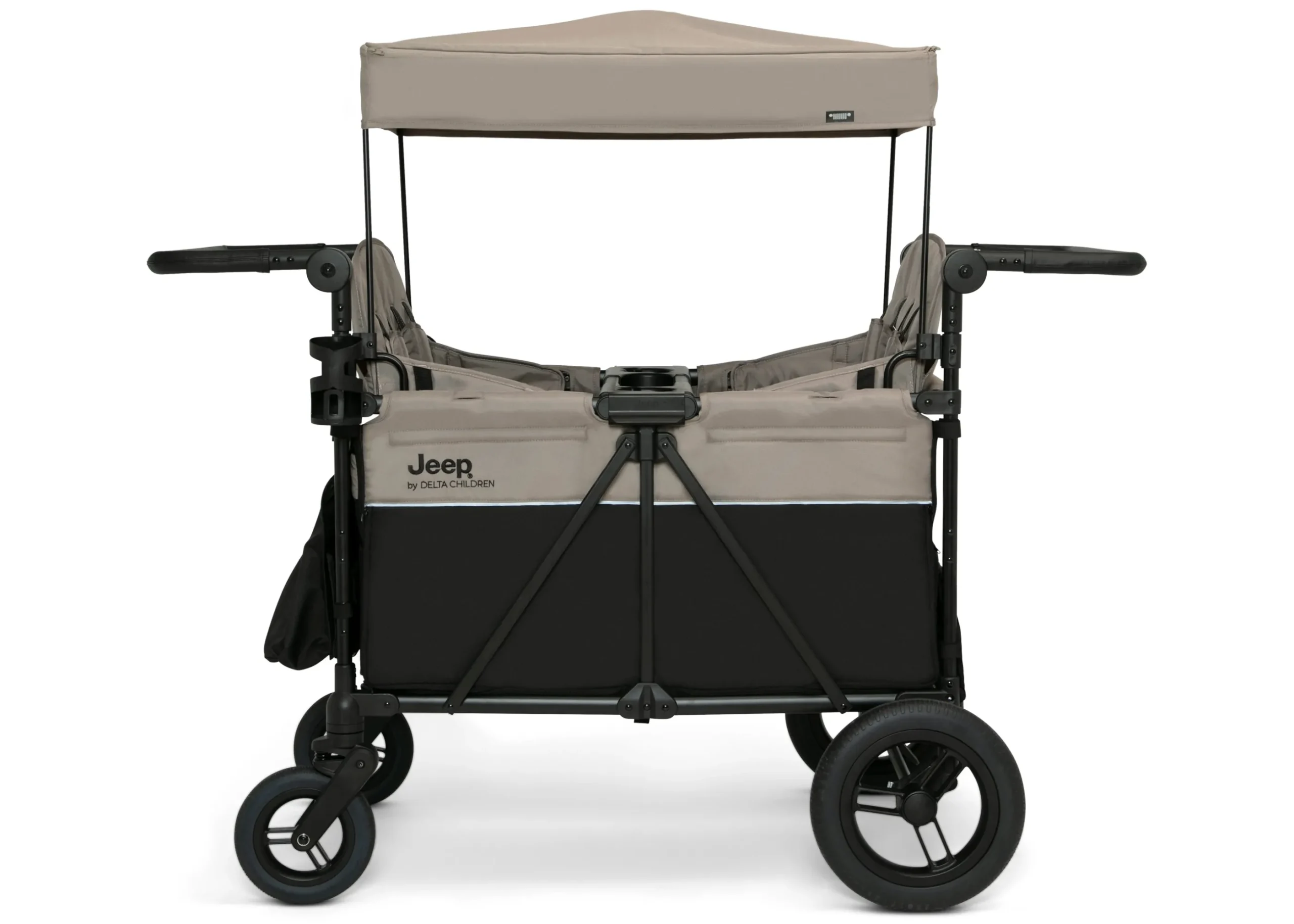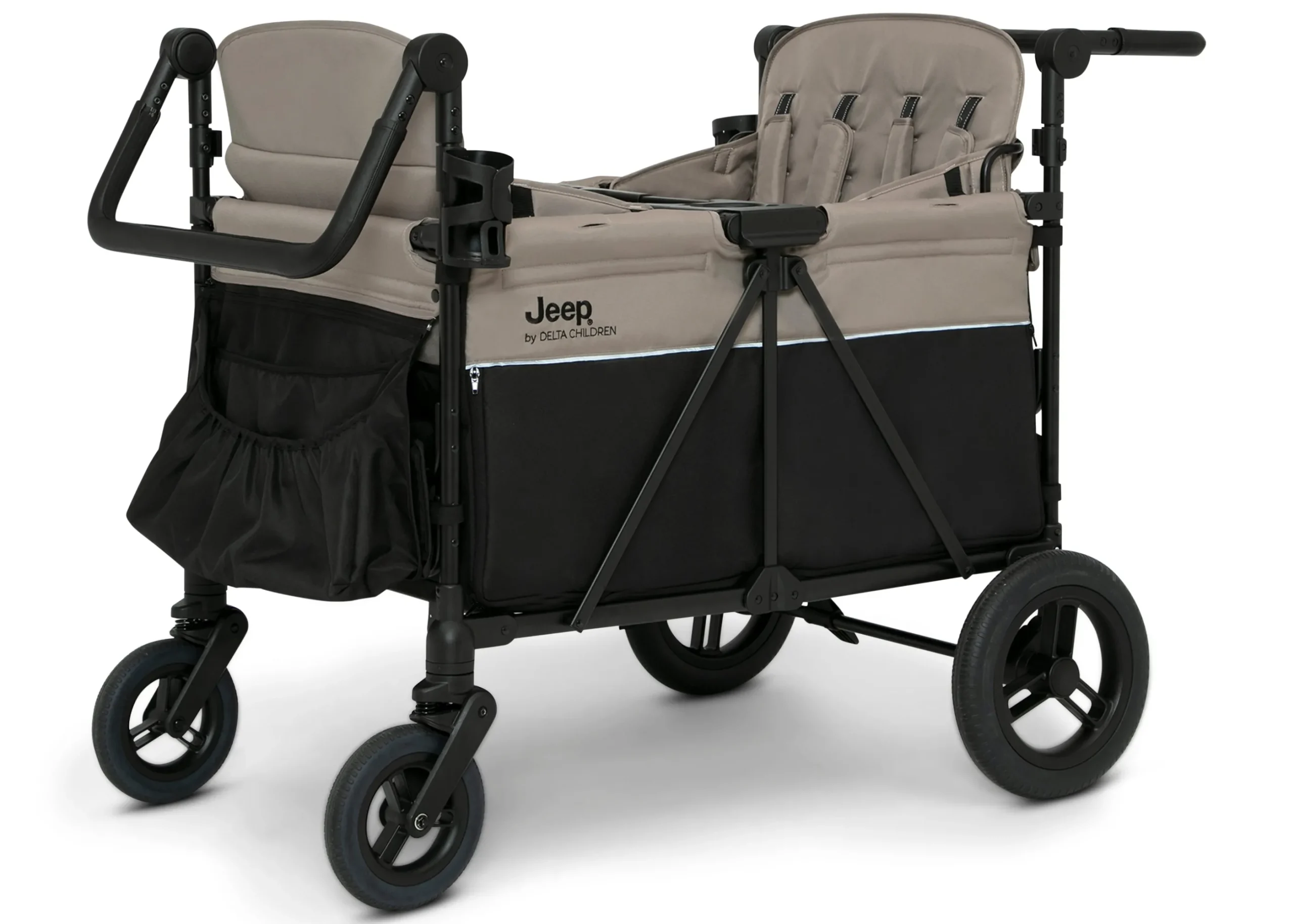 The Jeep Gladiator 4-Seater Stroller Wagon includes everything you love about Jeep wagons with room for four passengers, so you can bring the whole family along for the ride. This XL wagon is the first-of-its-kind convertible wagon that offers a range of spacious seating options to accommodate up to four children—both seats can face forward, both can face backwards, both can face inwards, both can face out in different directions, or you can remove the seats completely and use the wagon to carry all your gear. Easy-access drop-down rail lets kids get in and out easily and helps provide extra legroom. Outfitted with a multitude of convenient features to help accommodate and entertain your larger crew, this wagon comes with a removable canopy that has roll down mesh screens for ventilation or black out privacy for on-the-go naps. Take advantage of the wagon’s expansive storage. The wagon features storage pockets, zippered storage compartments under the seats, kids snack tray, plus two parent cup holders. Two adjustable leatherette handlebars ensure a comfortable grip for parents of all heights, while the large, puncture-proof tires provide a smooth ride on any terrain. The wagon’s flat fold makes it easy to store and transport. It’s the perfect all-in-one solution for growing families. Plus, it’s GREENGUARD Gold Certified, which means it’s built to contribute to air for a healthy environment. Recommended for 6 months to 42″ and holds up to 50 lbs. per seat, 200 lbs. total.