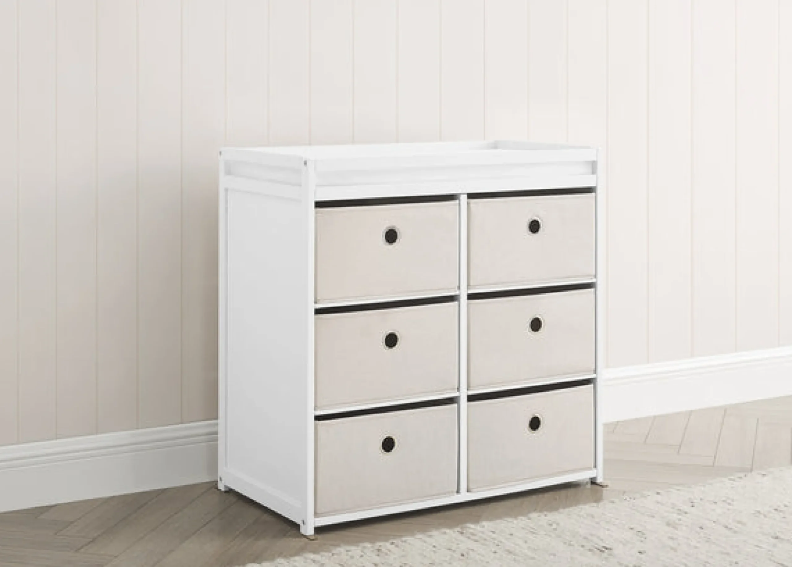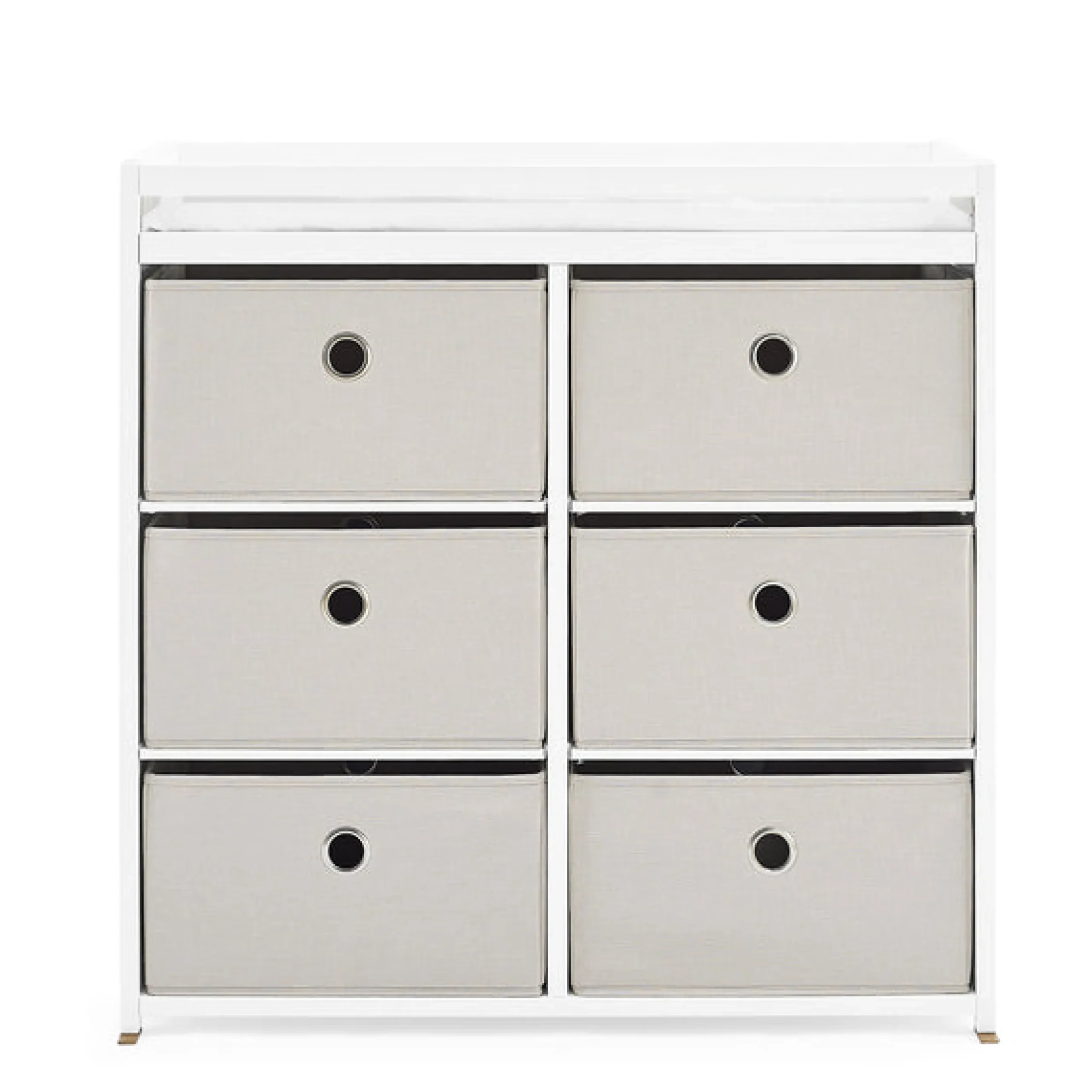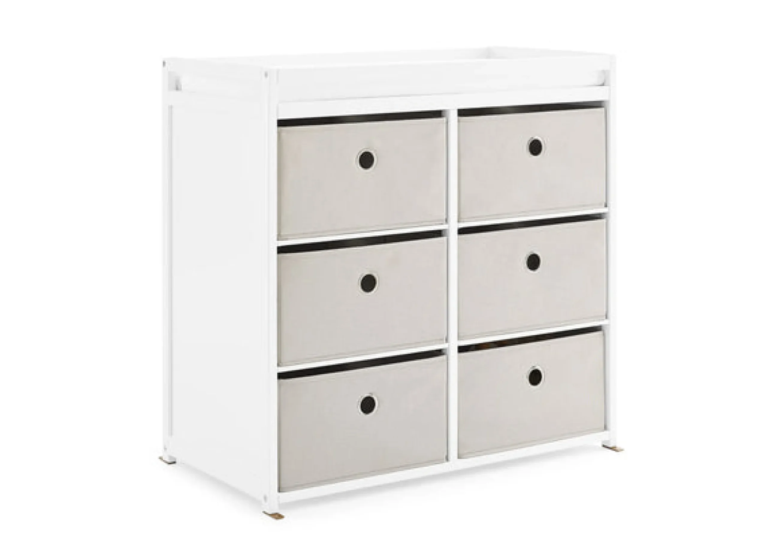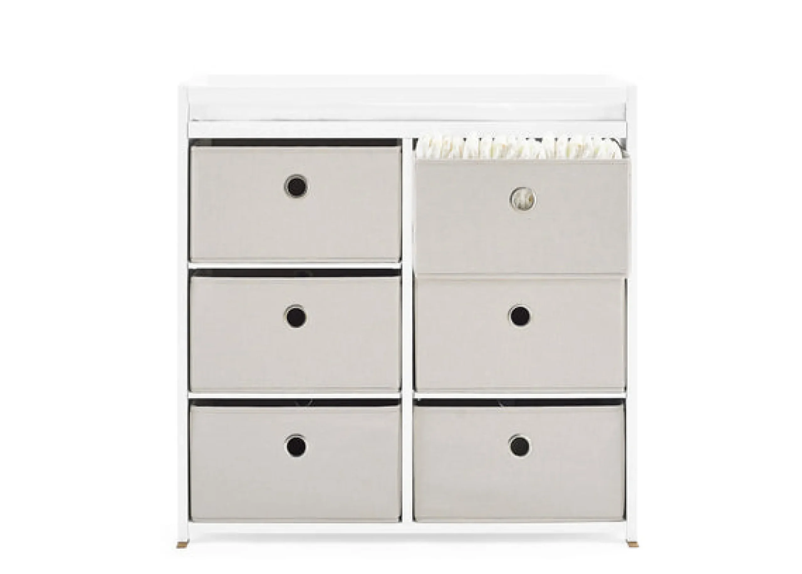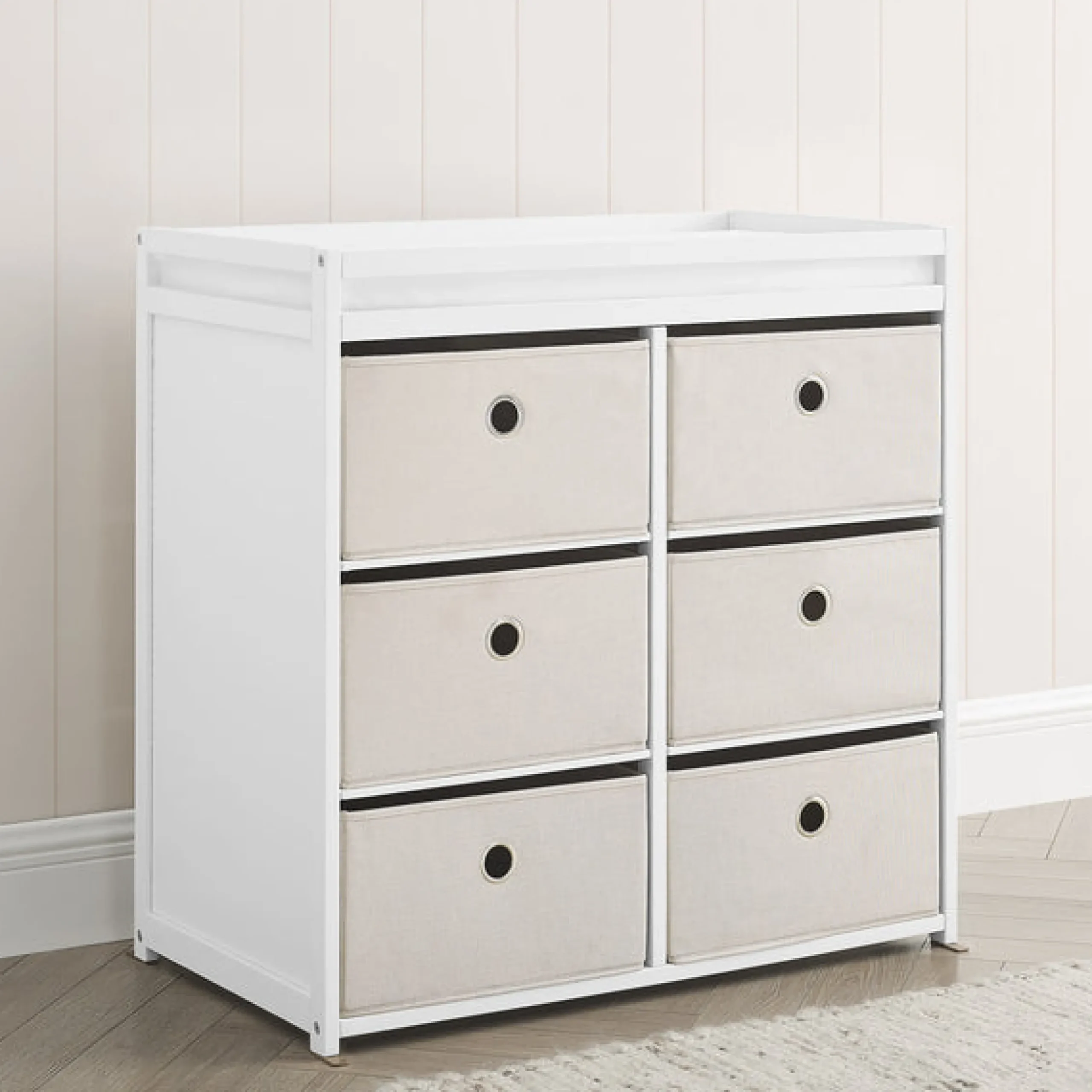 This changing table features 3 shelves with 6 fabric bins to keep baby changing needs close by
