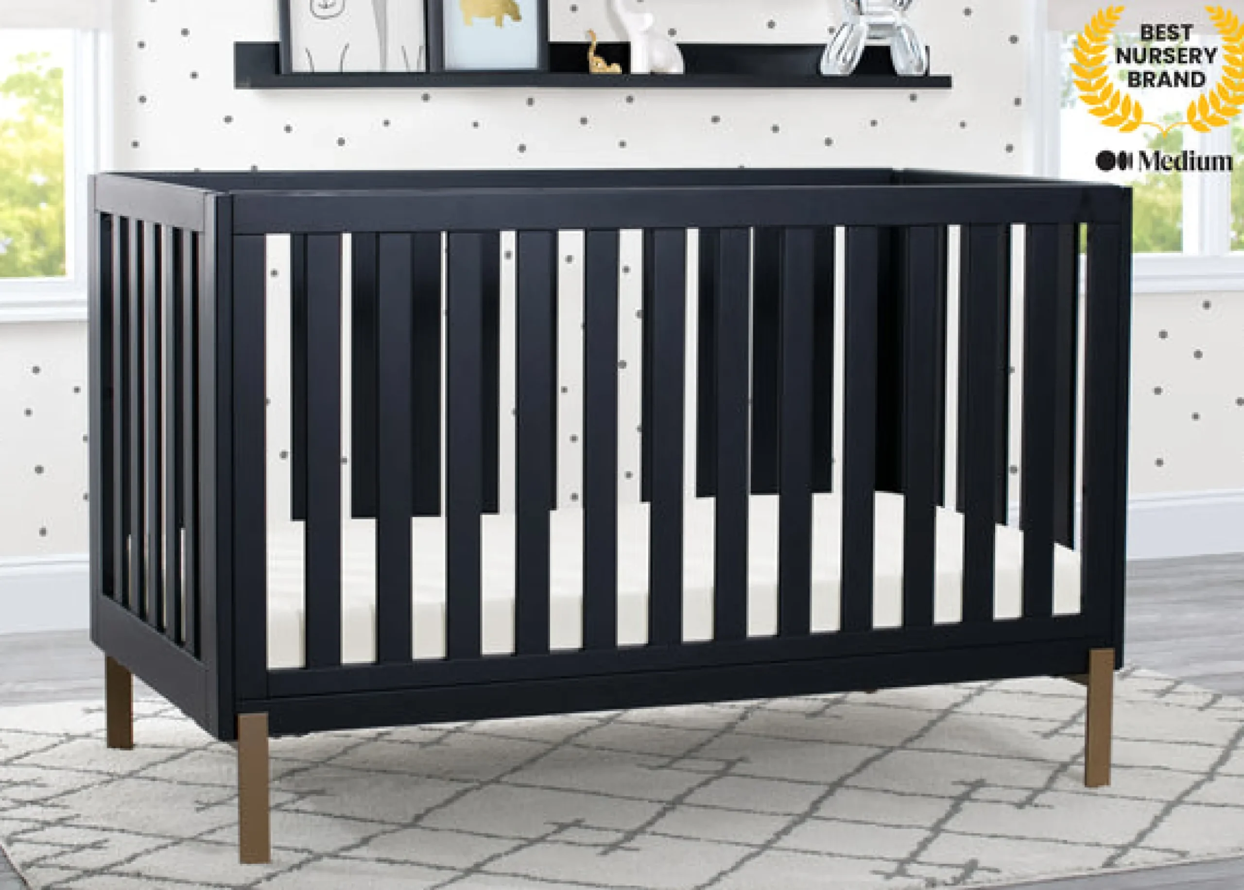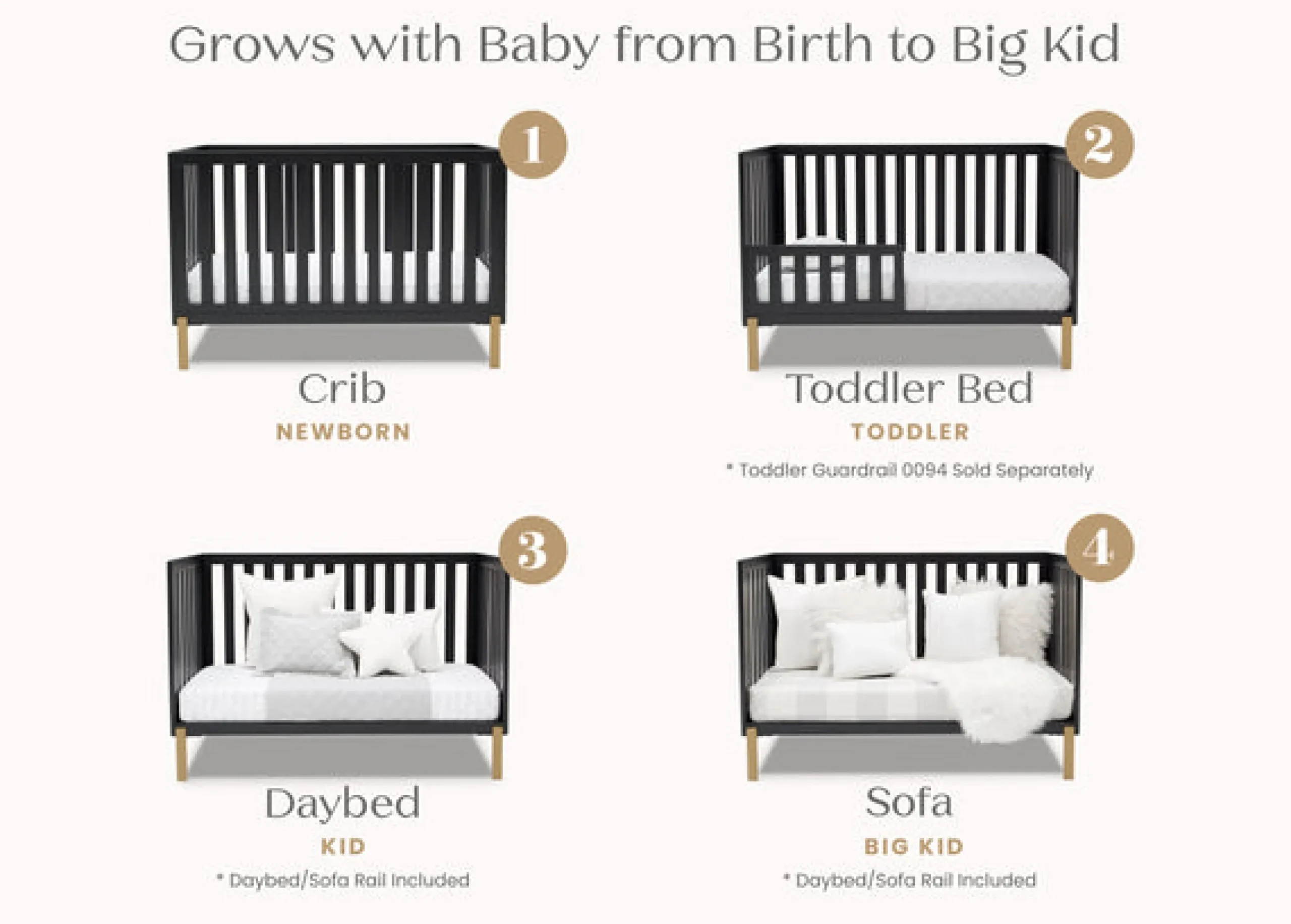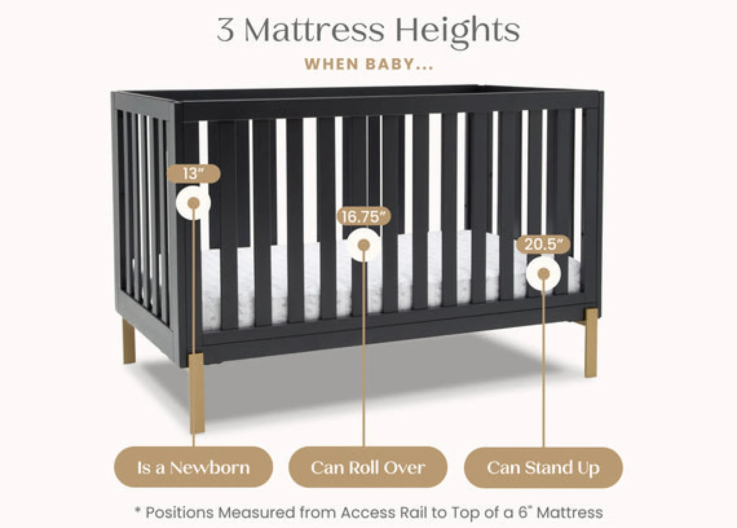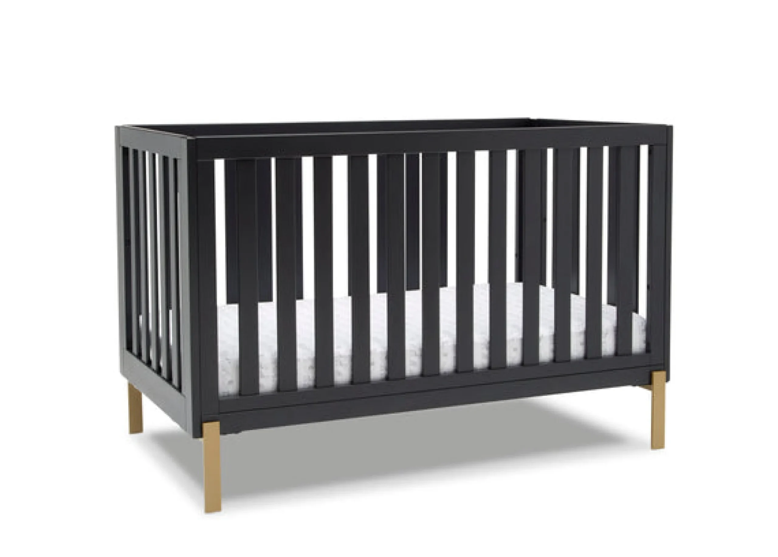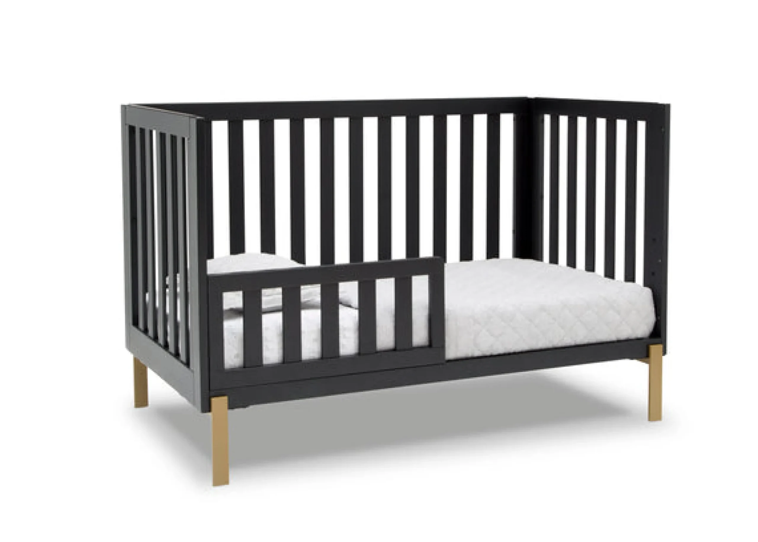 Shake things up in your nursery with the mixed material design of the Hendrix 4-in-1 Convertible Baby Crib by Delta Children. The pine wood construction brings warmth while the shiny bronze legs add a modern, rock and roll flair. Designed to accommodate your growing child, this crib features a three-position adjustable mattress support. Set the mattress at the highest height for your newborn baby, and lower when they begin to sit or stand. And thanks to an easy-to-use Toddler Guardrail #0094 (sold separately), this crib isn’t just a bronzed beauty, it’s the only bed your little one will need. Transform it into a toddler bed when the time is right, and then to a stylish daybed when they’re ready for a little more independence. Underneath the crib there’s enough space to fit the coordinating Under Crib Storage Drawer #W100950-130 (sold separately).