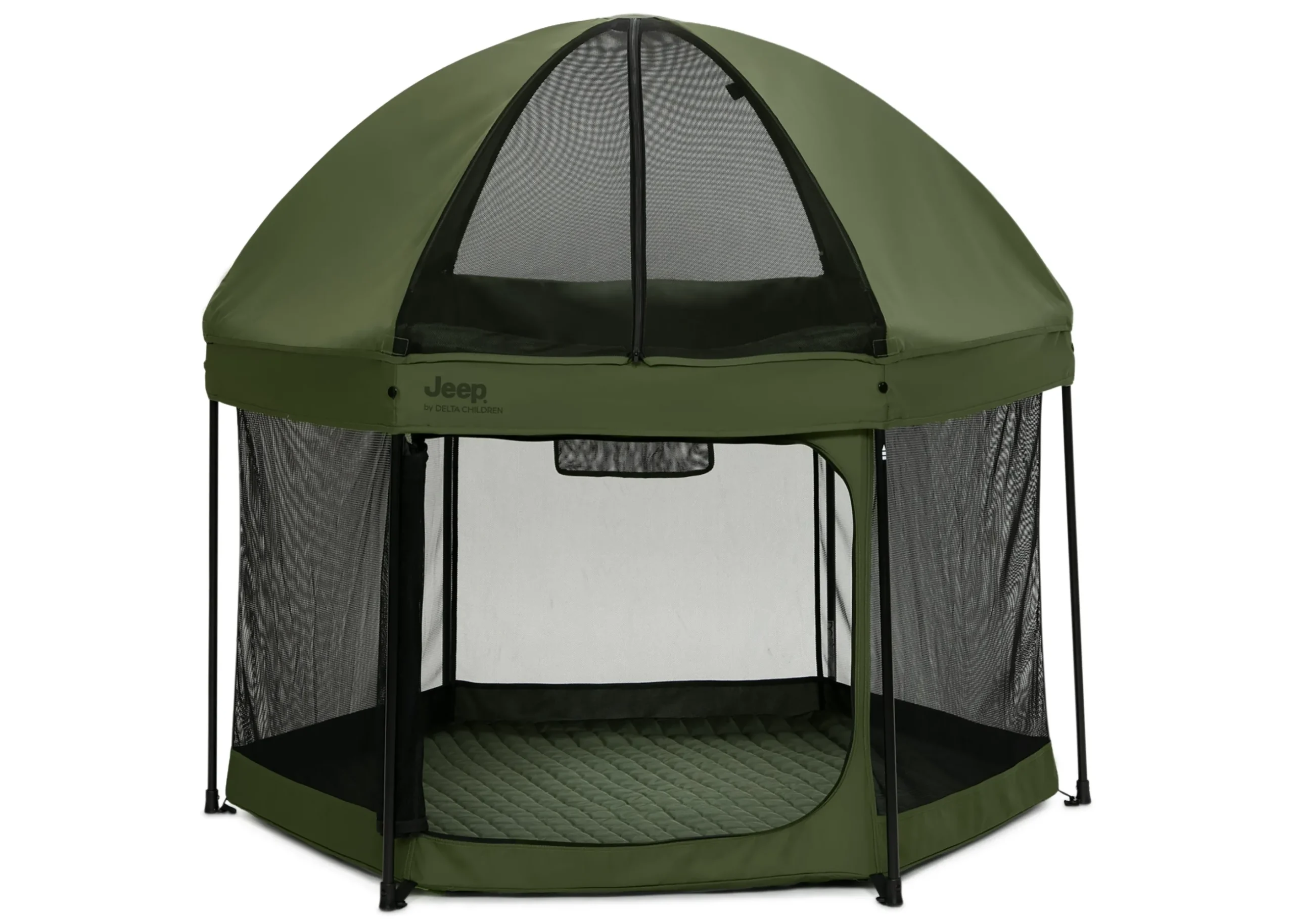 Adventure awaits with this Jeep Hexagon Pop Up Play Yard with Removable Canopy by Delta Children. A premium indoor and outdoor baby playpen, this play yard will be your baby’s portable haven of fun and safety! The lightweight, pop-up design allows you to set up or fold in seconds and the included carrying bag makes travel or storage easy. This portable, water-resistant play area keeps your child in a safe, nearby space whether at home or on the go. Even on a sunny day, the fully removable canopy offers protection from the sun by blocking harmful UVA/UVB rays with UPF 50+ protection. Airy mesh netting on all six sides allows for maximum ventilation and provides a clear view. Perfect for playtime on the go, use the Jeep Hexagon Pop Up Play Yard with Removable Canopy in the backyard, back country, beach or beyond.