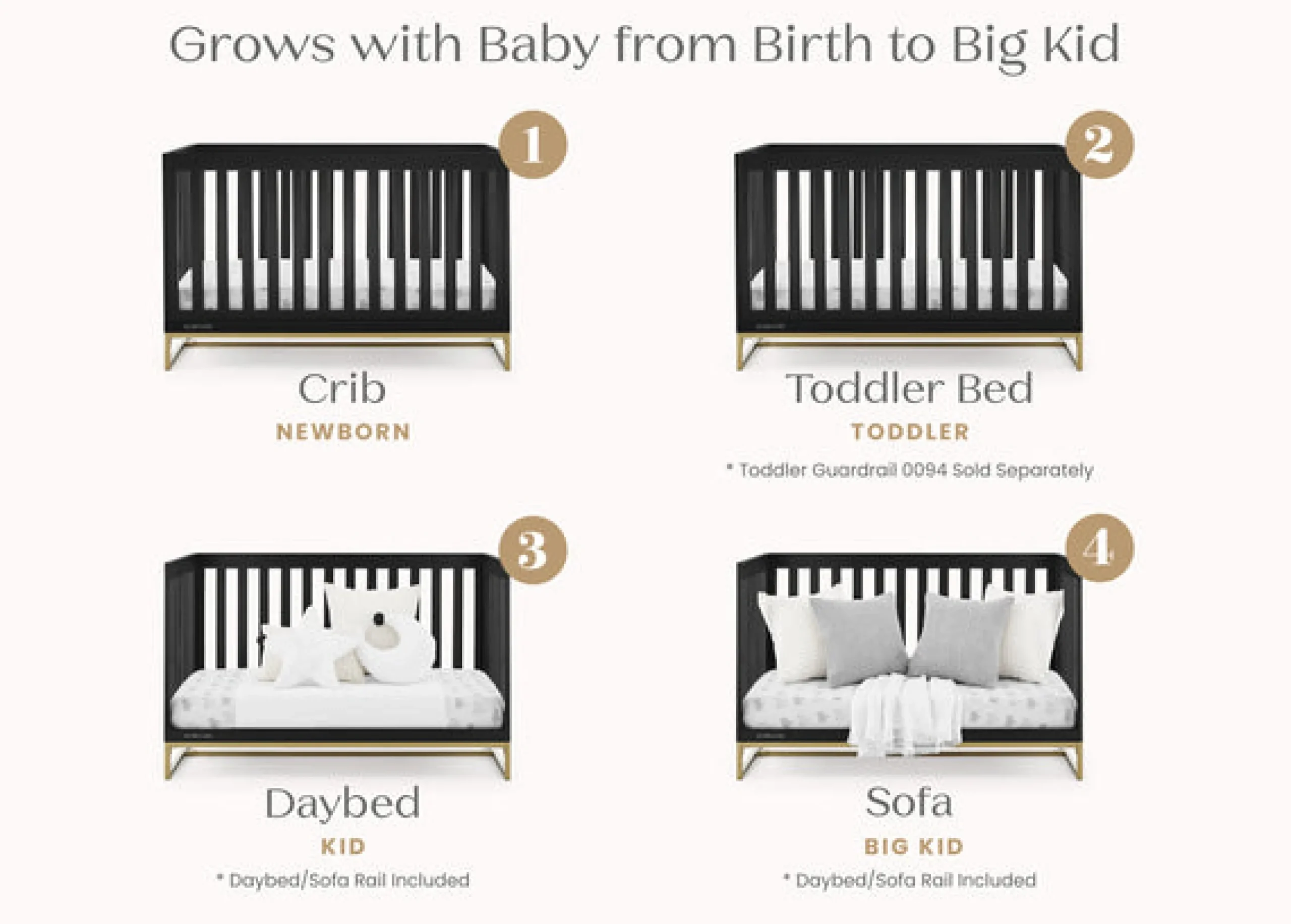 The Jade 4-in-1 Convertible Crib is the new gold standard for modern nurseries with its gorgeous bronze metal base.