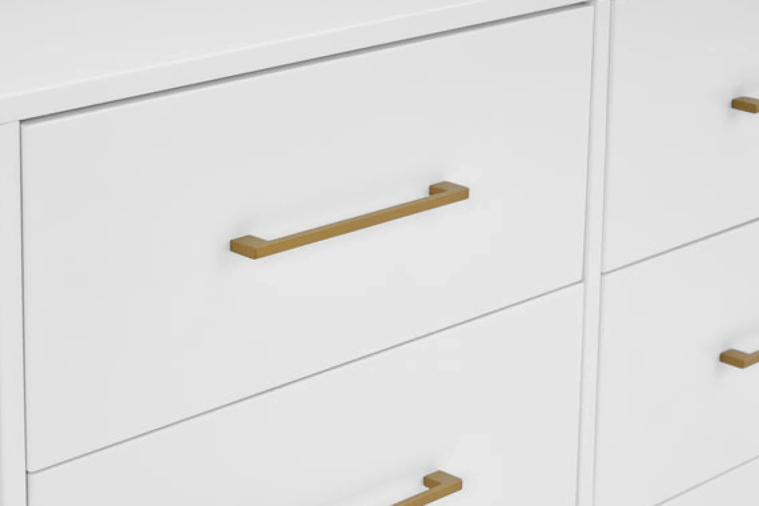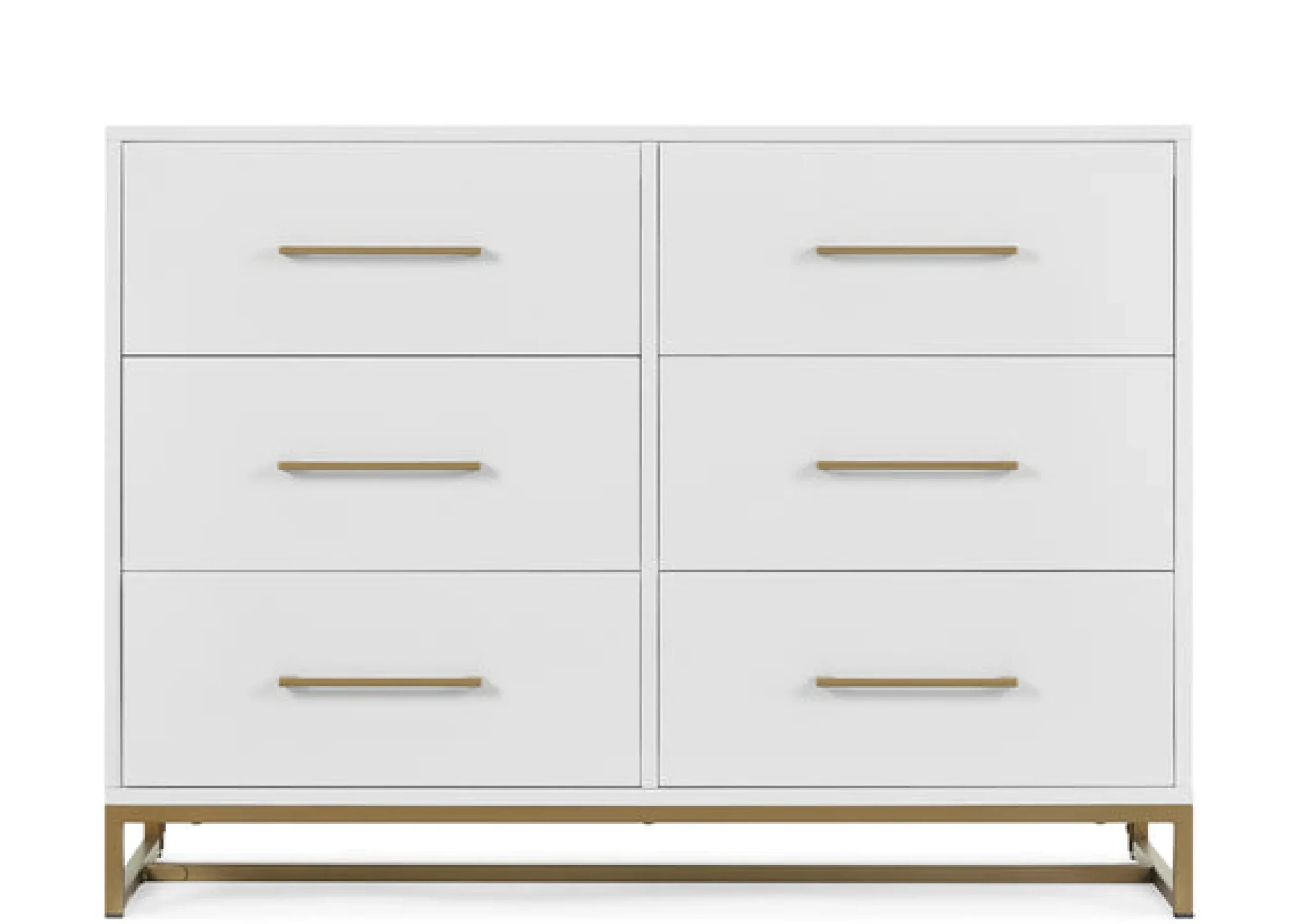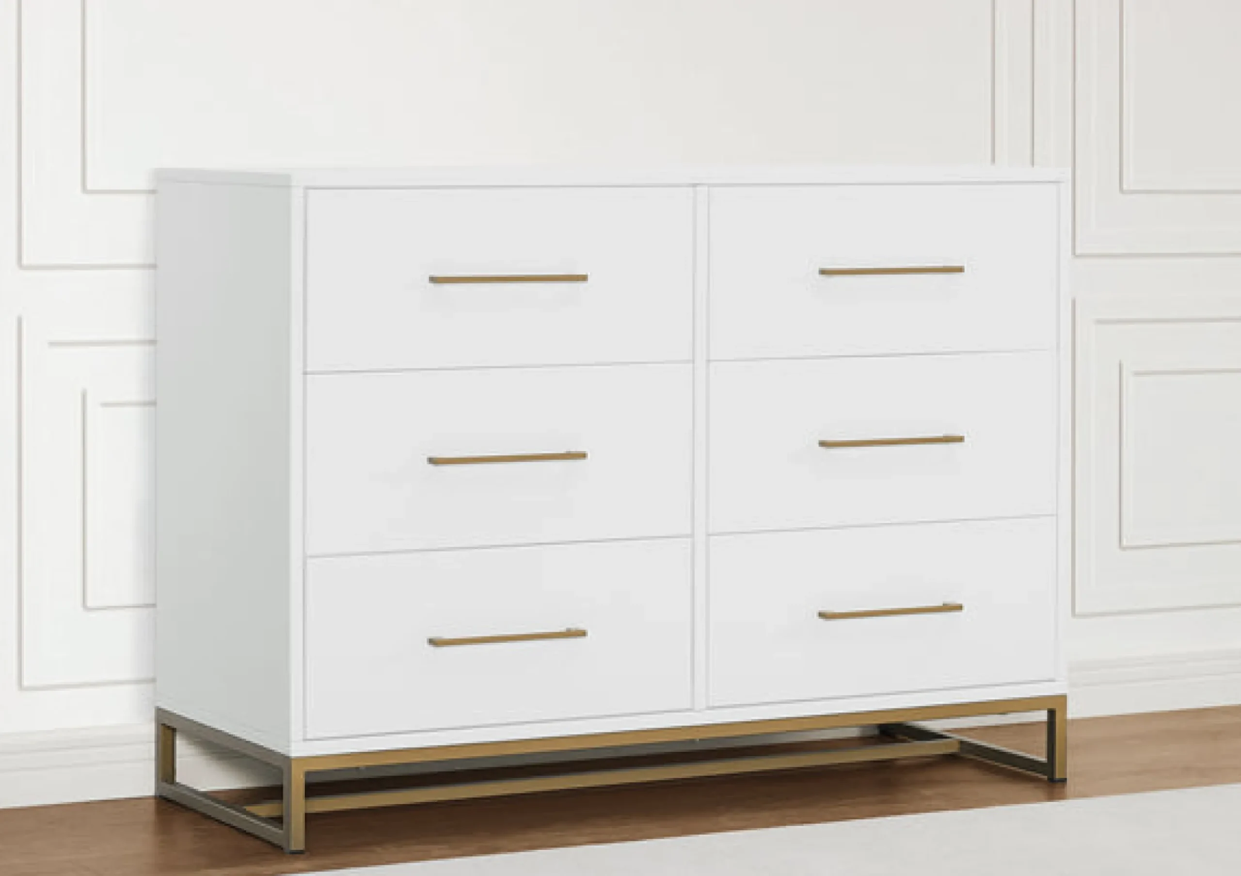 The Jade 6 Drawer Dresser with Interlock Drawer System by Delta Children is the new gold standard for modern nurseries or bedrooms. A standout piece for years to come, this spacious dresser features melted bronze hardware and base for a sleek, stylish look. For your child’s safety, this dresser is outfitted with an interlocking drawer system that limits the number of drawers that can be opened at one time. The Jade 6 Drawer Dresser with Interlock Drawer System by Delta Children is available in Black Ebony and Bianca White. To complete the look, pair this dresser with other items in the Jade Collection by Delta Children. This dresser is tested to meet the current requirements of ASTM F2057, the mandatory CPSC safety standard that protects young children from furniture tip-over incidents. For your children’s safety, only purchase dressers that comply with this standard. For additional security, Delta strongly recommends that all dressers in your home be anchored; all Delta dressers include a wall anchor. To learn how to properly secure your dresser, please see the product assembly instructions or visit our website.