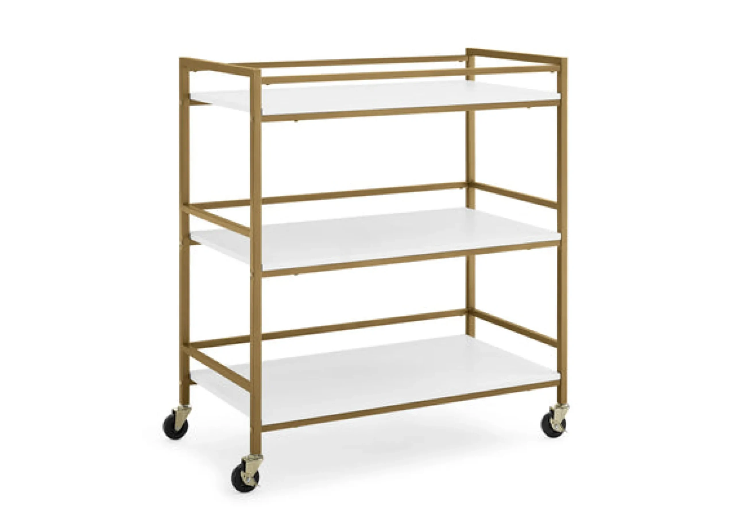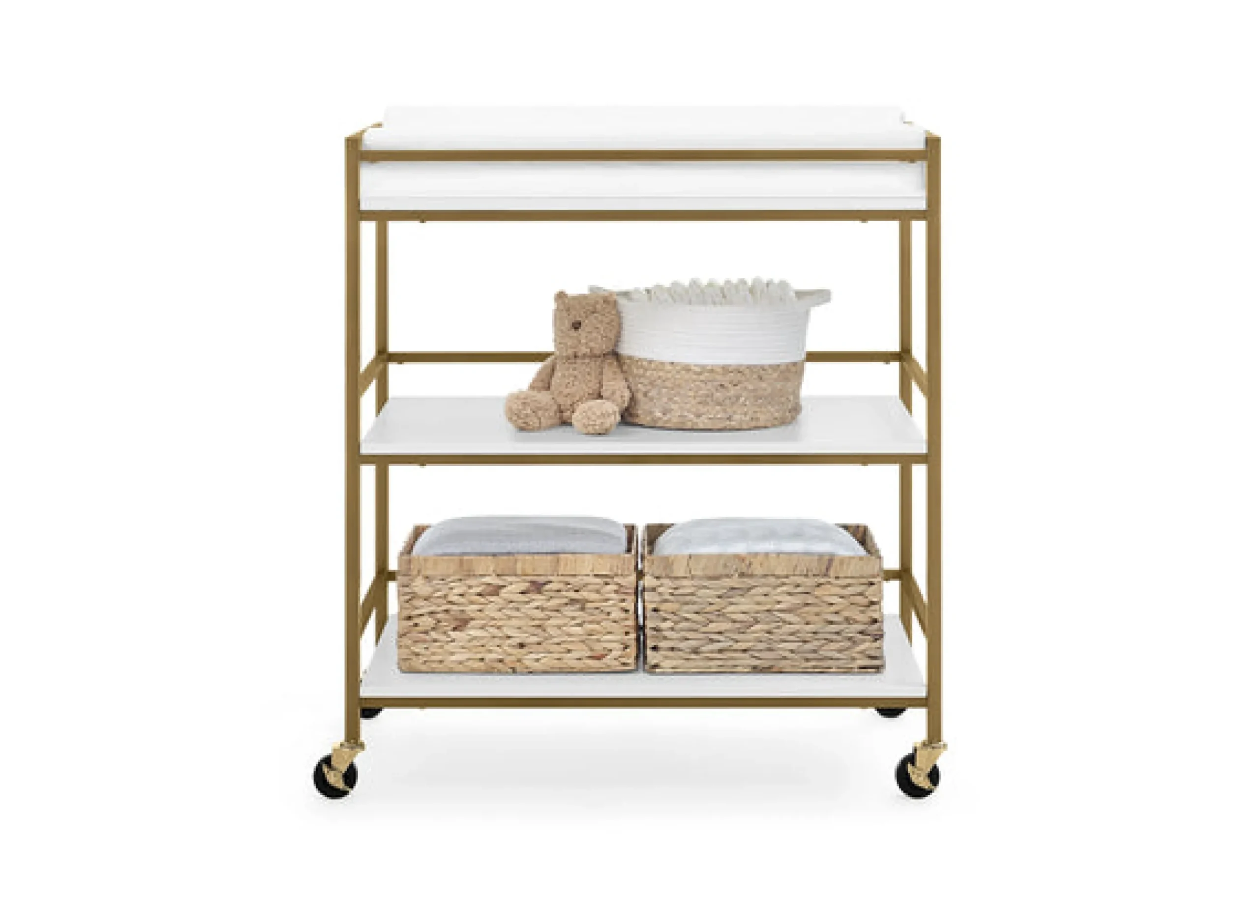 The Jade Changing Table by Delta Children is the new gold standard for modern nurseries with its gorgeous bronze metal frame. A standout piece for years to come, this changing table can later be used as a storage piece or bar cart