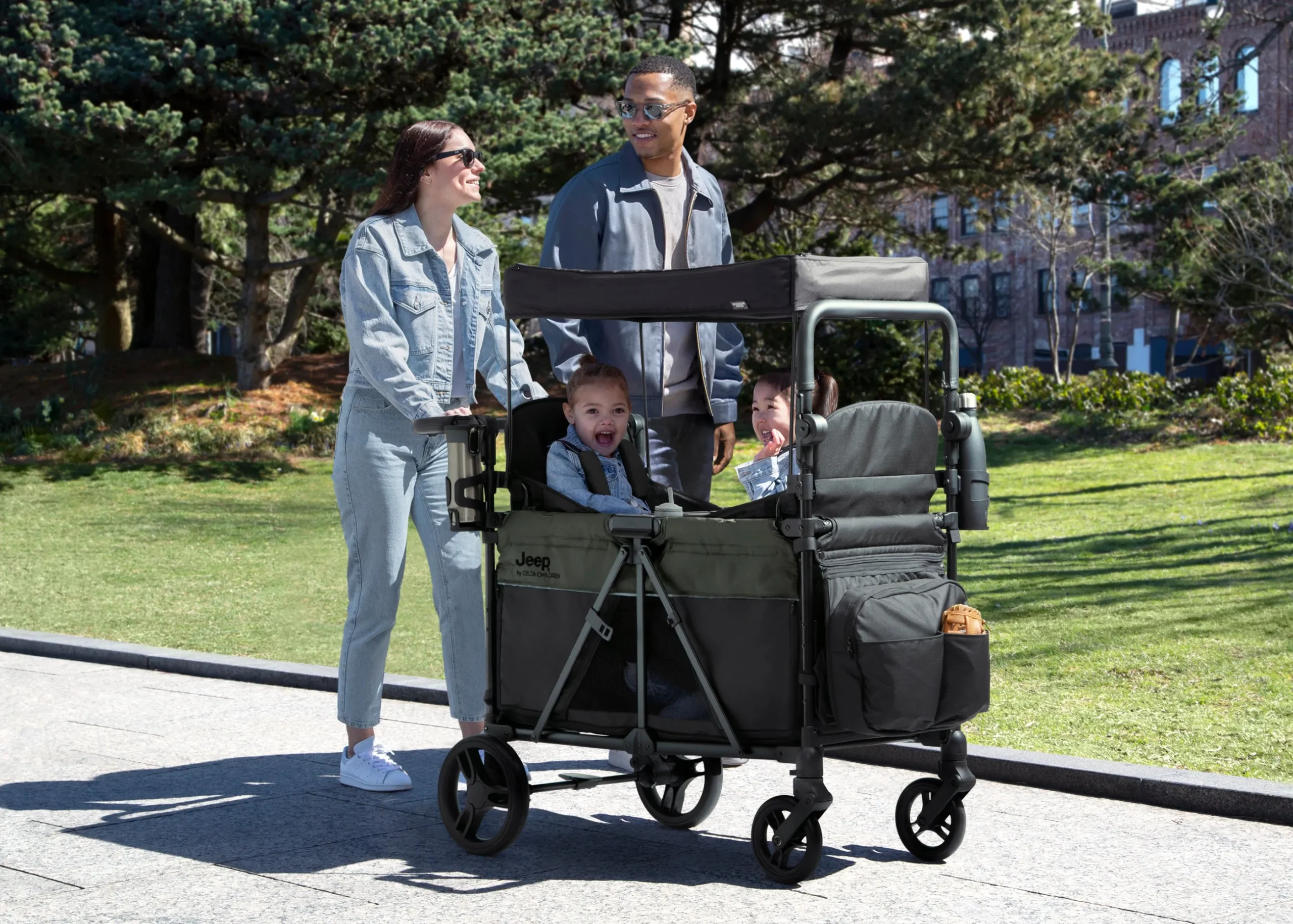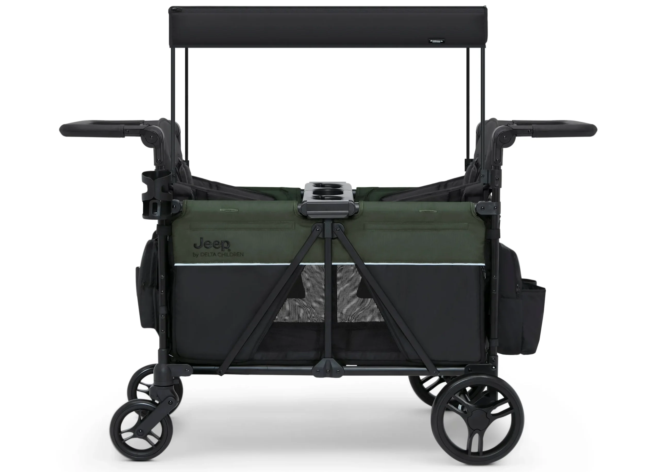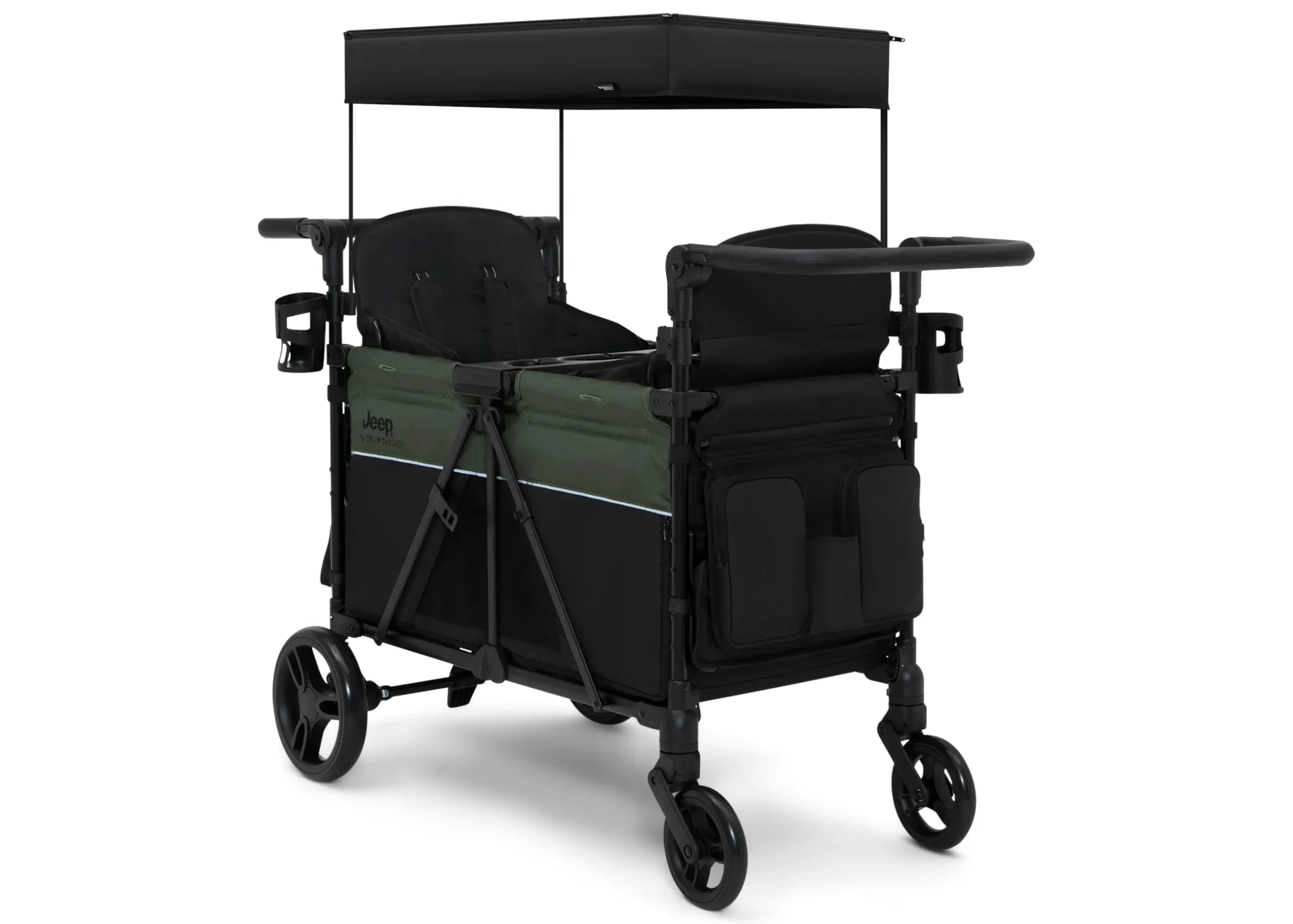 From park strolls to grocery store runs, the Jeep Aries 2-Seater Stroller Wagon by Delta Children makes any outing an adventure. Designed with today’s families in mind, this versatile stroller wagon incorporates features to encourage autonomy, self-discovery, imaginative play, and sensory development. This convertible wagon offers a range of seating options to accommodate two children—both seats can face forward, both can face backwards, both can face inwards, both can face out in different directions, or you can remove the seats completely and use the wagon to carry all your gear. The built-in footrests make facing outwards comfortable for kids of all ages. The wagon’s removable canopy has roll down mesh screens for ventilation or black out privacy screens for on-the-go naps. Take advantage of the wagon’s expansive storage. The wagon features front and rear storage pockets, zippered storage compartments under the seats, kids snack tray, plus two parent cup holders. Two adjustable leatherette handlebars ensure a comfortable grip for parents of all heights, while the large, puncture-proof tires with suspension provide a smooth ride on any terrain. The wagon’s flat fold makes it easy to store and transport. It’s the perfect all-in-one solution for growing families.Easily modify this wagon by adding your car seat and car seat adapter for flexible seating arrangements (both sold separately): A1970 Adapter for Graco SnugRide (30,35,40), Evenflo Embrace, Evenflo Nurture, Chicco Keyfit 30, Britax B-Safe 35A1971 Adapter for Maxi-Cosi Mico 30, Cybex Cloud Q, Nuna PIPA lite rx, Nuna PIPA lite lx, Nuna PIPA lite r, Nuna PIPA lite, Nuna PIPAA1972 Adapter for UPPAbaby MESAA1973 Adapter for Clek LiingA1974 Adapter for Baby Trend EZ Flex-LocA1986 Adapter for Maxi-Cosi Mico 30, Mico 30 Infant, Mico Luxe, Coral 360