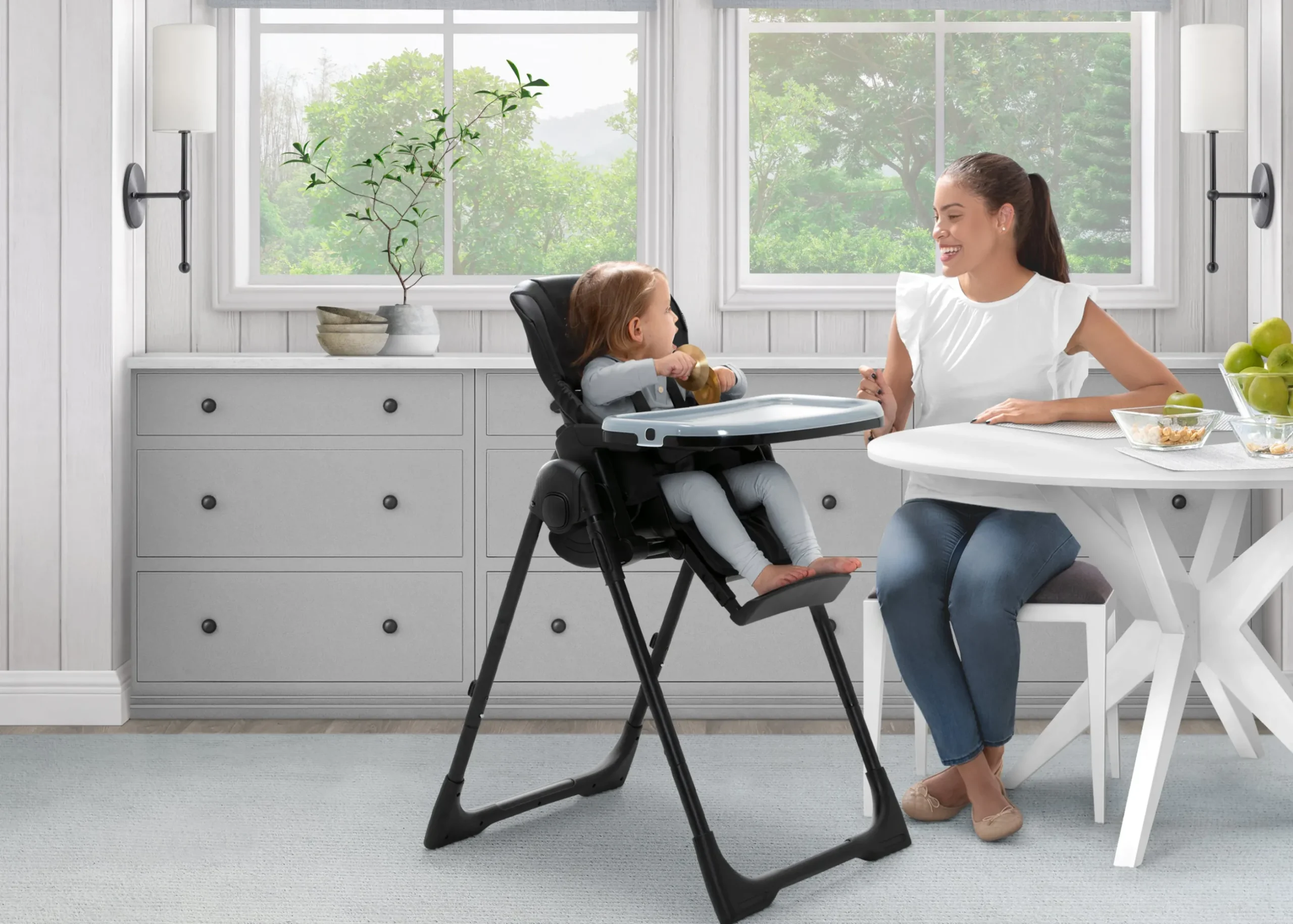 Dishwasher safe tray and water-repellent fabric make this high chair easy to clean