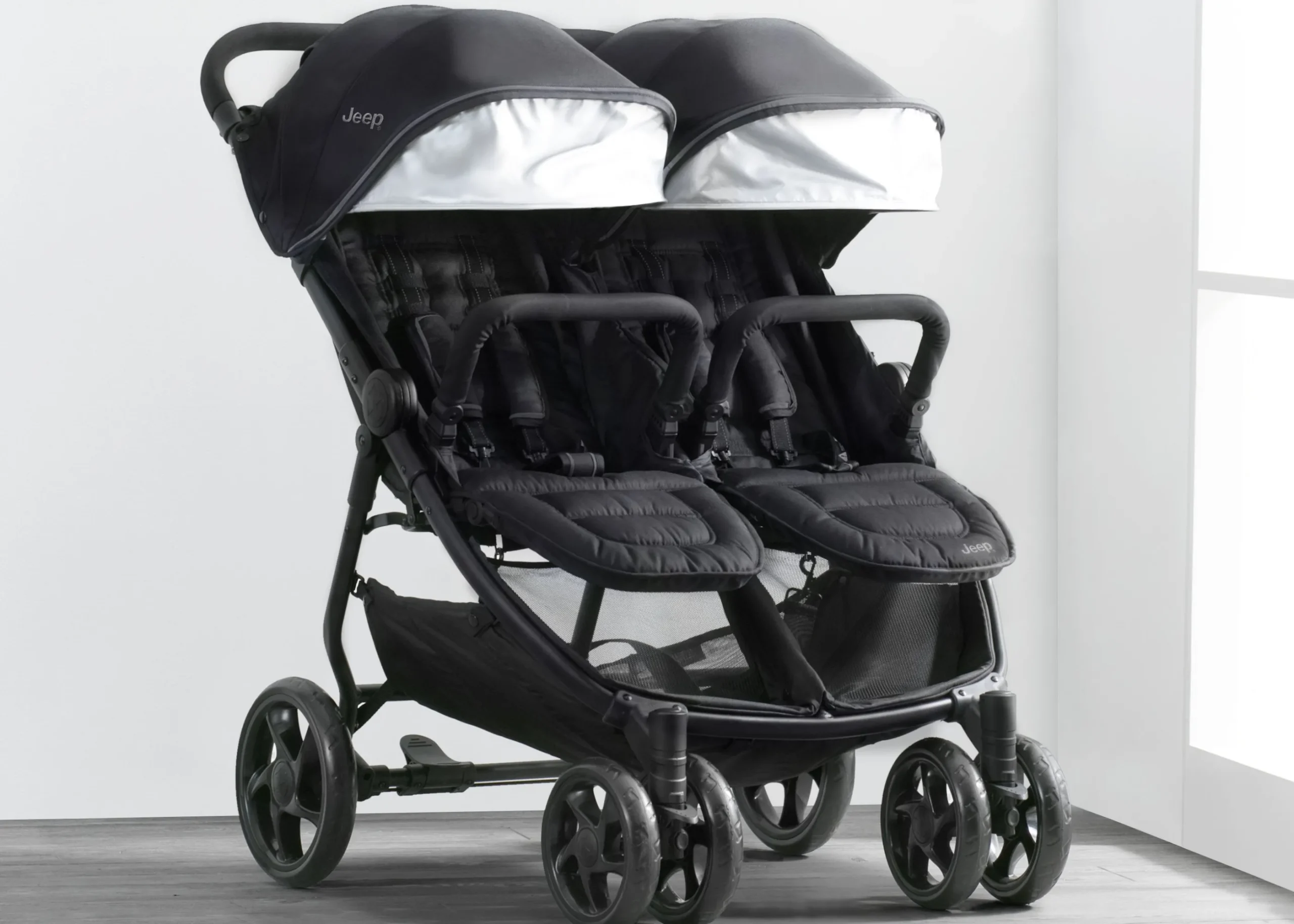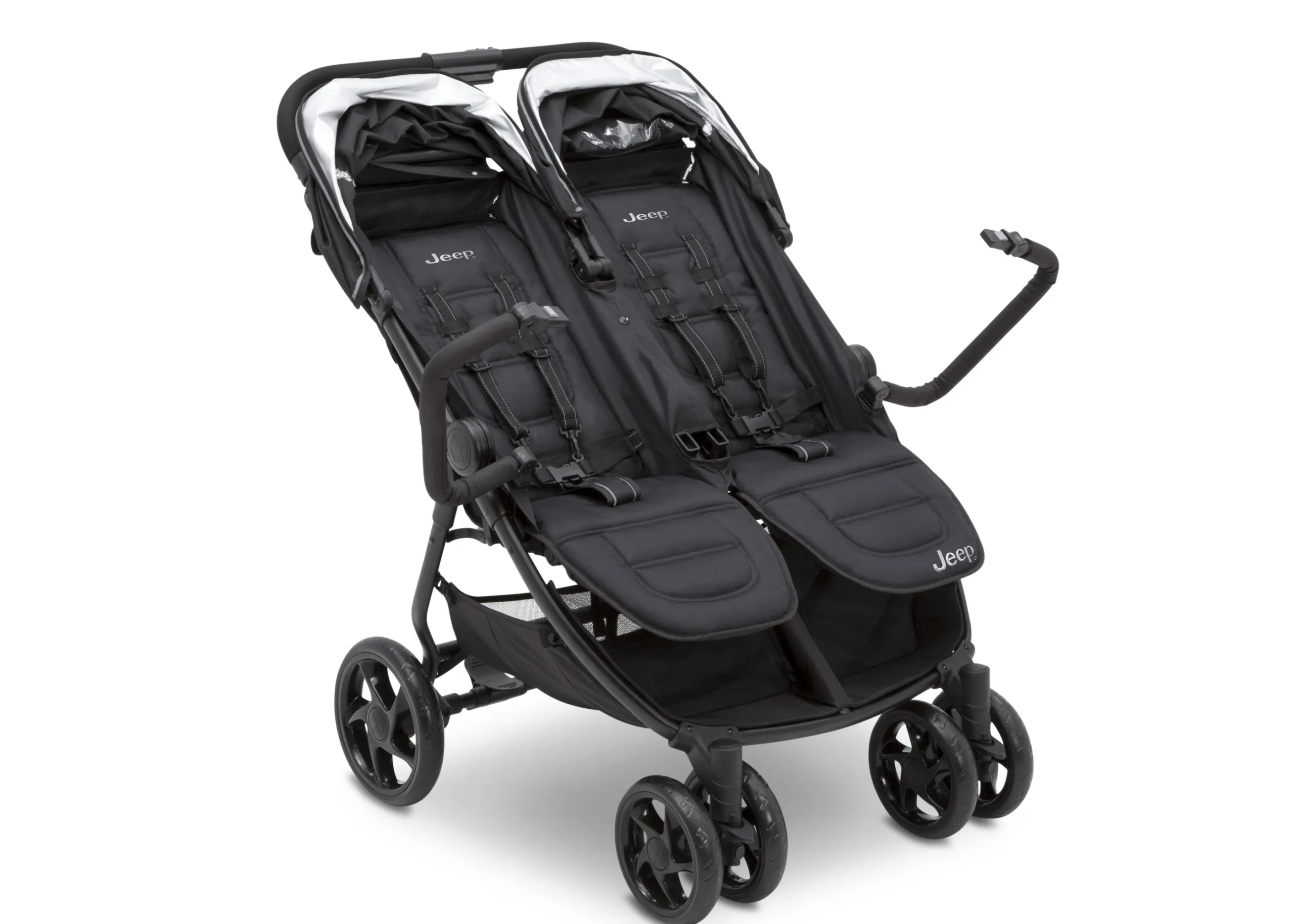 The Jeep Destination Ultralight Side x Side Double Stroller makes it easier than ever to go places, do things and see sights with your whole family. Loaded with features that make errands with multiple children a breeze, this double stroller offers independently reclining seats and foot rests to cater to each child’s needs and comfort. Two oversized canopies with extendable SPF 50 sun visors protect little ones from harsh rays, rain or snow while peek-a-boo windows allow you to keep an eye on your children as you walk. Large enough to be comfortable for two children, slim enough to fit through 30” doorways with ease, and sturdy enough to be your go-to everyday stroller, the Jeep Destination Ultralight Side x Side Double Stroller grants you the freedom to make every trip an adventure. Easily adapt to varying terrain with the stroller’s front swivel-lock wheels, unlock for easy maneuverability on even surfaces, and then lock for added stability on bumpy surfaces. And when you’re done exploring, this double stroller with an easy, compact fold closes in seconds and stands upright. The stroller’s lightweight aluminum frame, foam handles and carrying strap make loading it in the car or taking it on vacation a stress-free task.