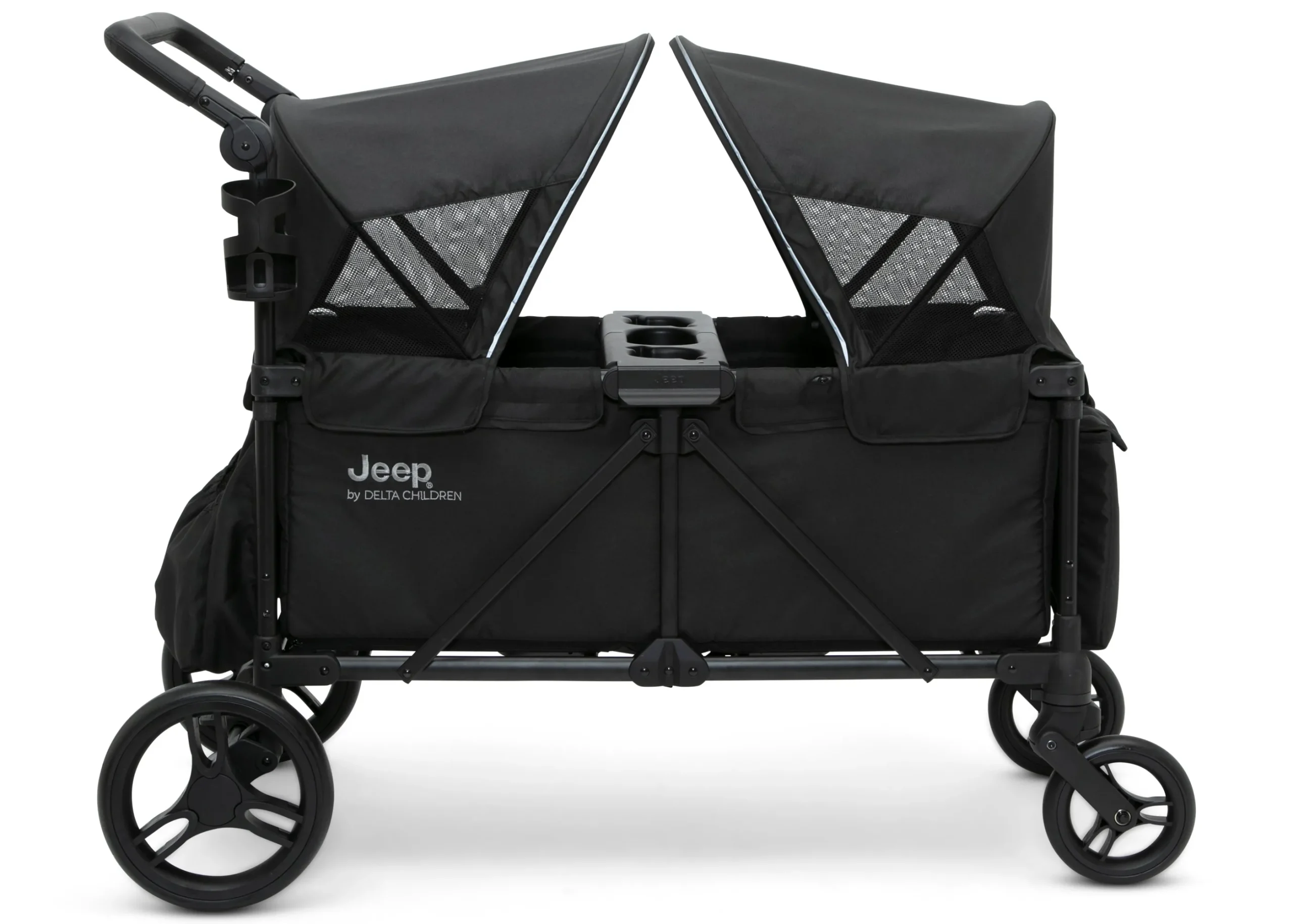 The Jeep Evolve Stroller Wagon by Delta Children will take you here, there and just about everywhere. A comfy option for siblings or friends, this versatile stroller wagon features two adjustable canopies with breathable mesh inserts for sun protection and increased airflow. With two kids safely in tow, the adjustable leatherette handlebar with five different positions gives you the ability to push or pull on your next adventure. Equipped with tons of storage inside and out, each wagon comes with an expandable bag, tons of pockets, parent cupholder and child’s tray with cup holders for snacks and drinks. Built to last, this wagon’s durable rust-resistant frame, puncture-proof tires and compact fold make it easy to stow or transport.More than a stroller wagon the Jeep Evolve Stroller Wagon by Delta Children makes it possible to create your own adventures with your family. Holds up to 100 lbs. (50 lbs. per seat). Weighs 30.5 lbs. Recommended for ages 9 months up to 50 lbs.Fits the following car seats (car seats and car seat adapter #A1970-001 sold separately): Graco SnugRide Click Connect 30, 35, 40 Evenflo Nurture Evenflo Embrace, Britax B-Safe 35, Chicco KeyFit 30.