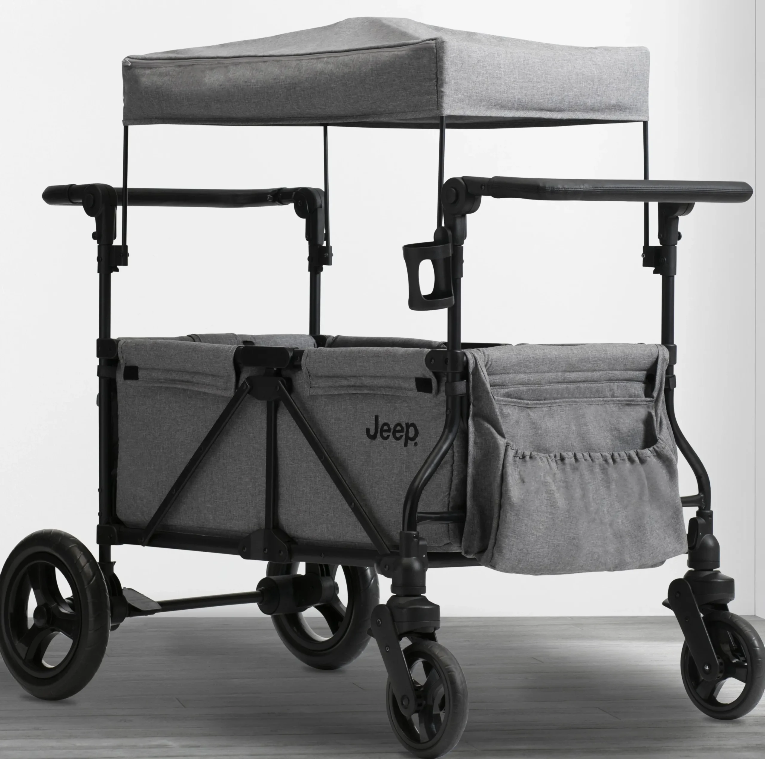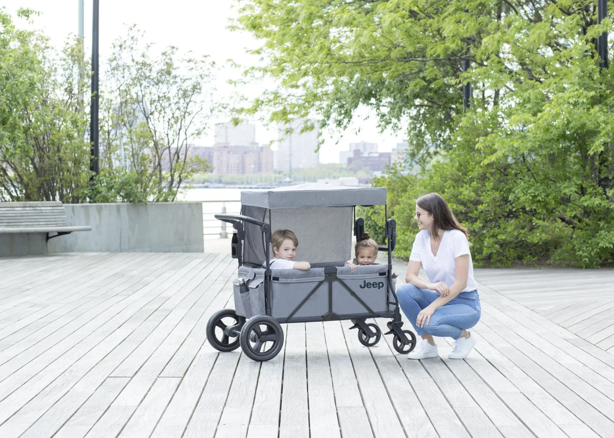 The Jeep Wrangler Stroller Wagon by Delta Children is ready to tackle any adventure. With so many ways to ride, it’s ideal for families with kids of varying ages. Attach your current infant car seat with the included adapter for babies or use the two seats with 5-point safety harnesses to securely transport older siblings, twins or friends.