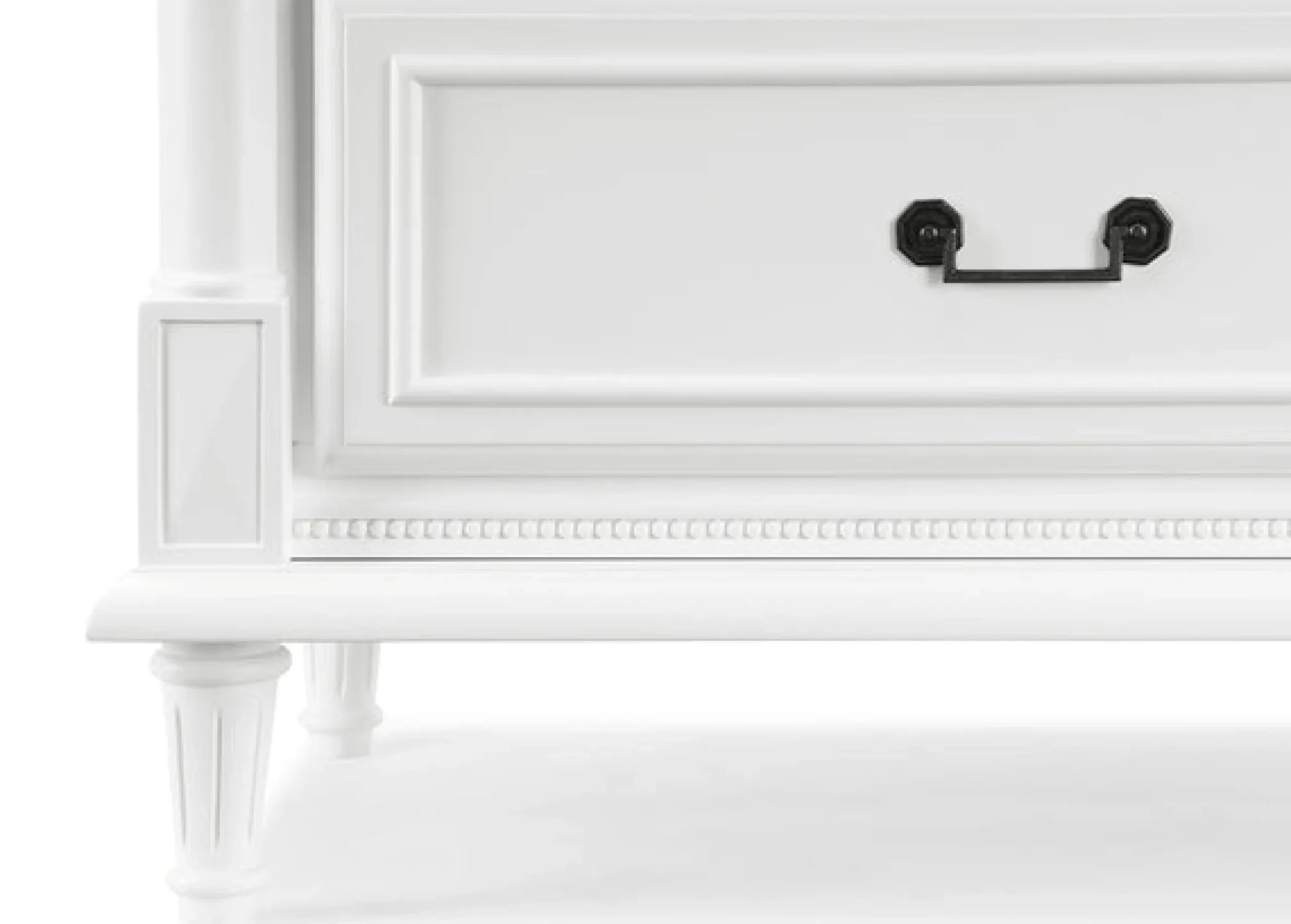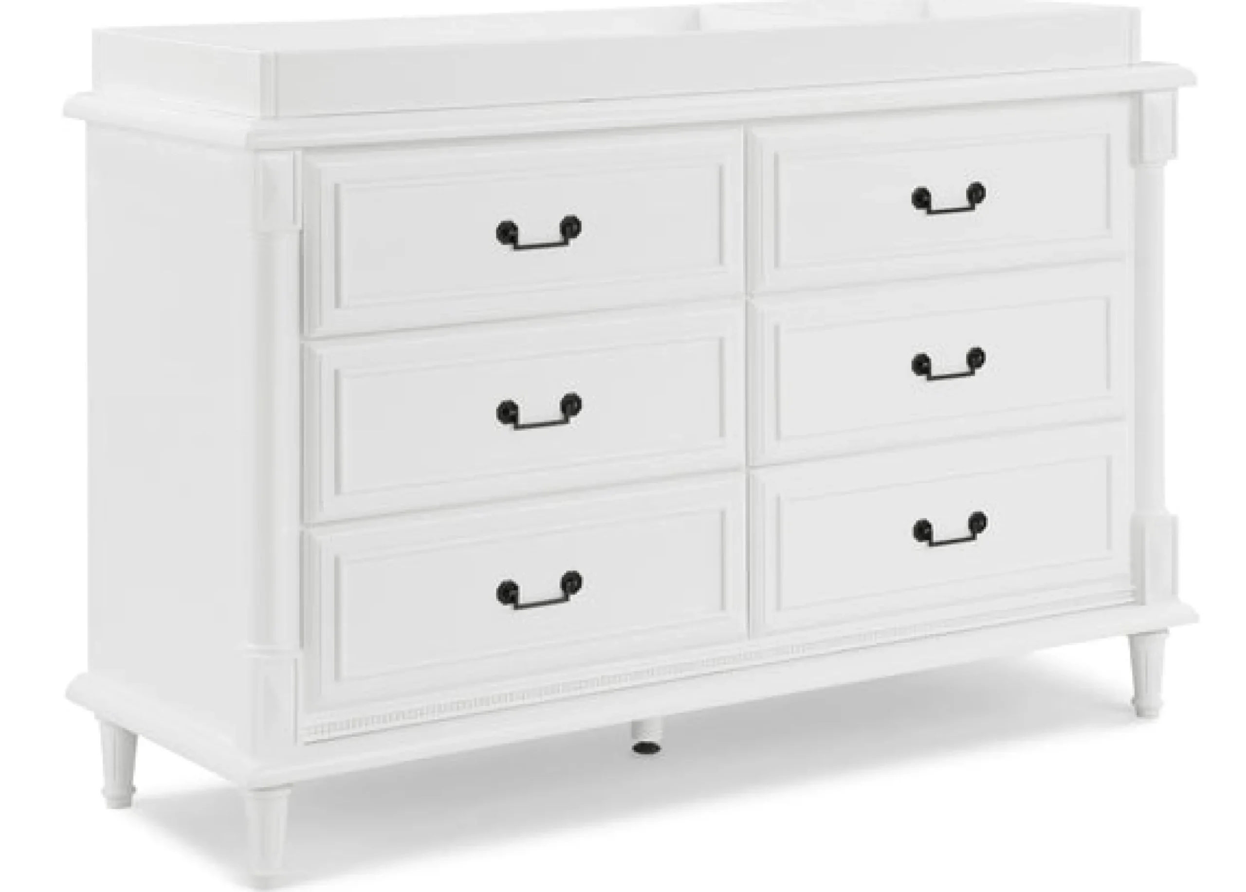 The Juliette 6 Drawer Dresser with Changing Top and Interlocking Drawers by Simmons Kids is an elegant and functional addition to the nursery, kids’ bedroom, even your master bedroom. The timelessness of this dresser is found in the details—the elegant molding on drawer fronts, fluted legs with intricate carvings and antique brass drawer pulls elevate any bedroom. It features six spacious drawers for ample clothing storage and includes a removable changing top that creates the perfect space for diaper changing. Remove the changing top to create a more grown-up space later on. For your child’s safety, this dresser is outfitted with an interlocking drawer system that limits the number of drawers that can be opened at one time. Plus, it’s GREENGUARD Gold Certified, which means it’s built to contribute to cleaner air for a healthy home. To complete your nursery, pair with the coordinating Juliette 6-in-1 Convertible Crib by Simmons Kids.This Simmons Kids dresser is tested to meet the current requirements of ASTM F2057, the mandatory CPSC safety standard that protects young children from furniture tip-over incidents. For your children’s safety, only purchase dressers that comply with this standard. For additional security, Simmons Kids strongly recommends that all dressers in your home be anchored; all Simmons Kids dressers include a wall anchor. To learn how to properly secure your dresser, please see the product assembly instructions or visit our website.