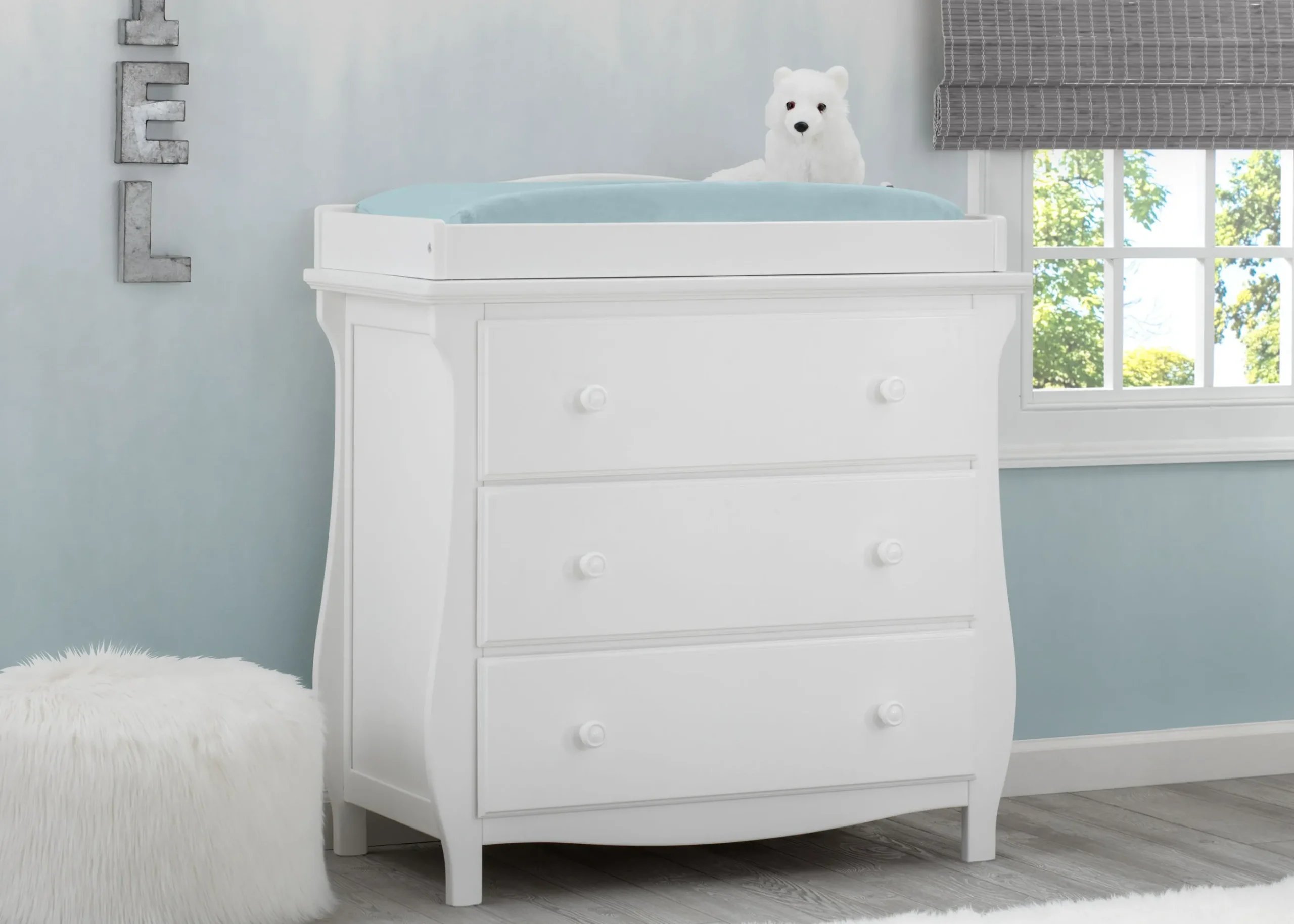 Elegant silhouette, graceful accents, functional design: these elements come together to create the Lancaster 3 Drawer Dresser with Changing Top and Interlocking Drawers by Delta Children. Both polished and inviting, this versatile dresser will accommodate all your child’s storage and changing needs. The removable changing topper makes it easy to use the dresser as a changing table, and when your child outgrows the need for a changer, simply remove the topper. The dresser’s sleigh-style silhouette and swooping apron add charm. A smart choice for storage in any space, this dresser is outfitted with an interlocking drawer system that limits the number of drawers that can be opened at one time. Available in Grey, Bianca White and Dark Chocolate. Coordinates with other items in the Lancaster Collection from Delta Children.This Delta Children dresser is tested to meet the current requirements of ASTM F2057, the mandatory CPSC safety standard that protects young children from furniture tip-over incidents. For your children’s safety, only purchase dressers that comply with this standard. For additional security, Delta Children strongly recommends that all dressers in your home be anchored; all Delta dressers include a wall anchor. To learn how to properly secure your dresser, please see the product assembly instructions or visit our website.