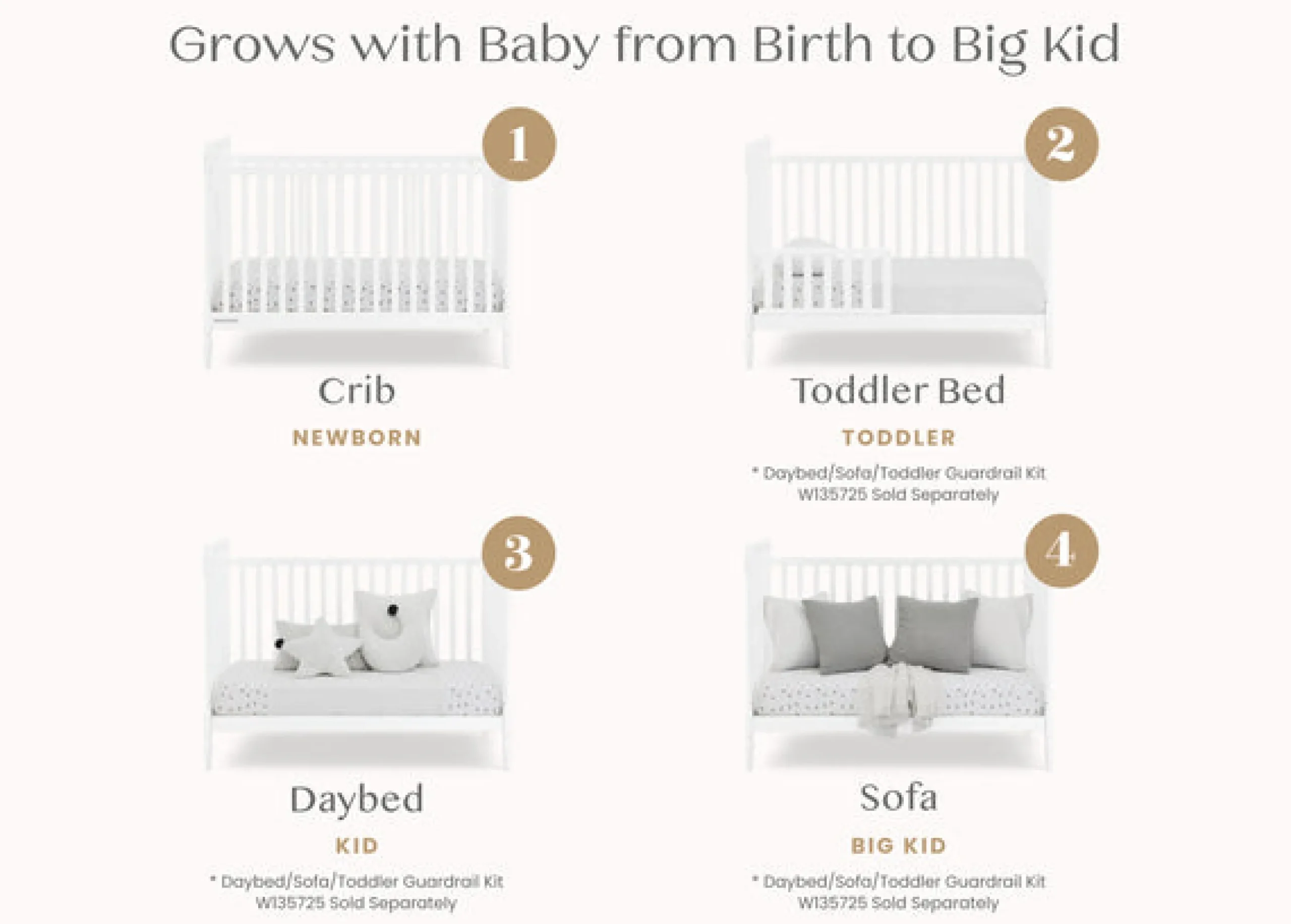 - Crib converts to a toddler bed, daybed and sofa (Daybed/Toddler Guardrail Kit #W135725 sold separately)