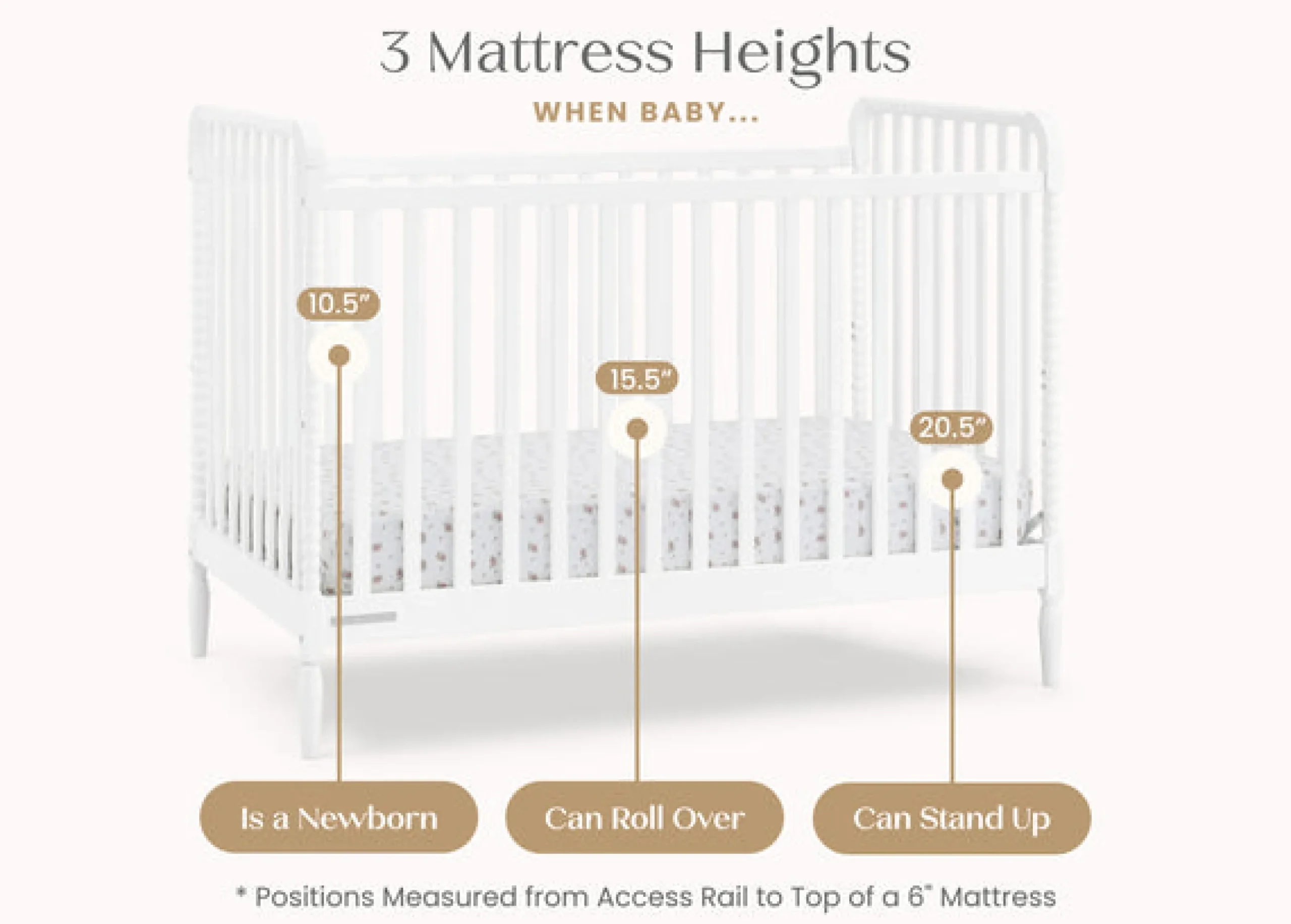 - Adjustable height mattress support with 3 convenient positions to grow with your baby