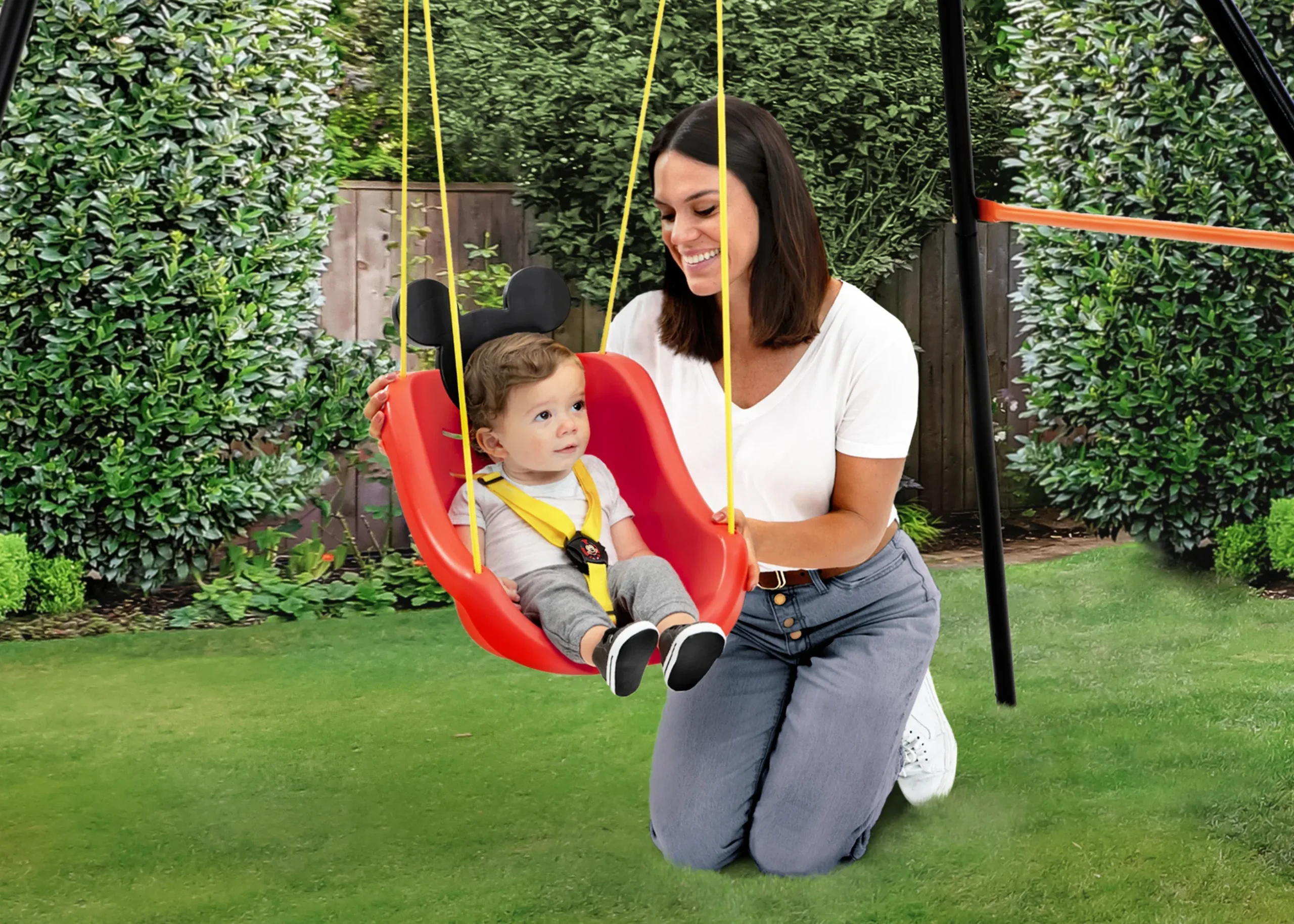 Good times will be in full swing when you get your little one this Mickey Mouse 2-in-1 Outdoor Swing by Delta Children! The swing’s comfortable bucket seat and high back provides support while the three-point safety harness ensures your child stays securely in place—the harness can be removed as your child grows. A three-dimensional accent of Mickey’s iconic silhouette at the top of the swing adds a ton of character. Made from durable, weather-resistant plastic, it will withstand the elements for many years. Plus, this fun swing comes with everything you need to attach it to your existing play structure, the included rope measures 36-inches from the top of the swing. Ideal for children ages 9-48 months.