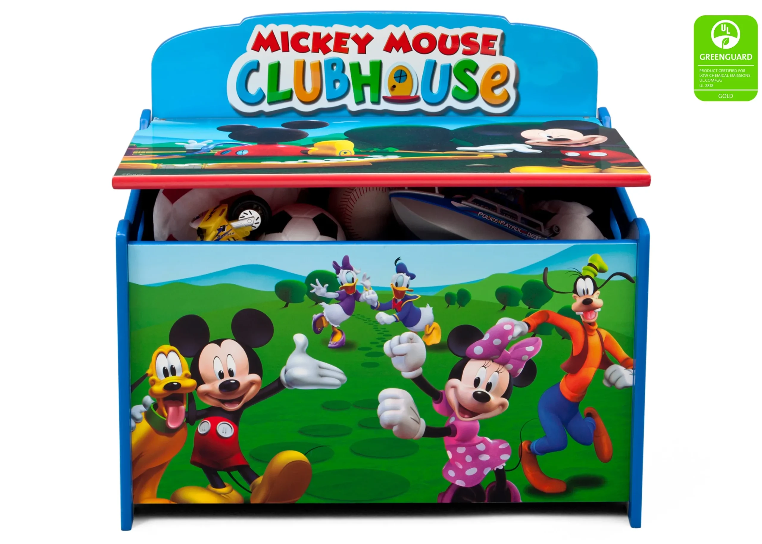 - Scratch-resistant finish protects the toy box’s colorful graphics